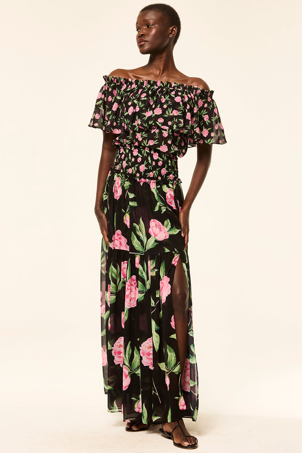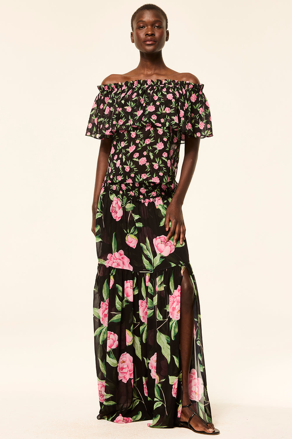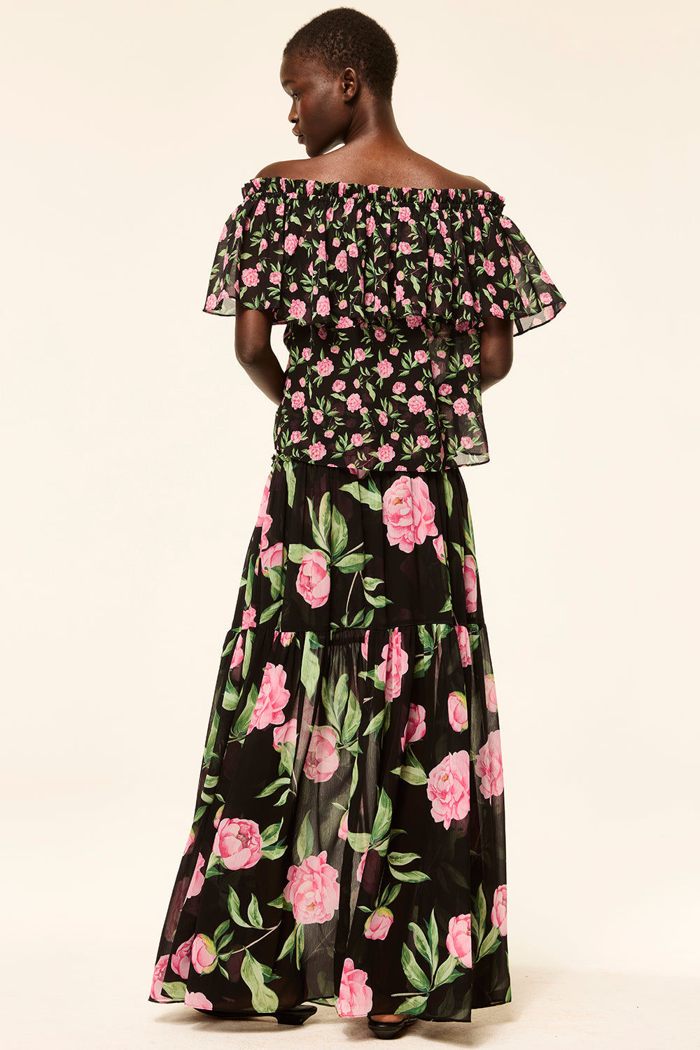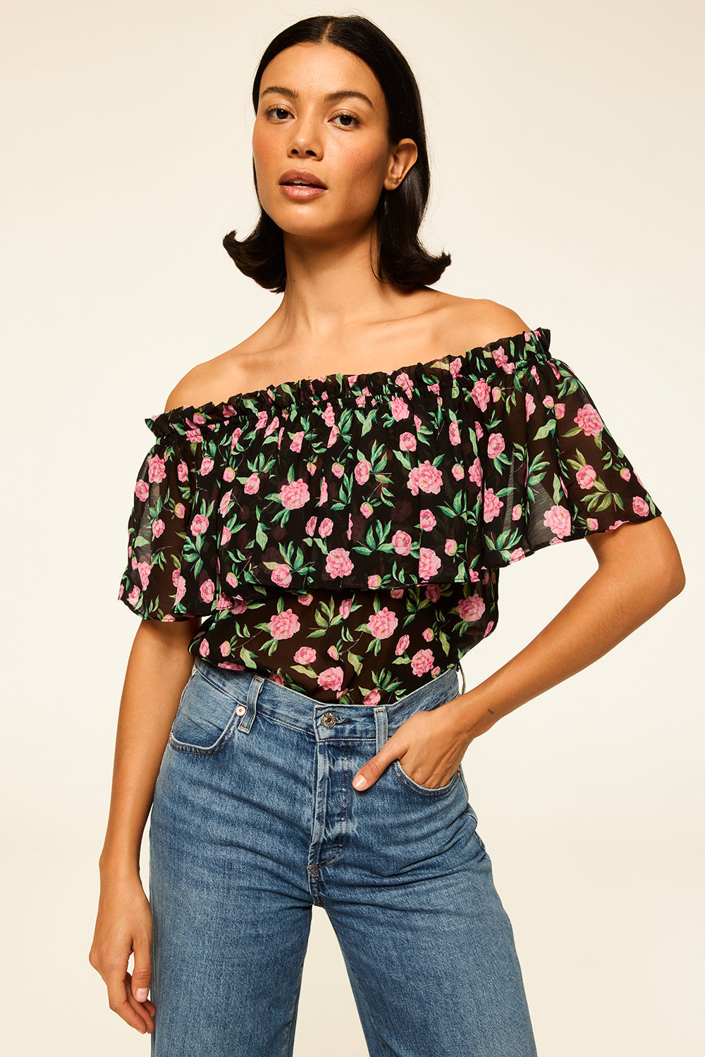 Adah is an easy off-the-shoulder silhouette cut from our lovely Pink Peony print on black ground. A wide ruffle across the chest with a double lined loose body. Pair with the coordinating Polly skirt or with your favorite pair of jeans.