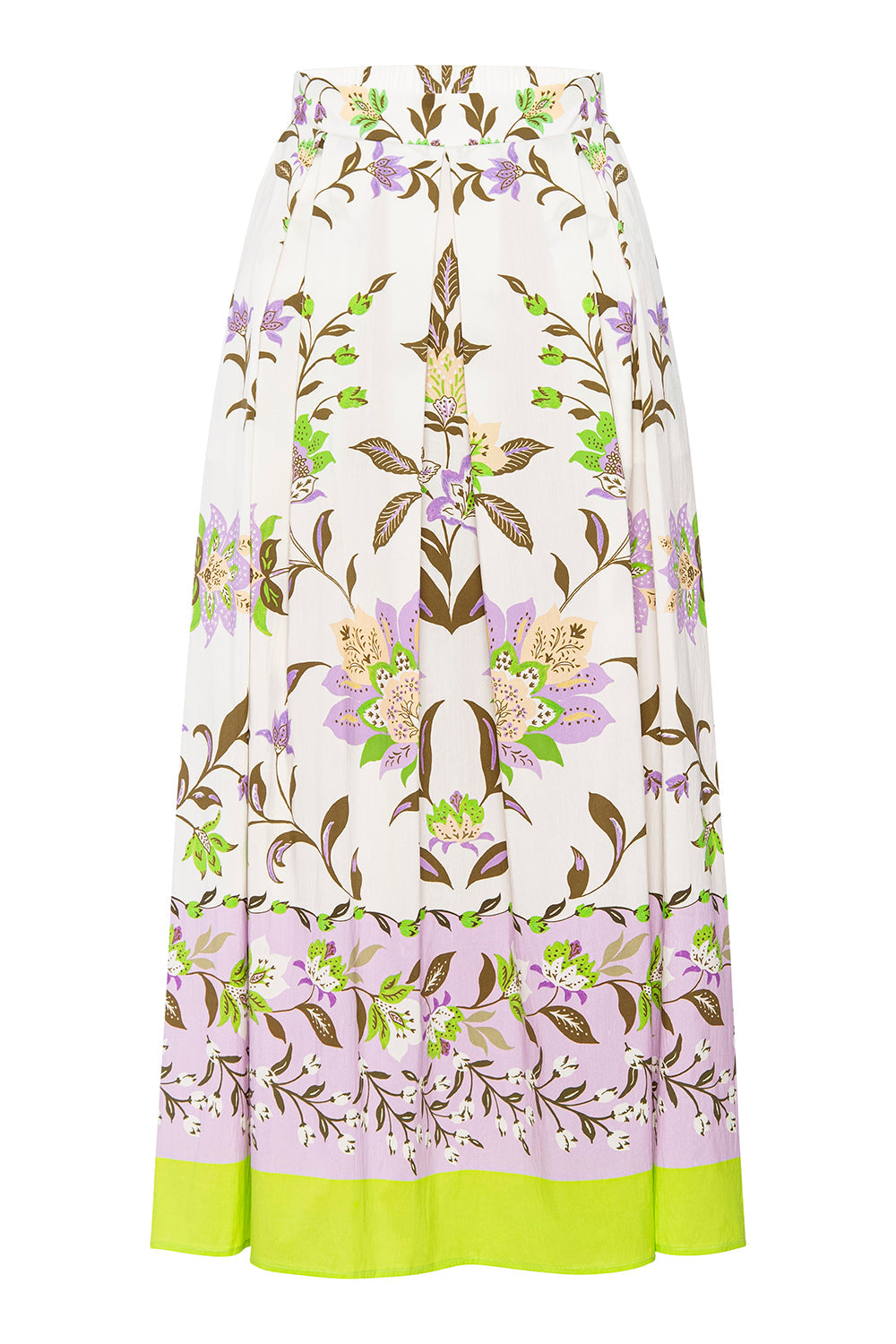 Our new Aggie skirt is a feminine midi cut from our lovely Secret Garden cotton blend. A banded waist with hidden side zip leads into loose box pleats. The hem is finished off in a contrast fluorescent green. Pair with the coordinating Lois and Amari tops for the perfect springtime set.