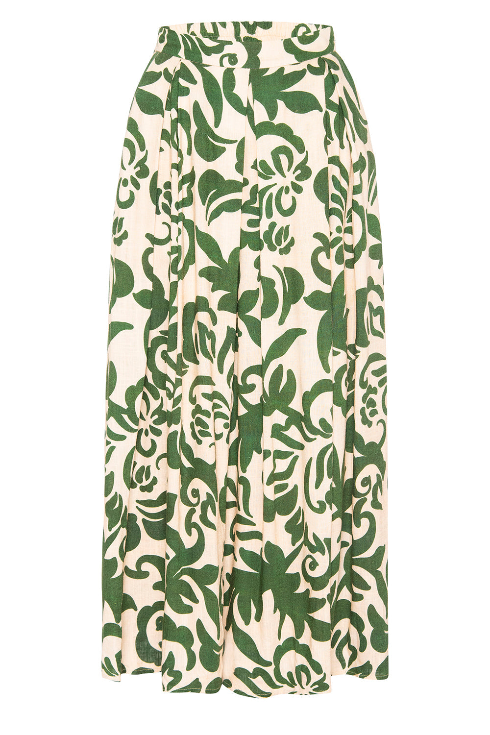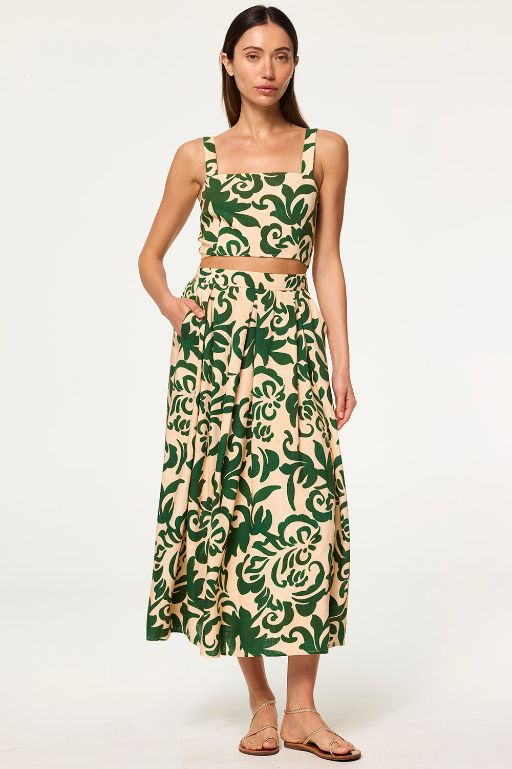 Aggie is a chic midi length skirt cut from a Tonal Cactus printed linen blend. Featuring structured pleats and a banded waist with side slit pockets and a hidden side zip closure. Complete the set with the coordinating Lois top or dress down with an easy cropped tee and flats.