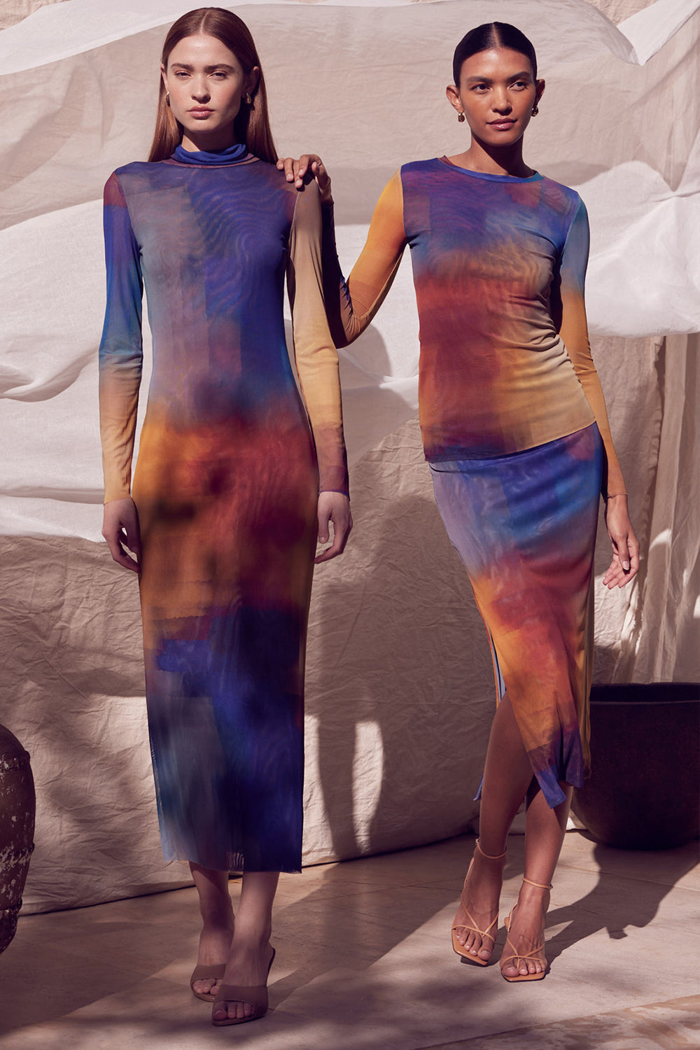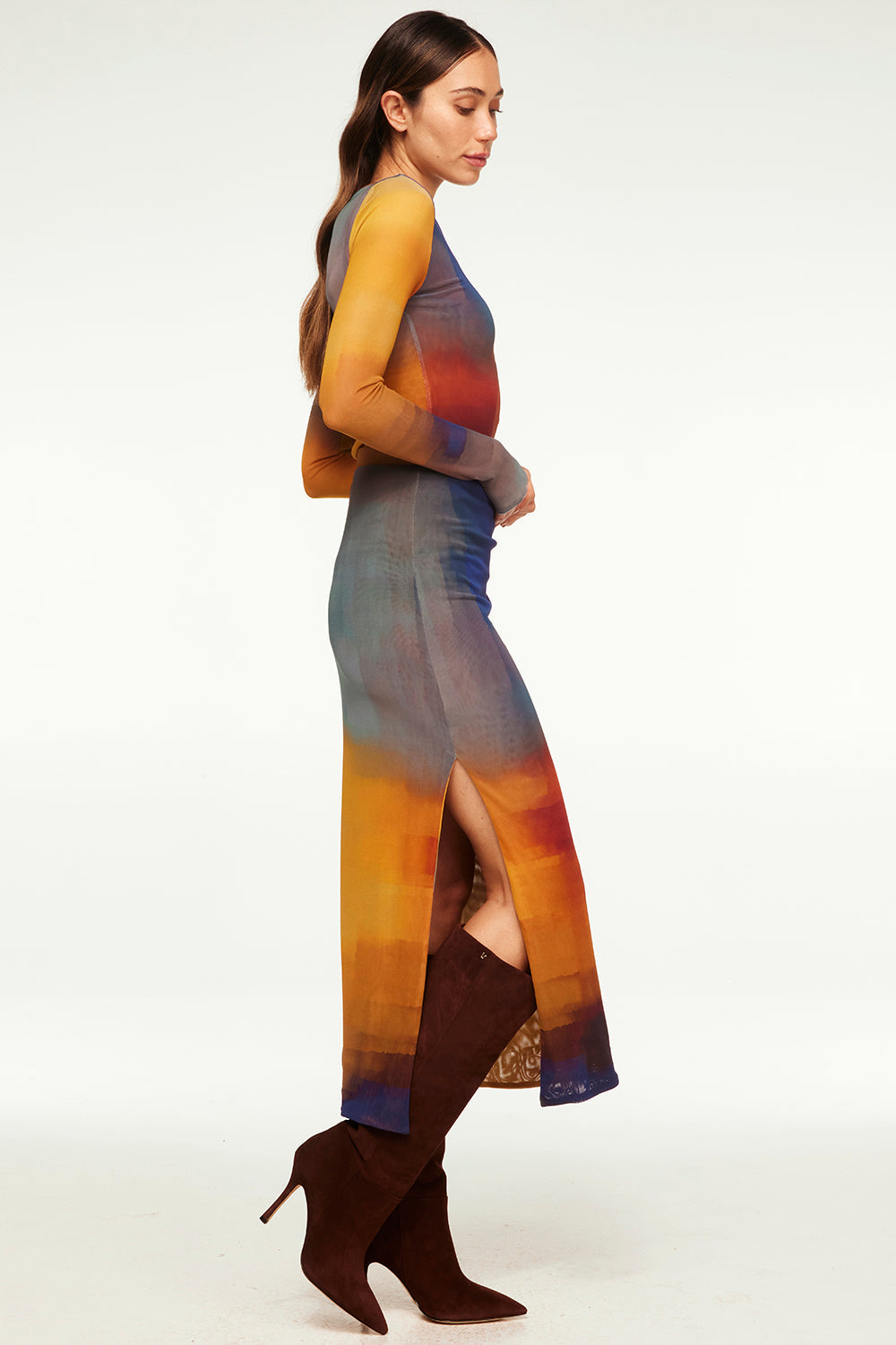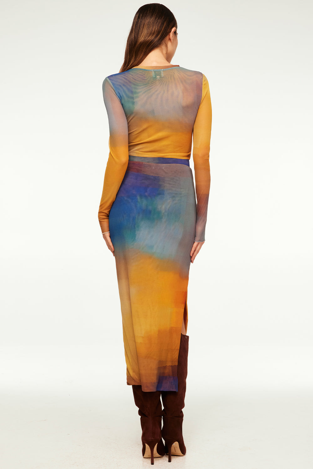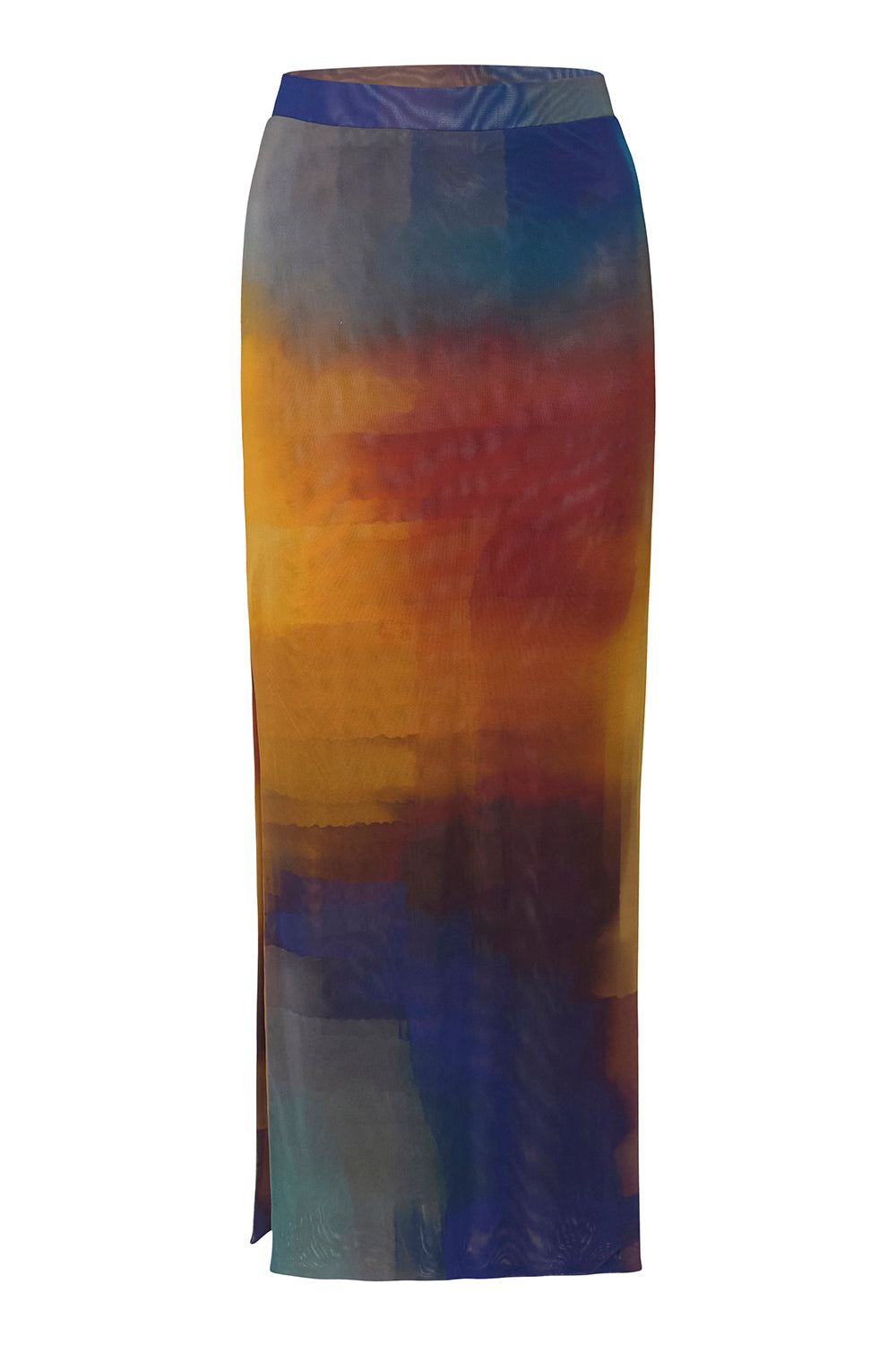 Aisha is a fitted pencil midi skirt cut from a vibrant multi-colored ombré in a stretch mesh fabric. This pull-on style is double lined and features an elastic waist with a daring side slit. Slightly sheer. Pair with the coordinating Lula top for chic set.