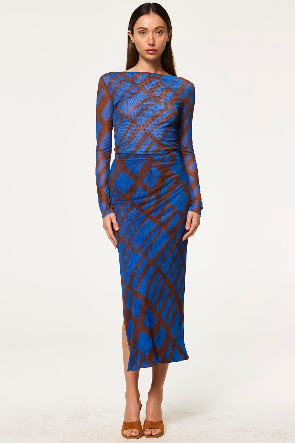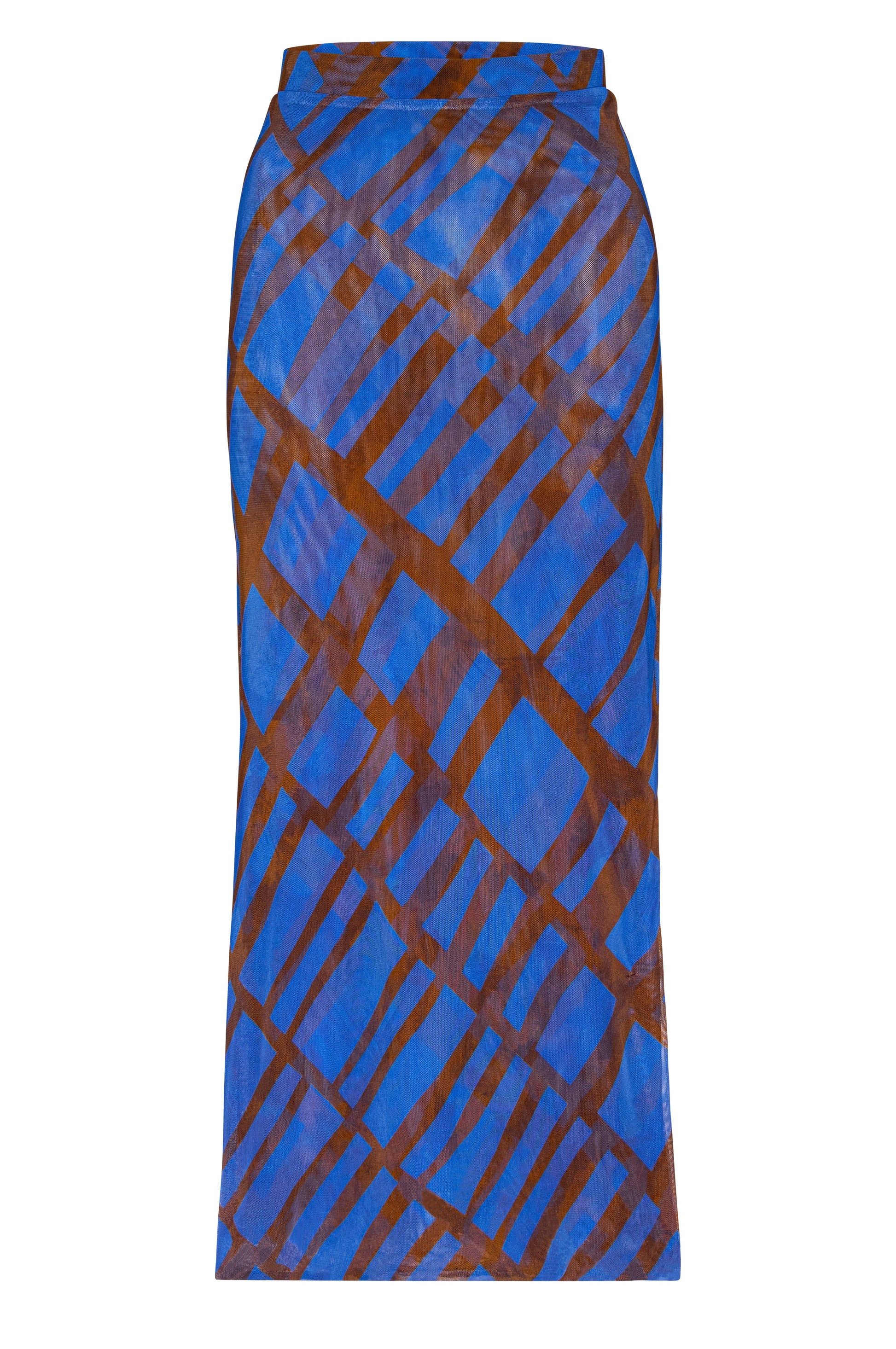 Aisha is a fitted pencil midi skirt cut from a striking brown and blue Matrix stretch mesh. This pull-on silhouette is double lined for comfort, with an elastic waist and a daring side slit that shows just enough skin. Slightly sheer, this skirt pairs effortlessly with the coordinating Lira top for a chic, statement-making set.