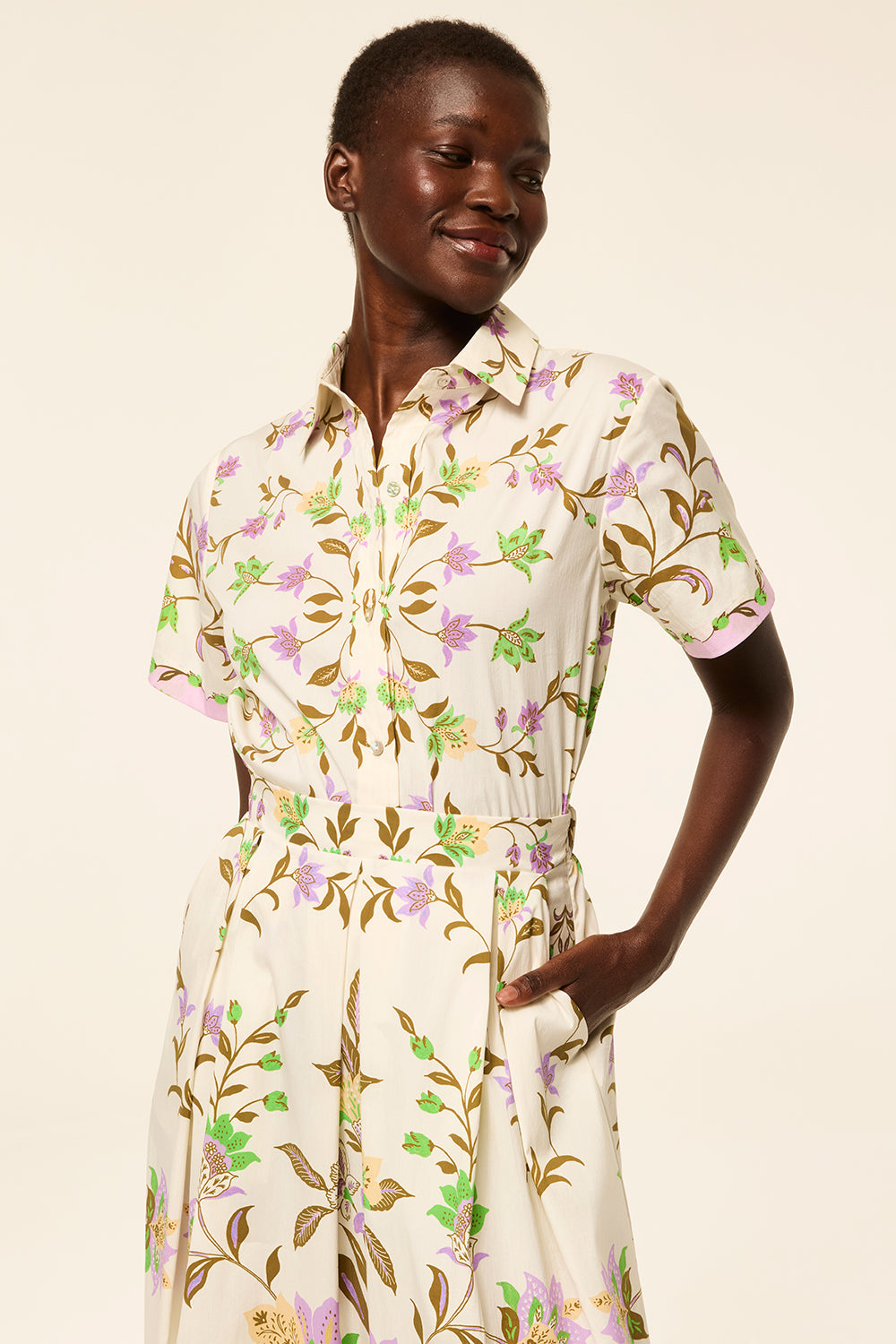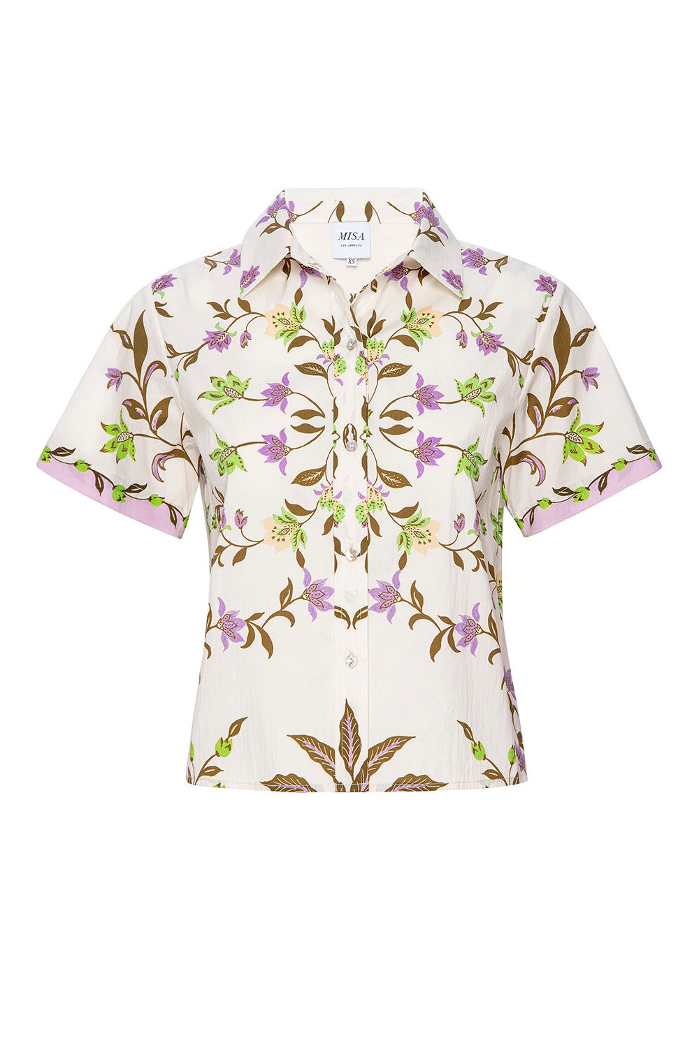 Amari is an easy cotton blend button front top in our Secret Garden print. Fold-over collar and button front with short sleeves. Pair with the coordinating Aggie skirt for a spring-ready set.