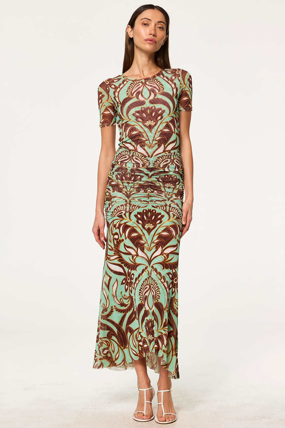 The Amor top is a soon-to-be favorite, cut from our Brown Vintage Botanical mesh with a striking mint ground. This fitted short-sleeve silhouette features a high neckline and double lining for a smooth finish. Effortlessly versatile—pair it with jeans for everyday ease or the coordinating Ollie skirt for your next event.