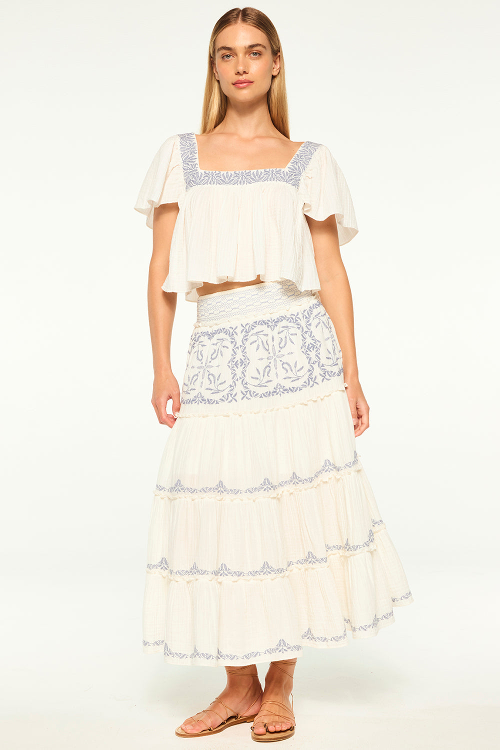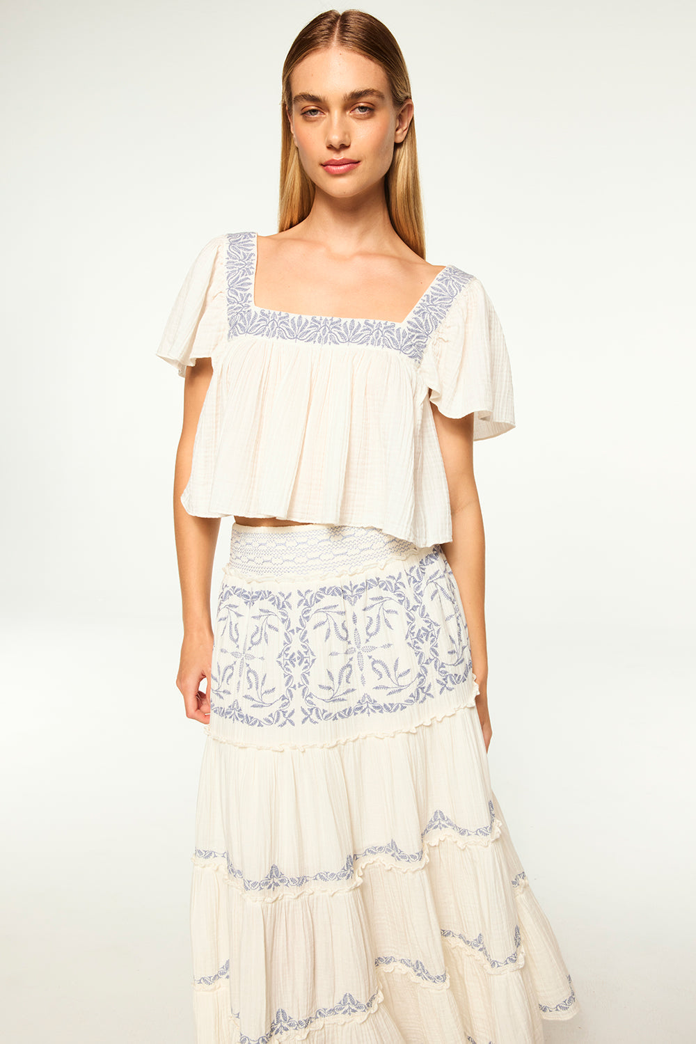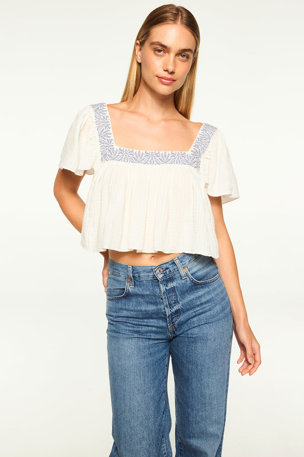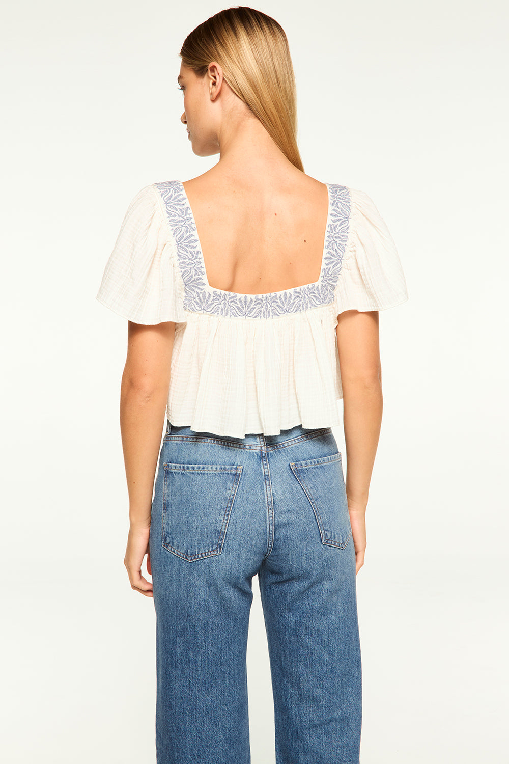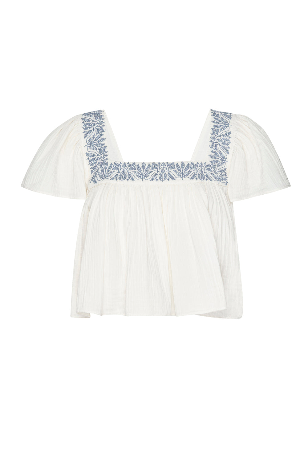Anju is a breezy cropped cotton gauze top, perfect for your next warm-weather getaway and the seasons ahead. Featuring a flattering square neckline and back with blue embroidery. Short flutter sleeves. Pair with everything from jeans to the coordinating Lahar skirt.