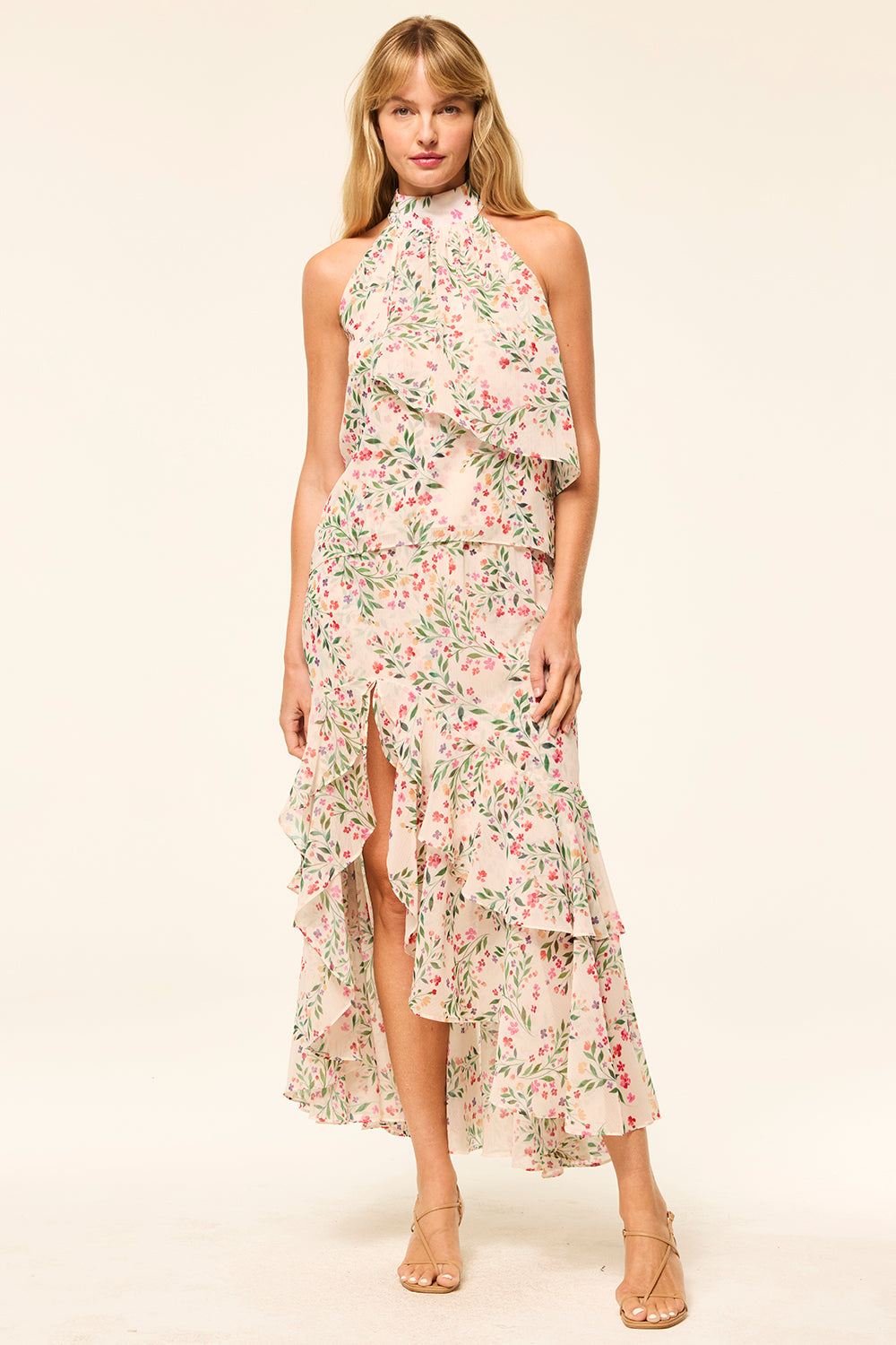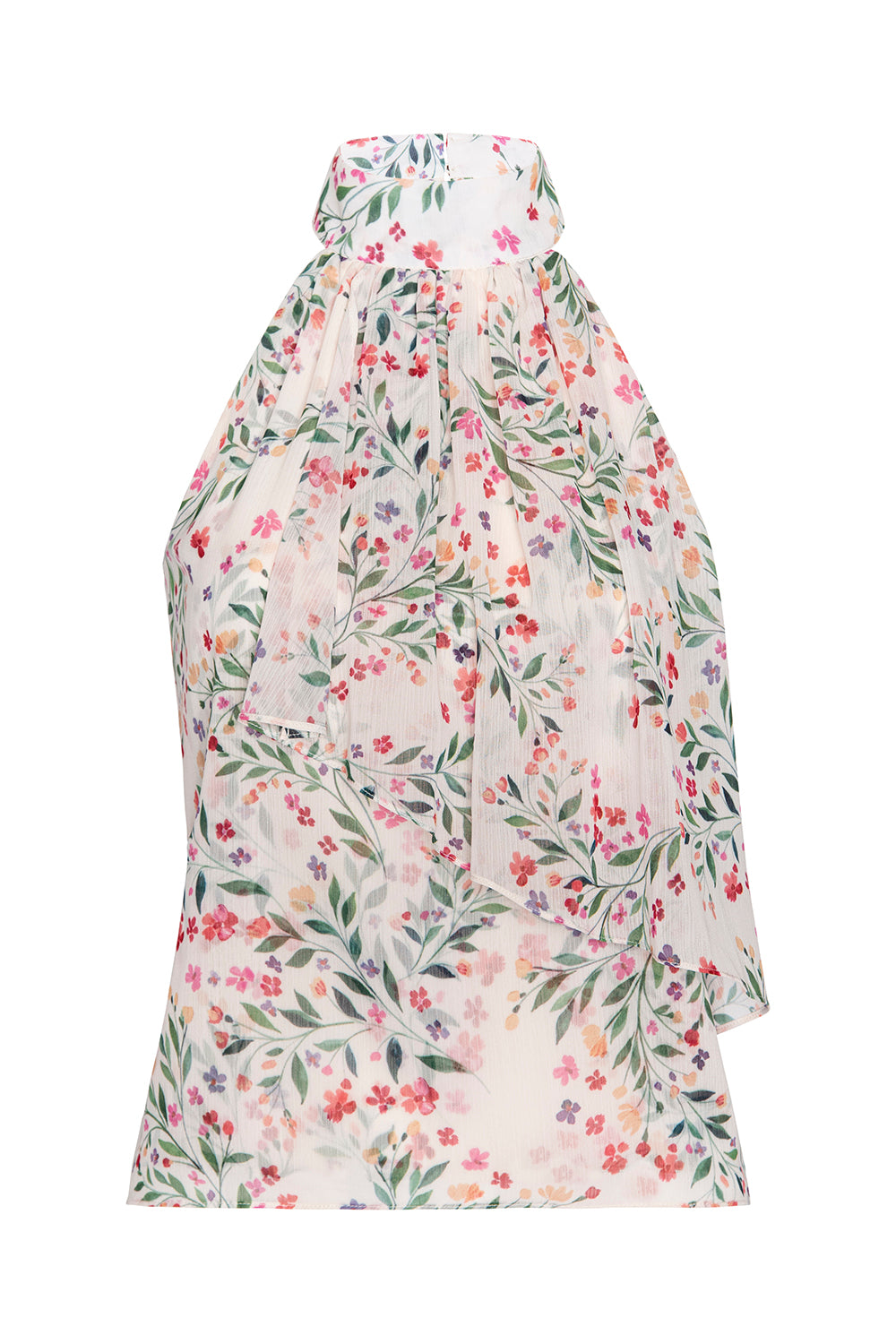 Our Anka top is cut in chic layers of our Spring Ditsy chiffon. This sleeveless halter top features a high neckline with back button closure. An effortless and feminine blouse to pair back to the coordinating Seva skirt for a chic set or dress down with denim.