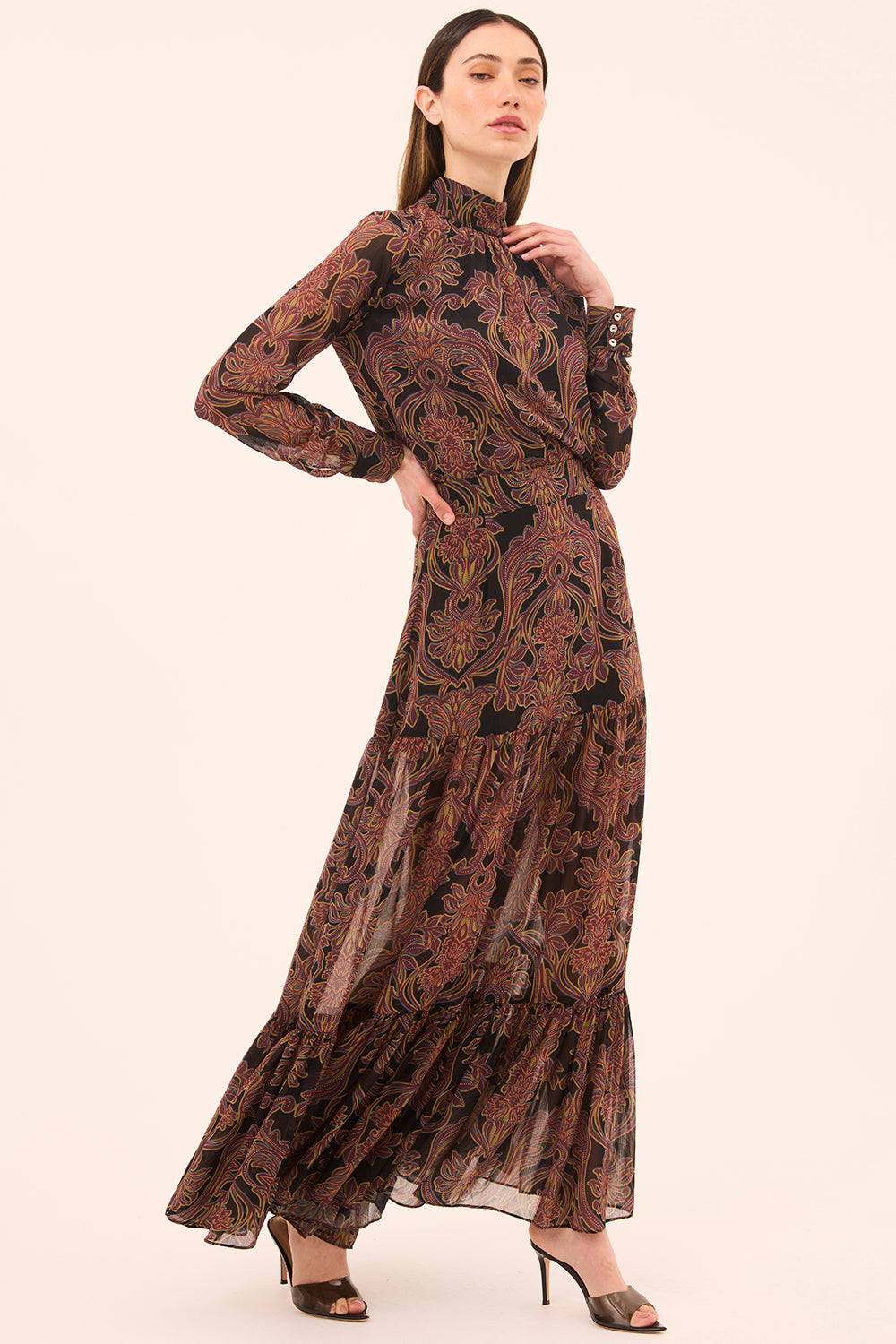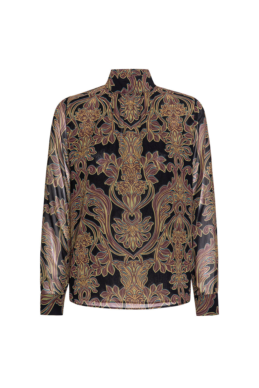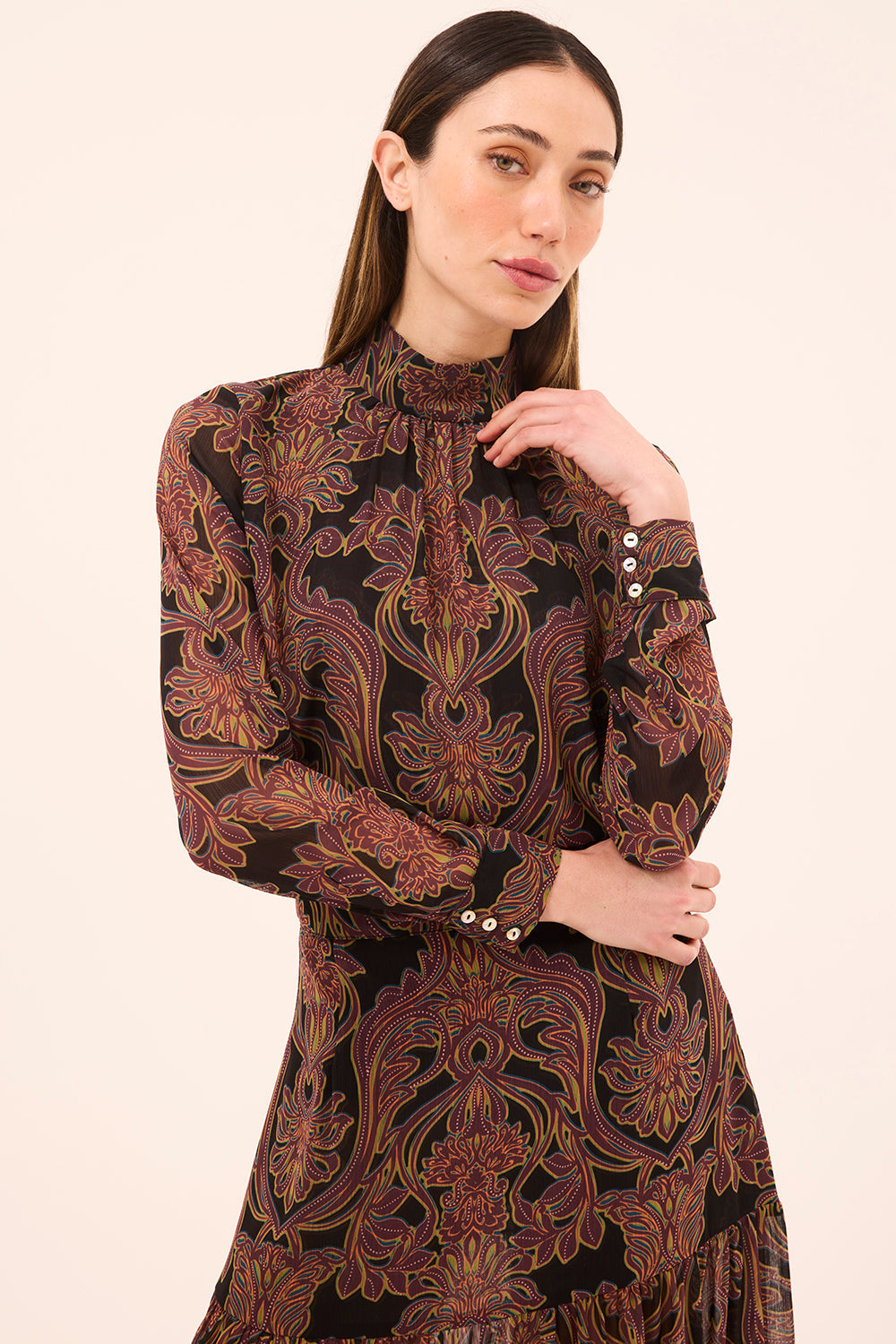 The Annie blouse is cut from fall-ready Studded Flora chiffon and features a high mock neckline with a delicate single-button back closure. Double-lined through the body for coverage, it’s finished with long semi-sheer sleeves and elegant triple pearlized button cuffs. Pair with the matching Mavi skirt for a coordinated look, or style with denim for an elevated everyday outfit.