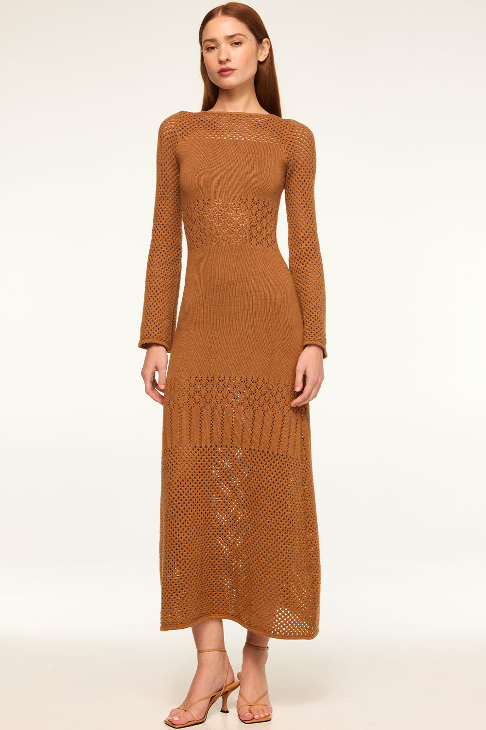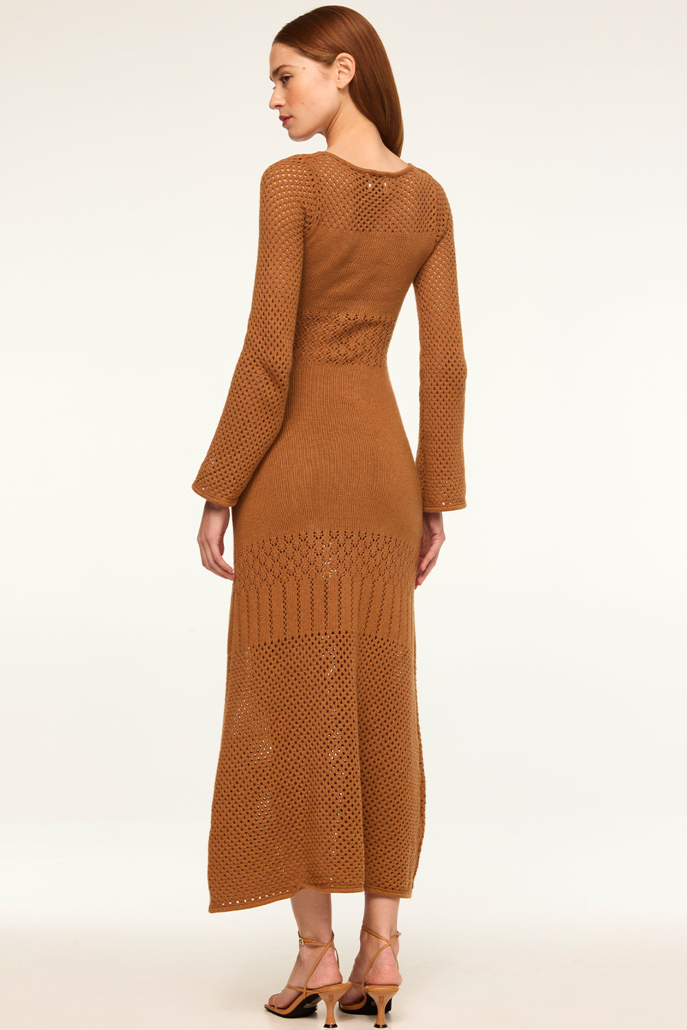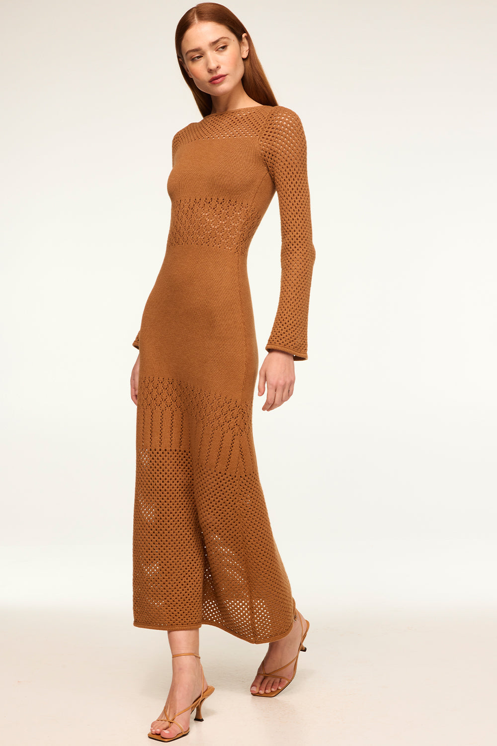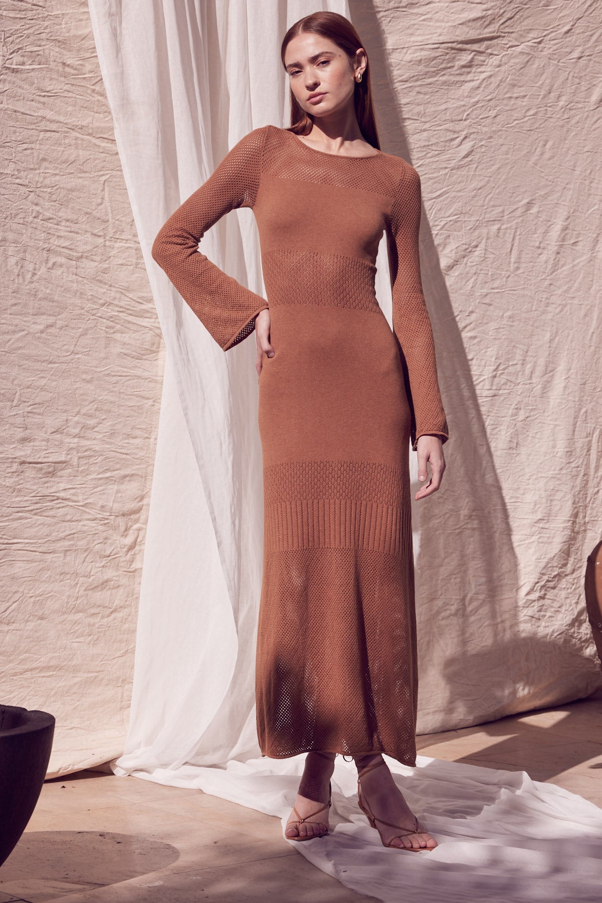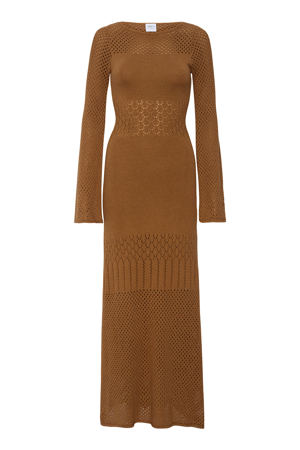 The Anu maxi knit dress is woven from the softest camel colored cotton cashmere blend. This figure-hugging long sleeve silhouette features a high neckline with openwork crochet that leads into a solid body followed by the same bands of openwork crochet with a rolled hem. A variation of our popular Irene silhouette without the open back.