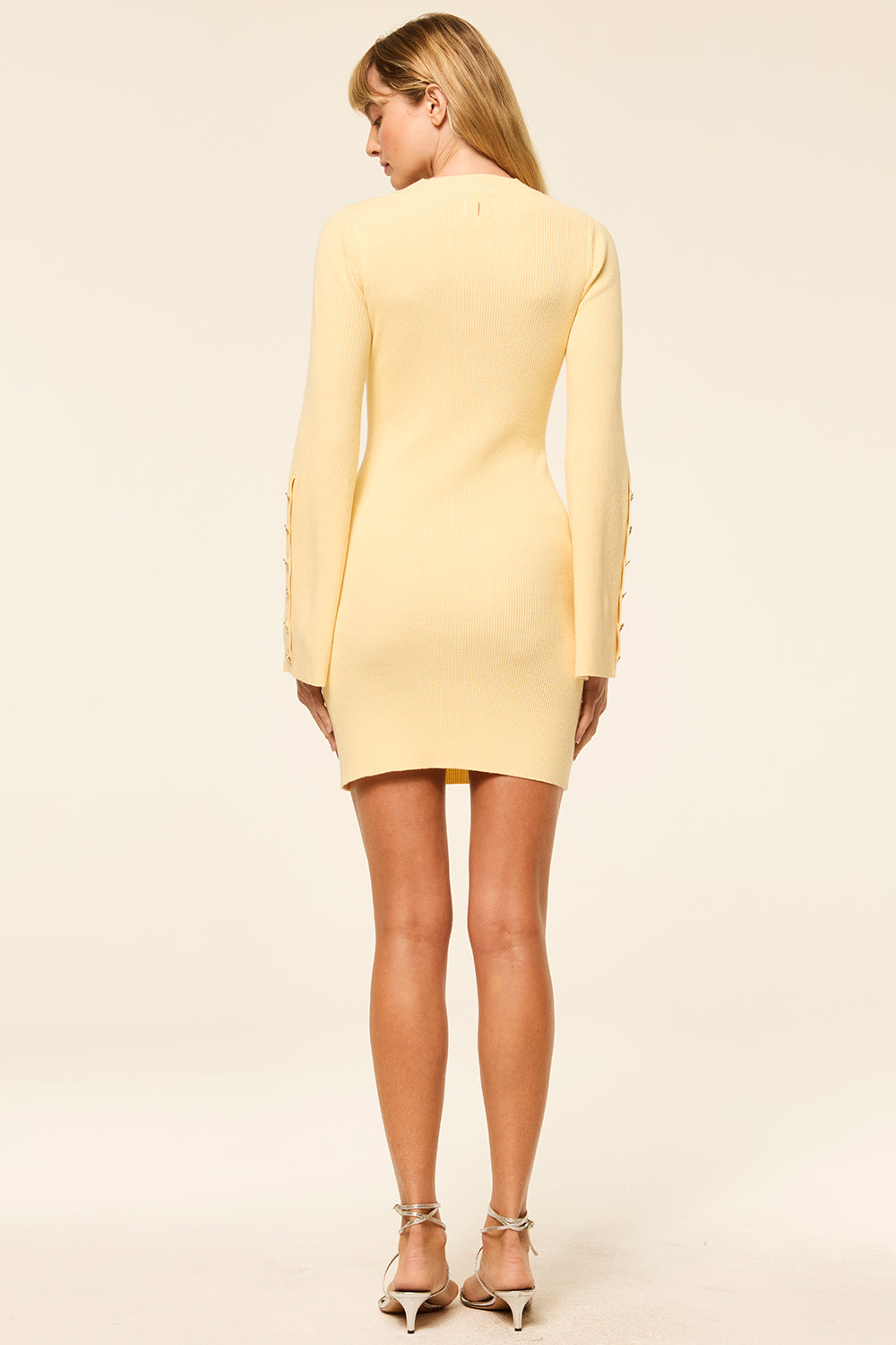 Arila is a figure-hugging, fine rib-knit mini dress in this season's must-have butter yellow. Long bell sleeves are accented with large silver buttons along the forearm that can be unbuttoned for a a chic look. A high crew neckline and side slit with the same silver buttons can also be opened to reveal more leg.