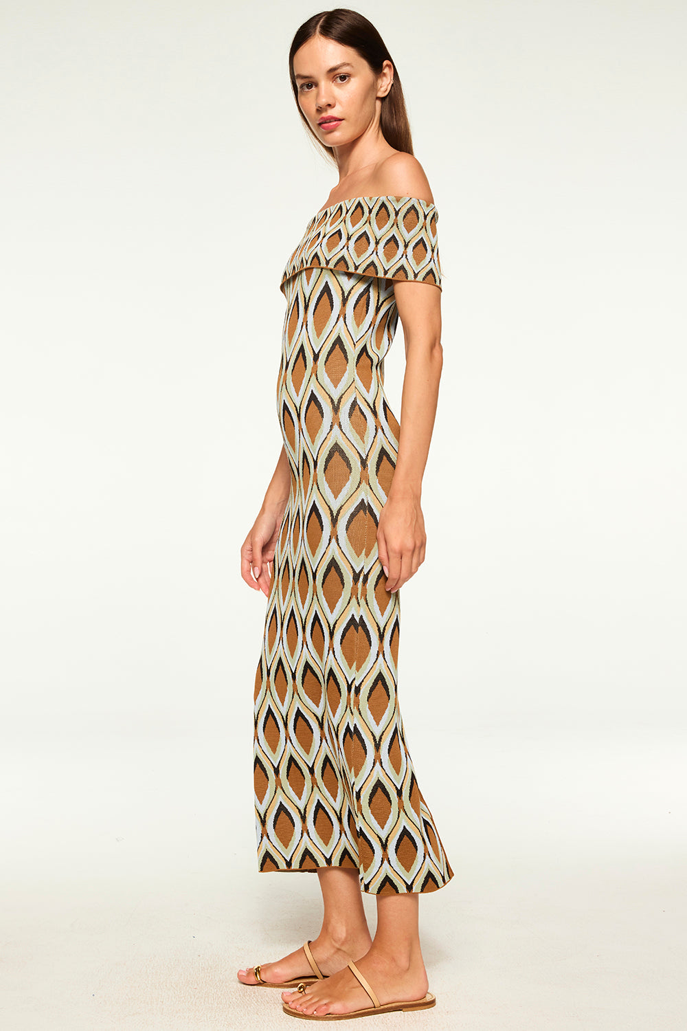 Avi is our newest knit midi dress. This figure-hugging, off-shoulder silhouette is in a brown printed knit jacquard. Fold-over band across the chest leads into a fitted skirt with a back slit.