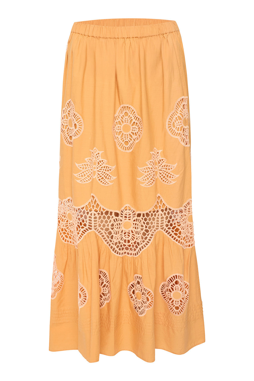 Ayana is a breezy maxi length skirt cut from a vibrant apricot cotton. Featuring gorgeous lace embroidered details throughout and a wide ruffle hem. The skirt is partially lined with an elasticated waist. Pair with the coordinating Nola top for a feminine spring set.