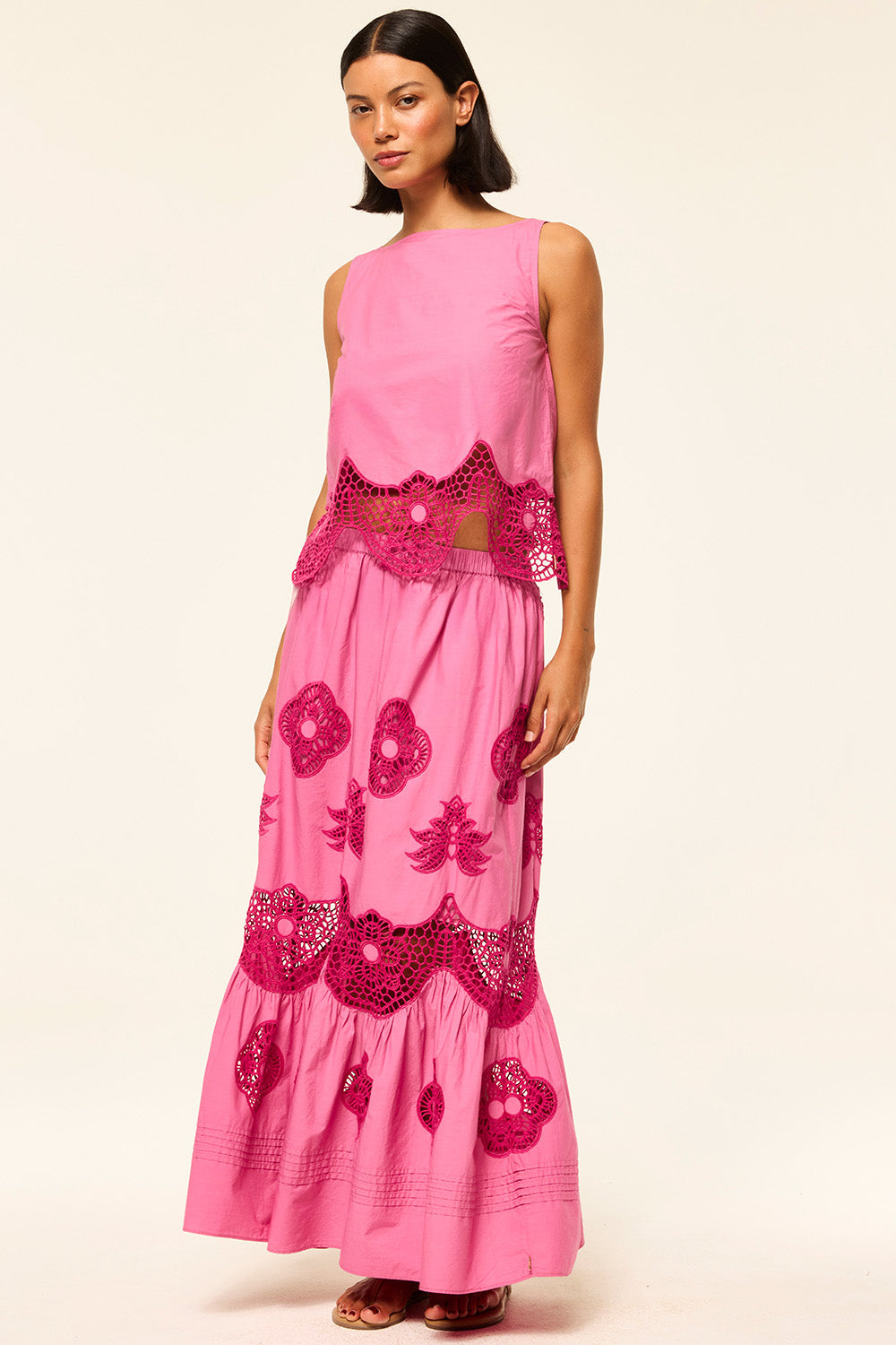 Ayana is a breezy maxi length skirt cut from a vibrant fuchsia cotton. Featuring gorgeous lace embroidered details throughout and a wide ruffle hem. The skirt is partially lined with an elasticated waist. Pair with the coordinating Nola top for a feminine spring set.