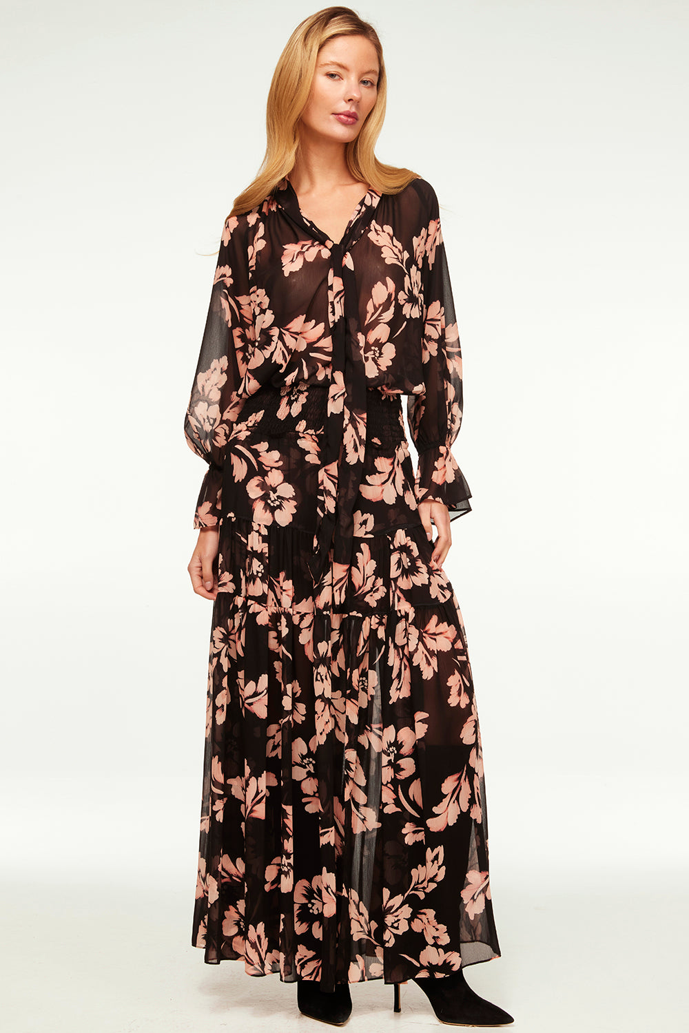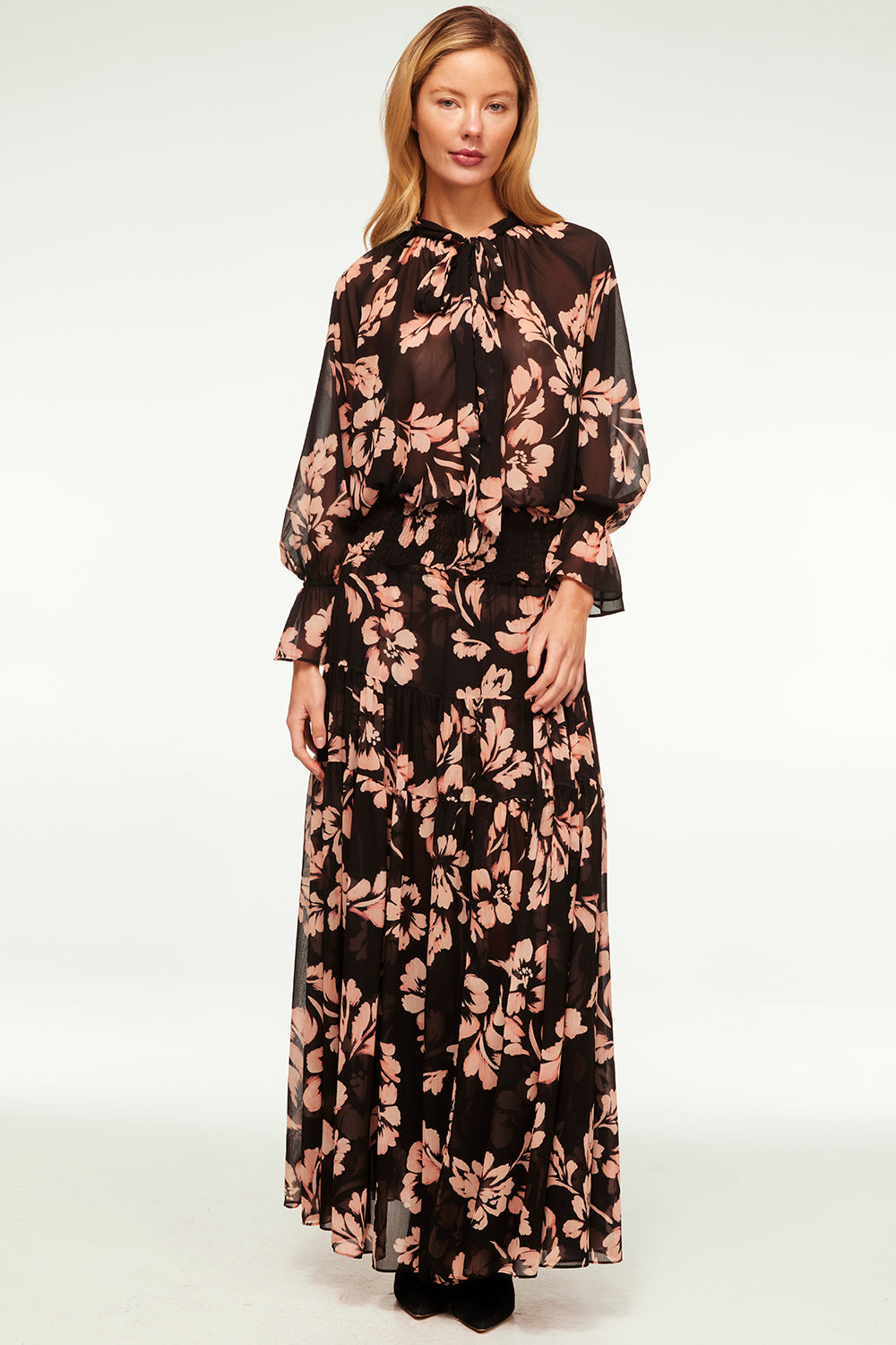Our best-selling Bar skirt is back for fall in a gorgeous Auric Flora print chiffon on black ground. This easy tiered maxi length silhouette features a wide smocked waistband side slit. Double self lined. Pair with the coordinating Gracie top for a chic head to toe look or with one of our layering pieces like the black Nadja and Lula tops.