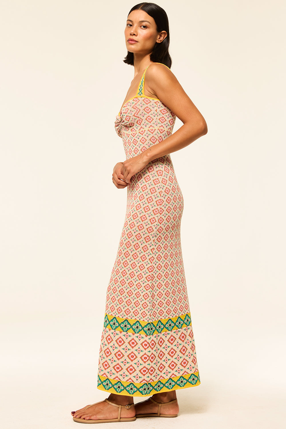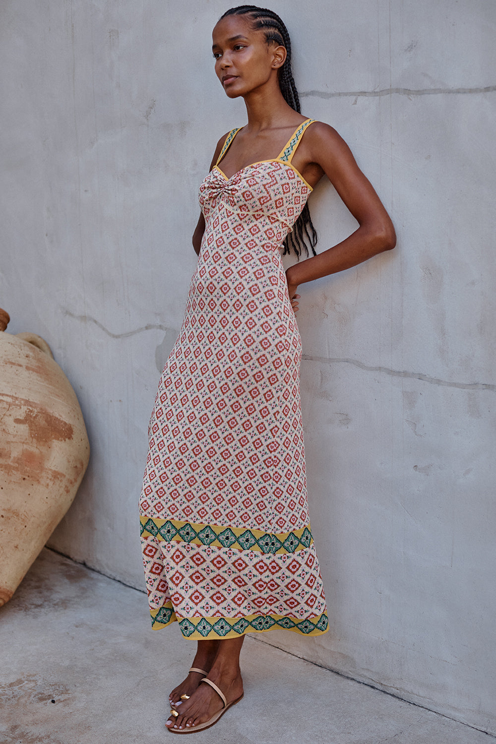 The Bessie dress is a figure-hugging, stretch knit jacquard in a springtime floral block print. This ankle-grazing style features a gathered sweetheart bust line. Contrast printed straps and border print at the hem. Pull-on style. Pair with flat sandals or dress up with heels.