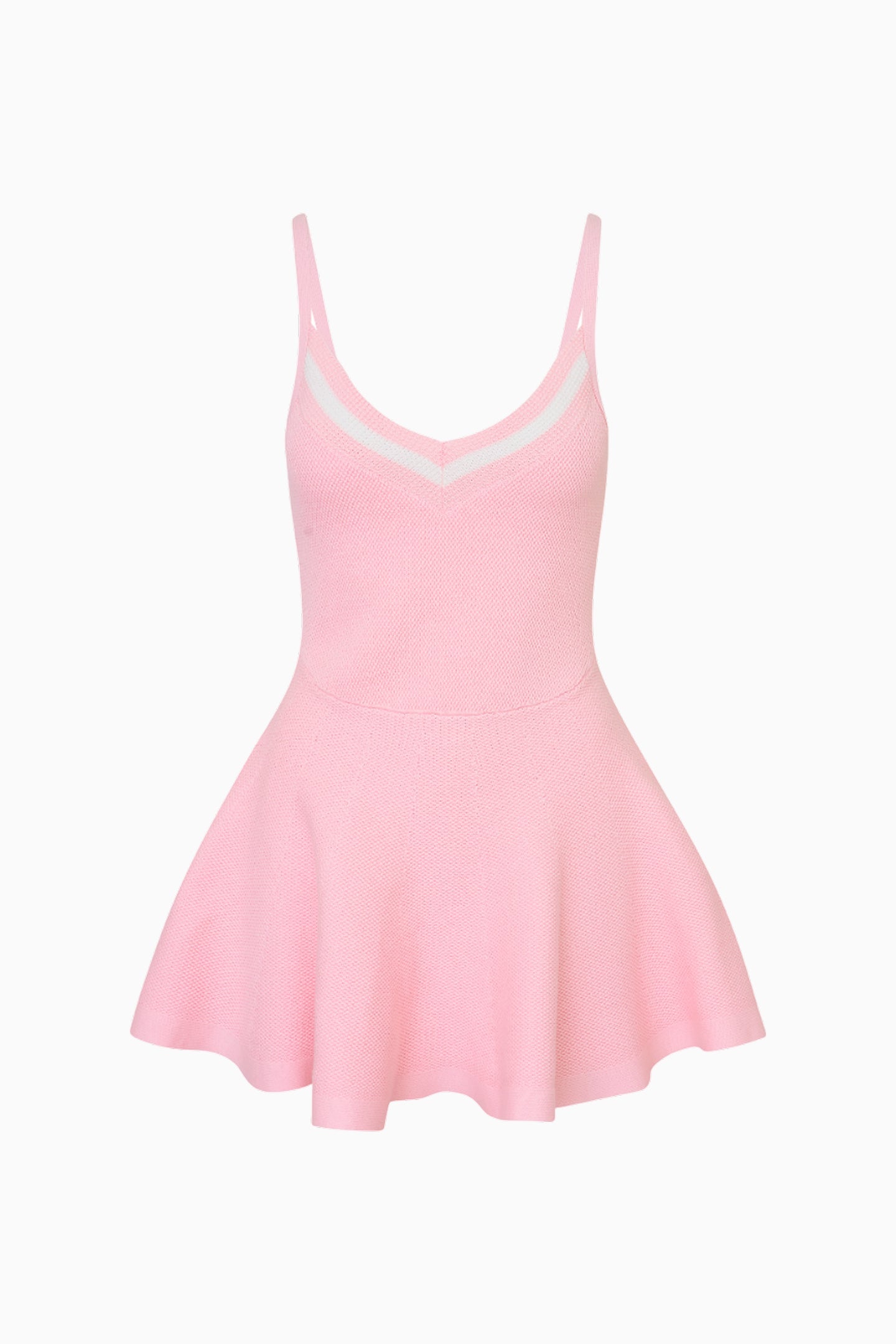 Pretty in pink in the Brinalina Dress. This sweater dress arrives for the summer with a cute contrasting stripe around the neckline giving it a feminine and charming look. The piece begins with full needle straps, a low cut back, a full, airy skirt, and an all over cuff-like stitching.
