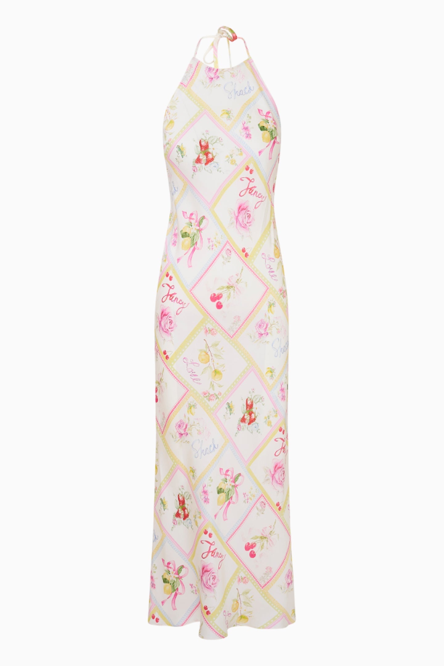 Introducing the Brynthe Dress. Arriving in a silk blend charmeuse fabric, this stunning dress features a beautiful hand-painted print of cherries, lemons, and florals amongst diagonal strips, inspired by postcards from Italy. The midi slip dress has a halter top with delicate self-tie neck ties, and an ever-flowing, body-skimming silhouette.