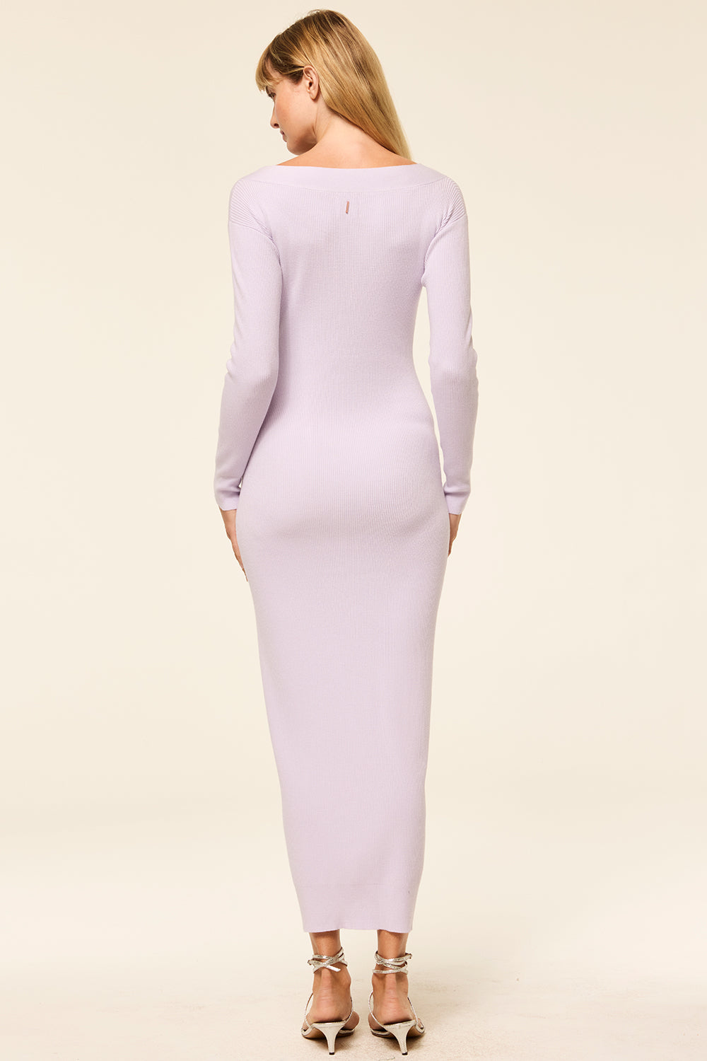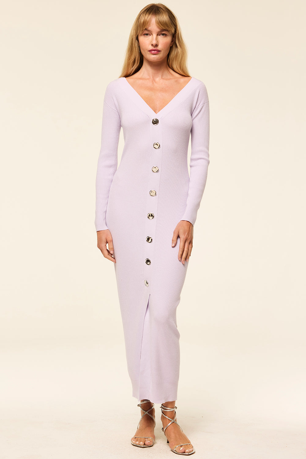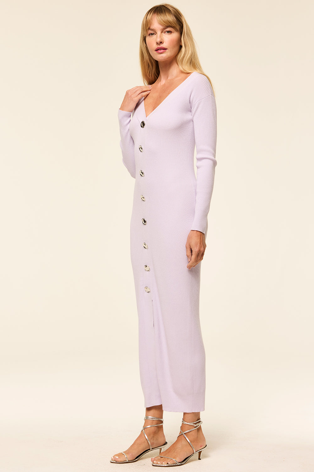 Cassia is an ankle-grazing fine rib-knit dress in the loveliest shade of lilac. This fitted silhouette features a v neckline and long, fitted sleeves that can be worn slightly off the shoulder. The front has a faux opening adorned with large silver buttons.