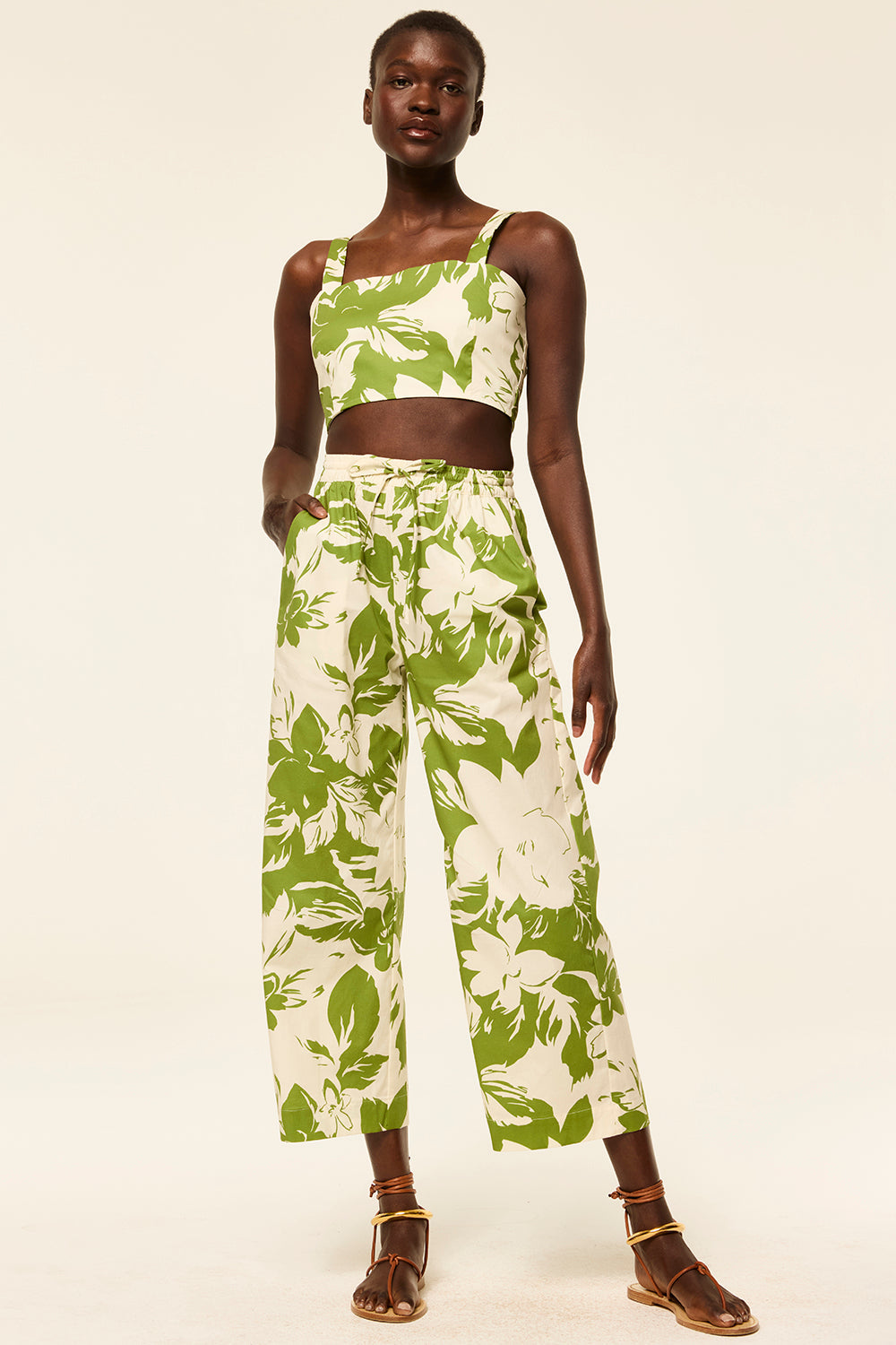 Colette is the perfect spring pant cut from a fresh Green Goddess print cotton blend. An elasticated drawstring waist with wide, cropped legs. Side slit pockets. Pair with the coordinating Lois top for a head-to-toe spring look.