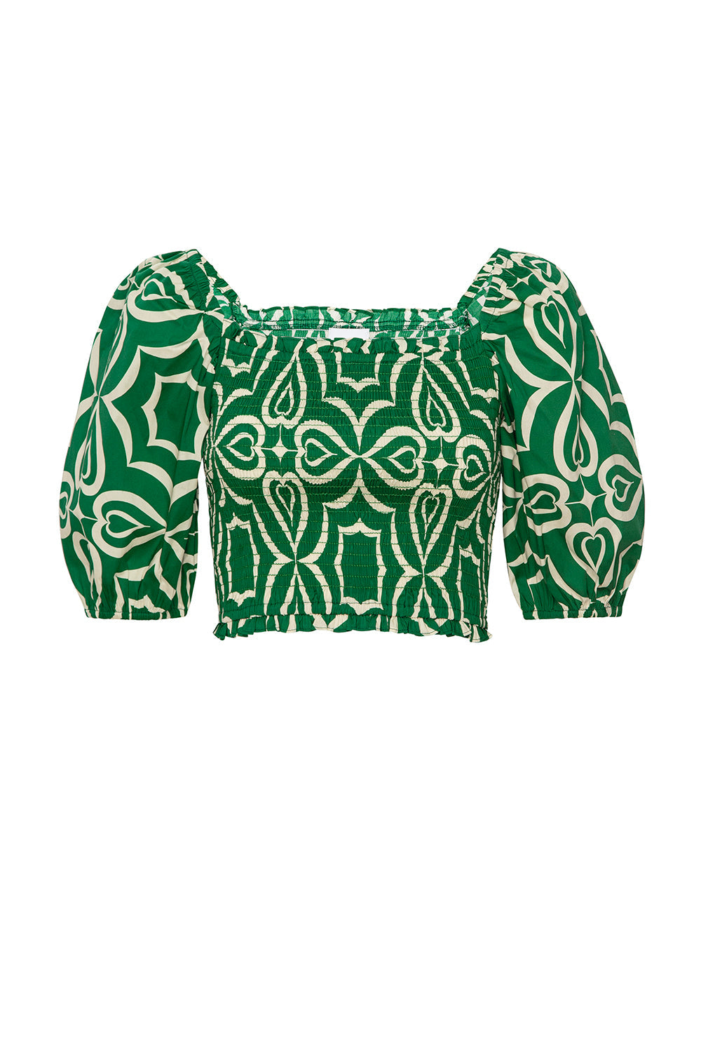 The Cyra top is a playful cropped silhouette cut from stretch cotton in our vibrant Green Mosaic Tile print. Featuring a fully smocked bodice for a flattering, flexible fit, it’s finished with a square neckline and short puffed sleeves with elastic cuffs. Pair it with the coordinating Yelena Skirt for an effortless matching set or style it with high-rise denim for a fresh daytime look.