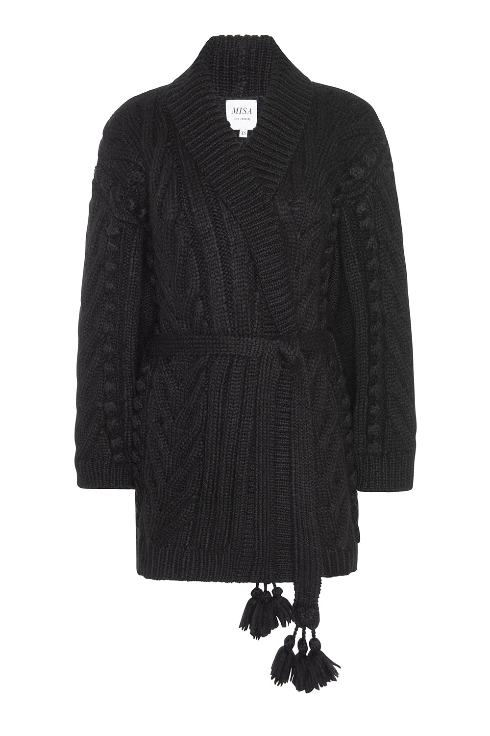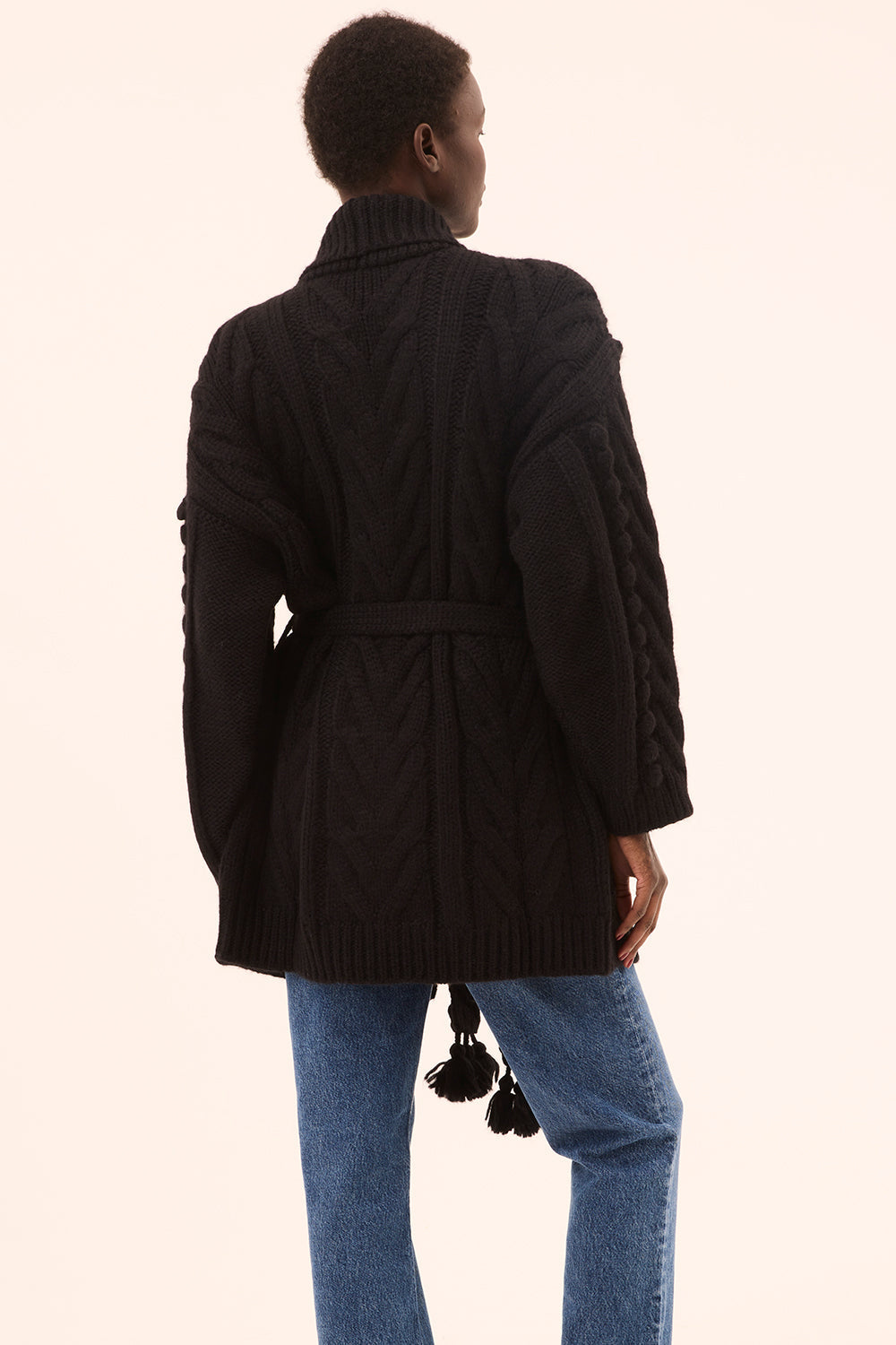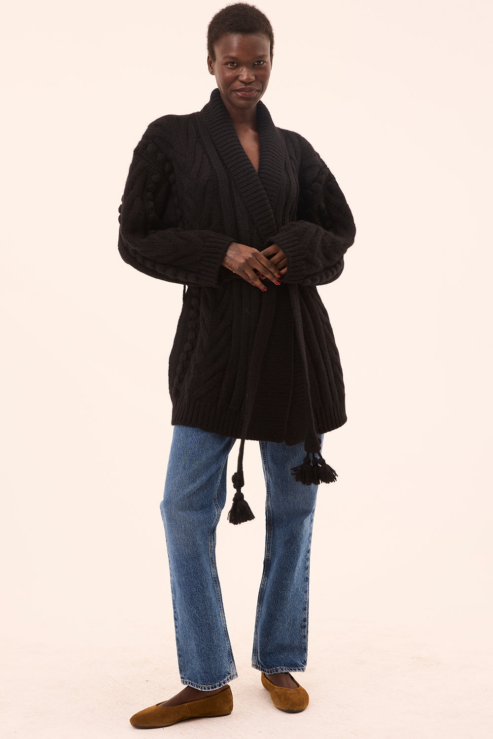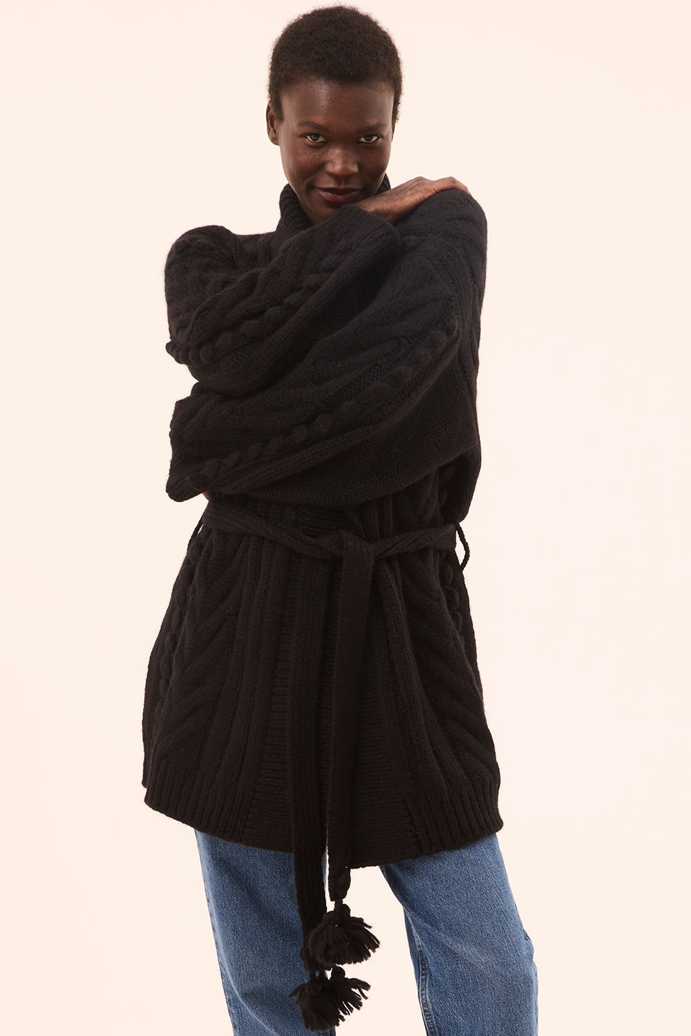 Crafted from the softest alpaca wool, the Dalila cardigan is a timeless wardrobe staple. Its relaxed silhouette is perfect for layering, with an open front, ribbed shawl collar, cuffs, and hem. Featuring a chunky cable knit with pom-pom details and an optional self-tie belt, this piece adds cozy charm to any outfit.