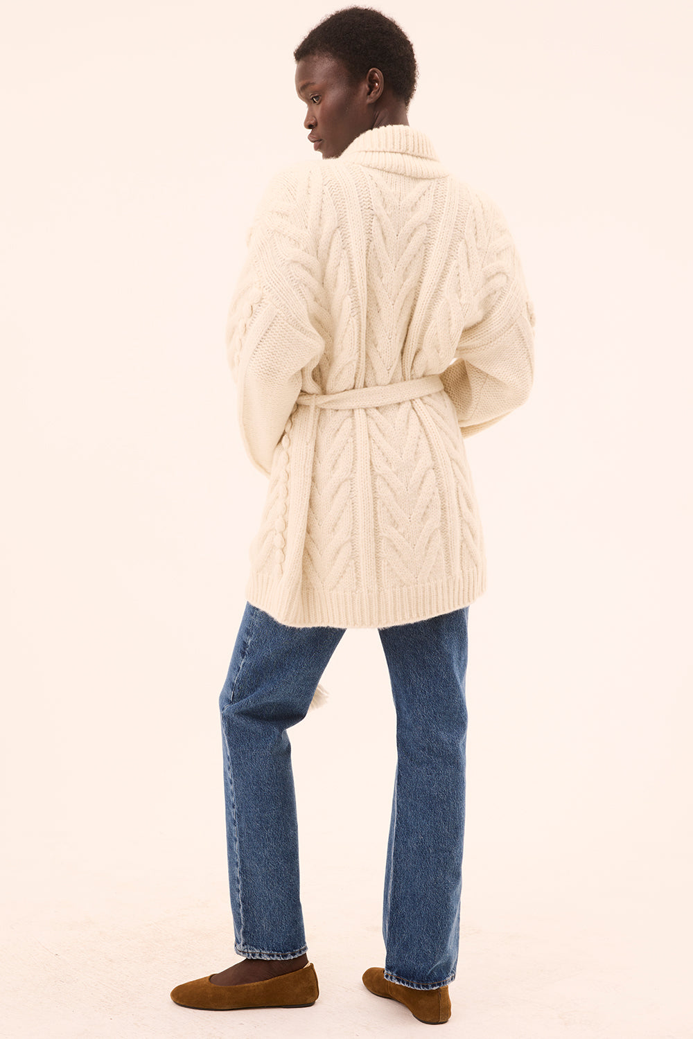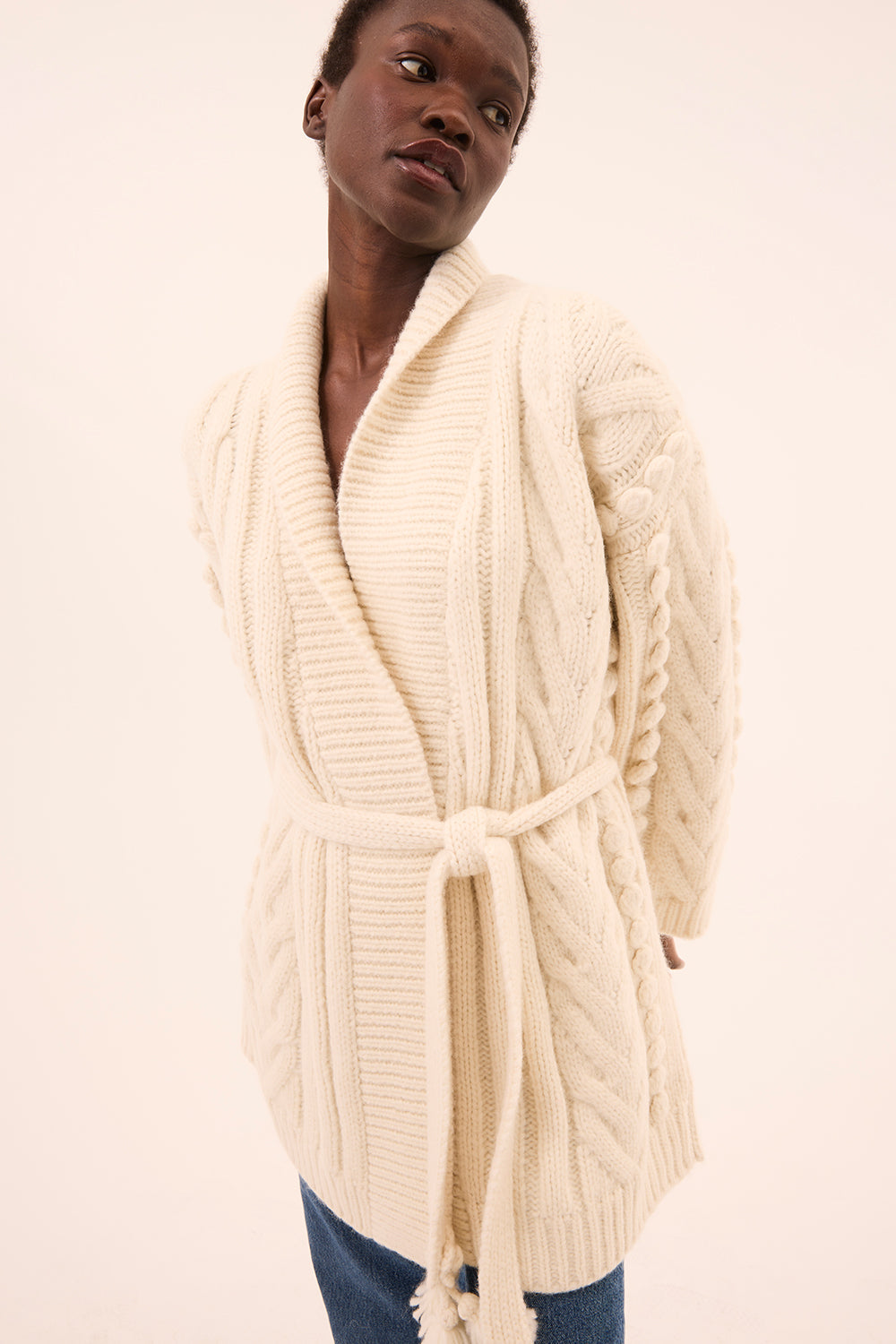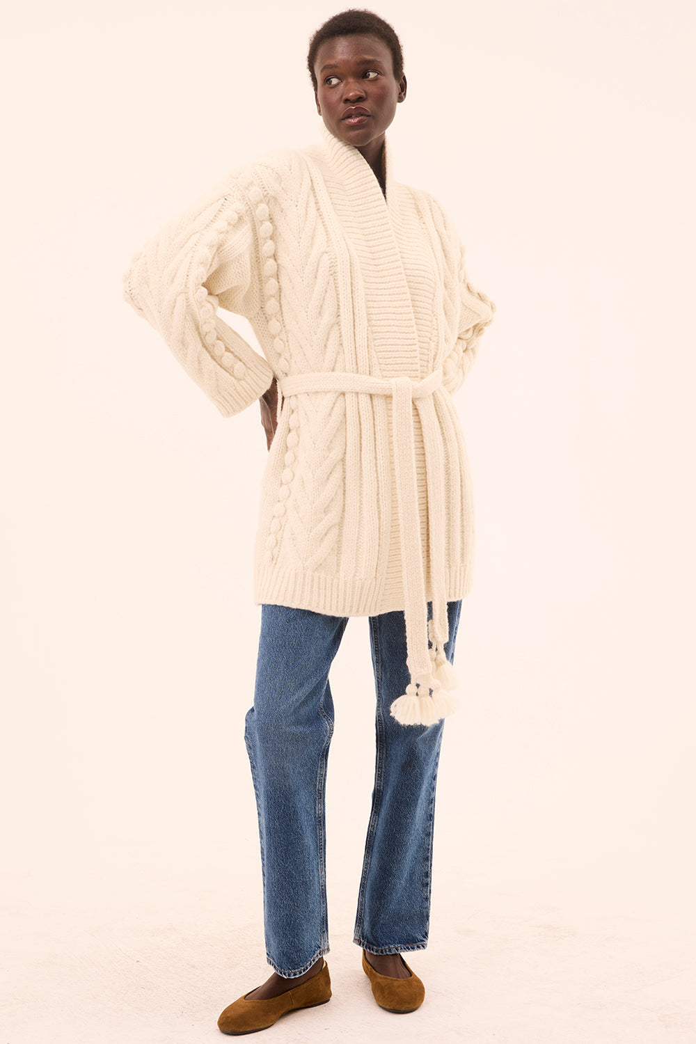 Crafted from the softest alpaca wool, the Dalila cardigan is a timeless wardrobe staple. Its relaxed silhouette is perfect for layering, with an open front, ribbed shawl collar, cuffs, and hem. Featuring a chunky cable knit with pom-pom details and an optional self-tie belt, this piece adds cozy charm to any outfit.
