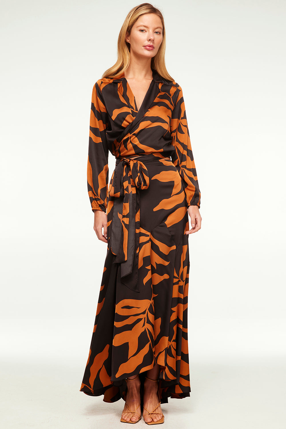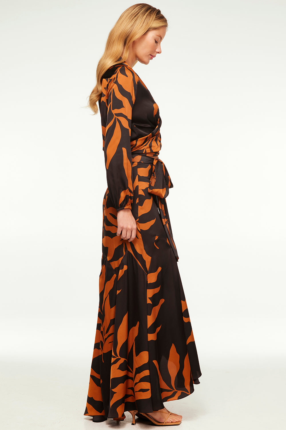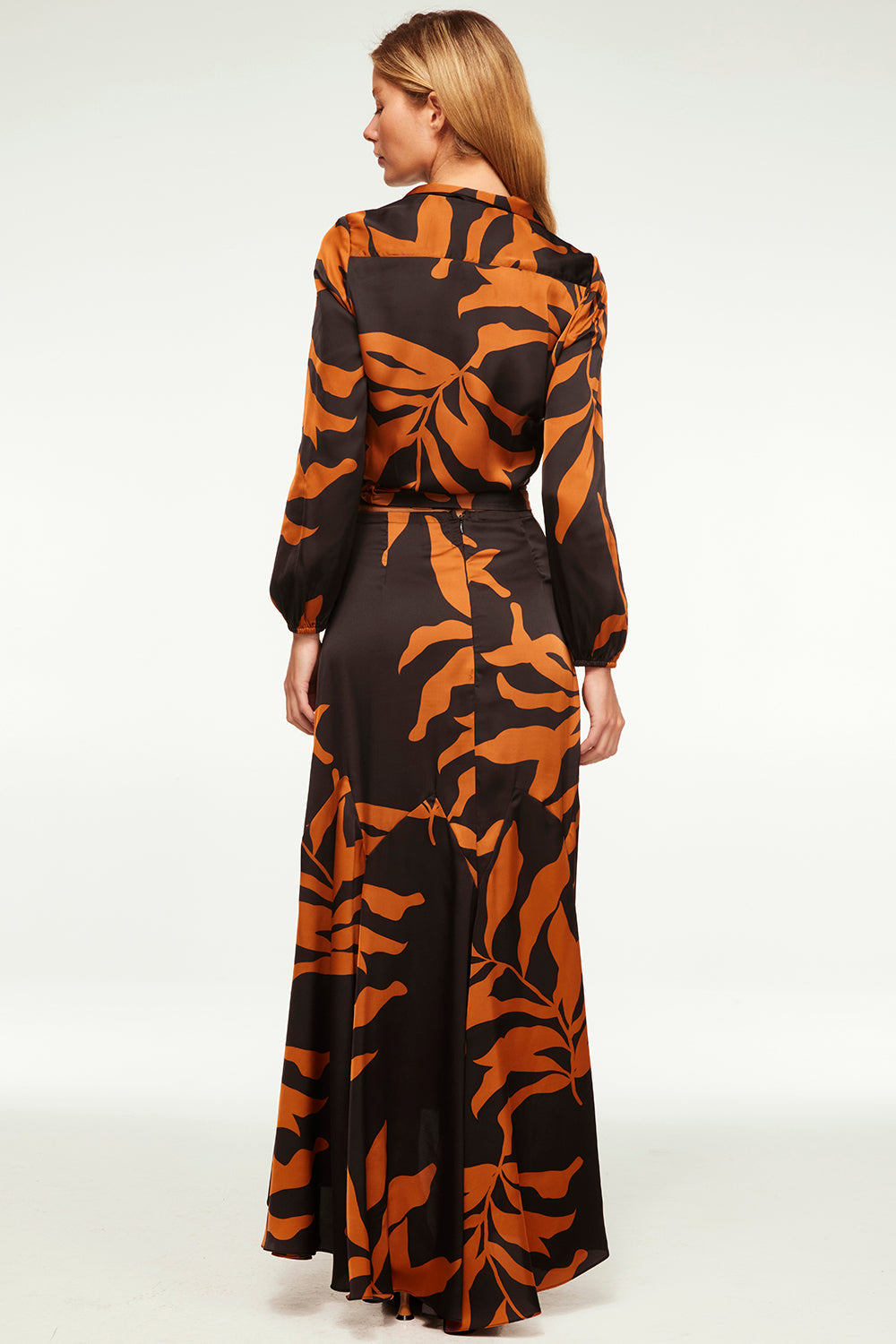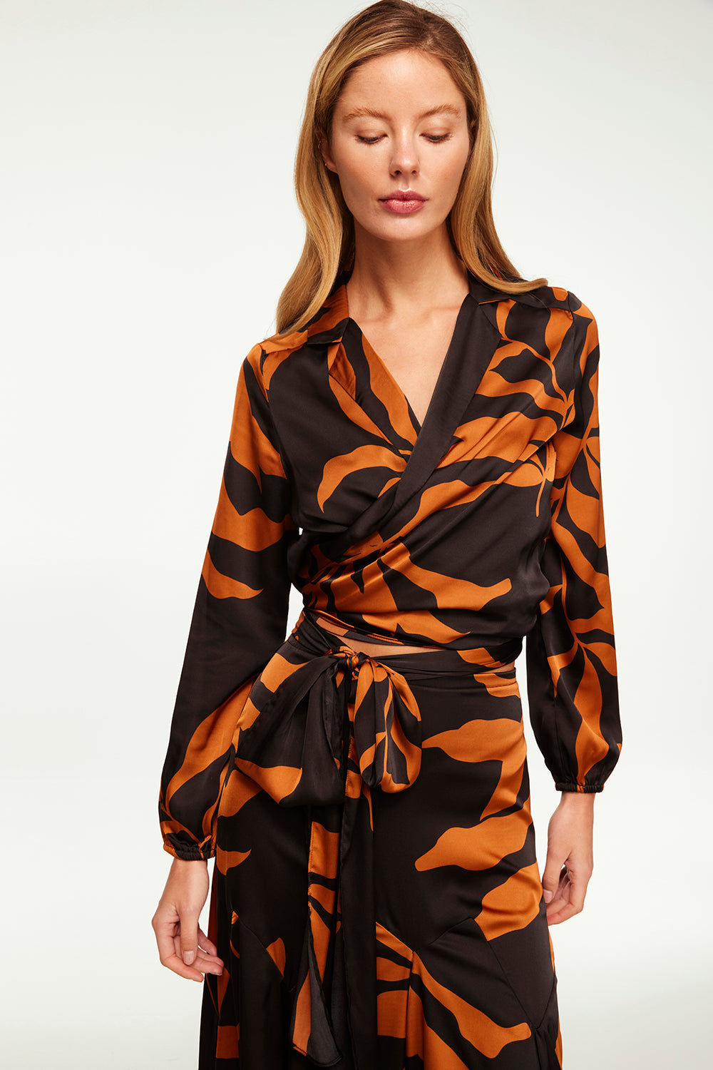 Darcy is a lovely wrap blouse cut from a botanical Fernal Glow printed satin. A v neckline with notched collar. Long voluminous sleeves with elastic cuffs. Yoked back with a self-tie waist. Pair with the coordinating Shelley skirt for a fall-worthy set.