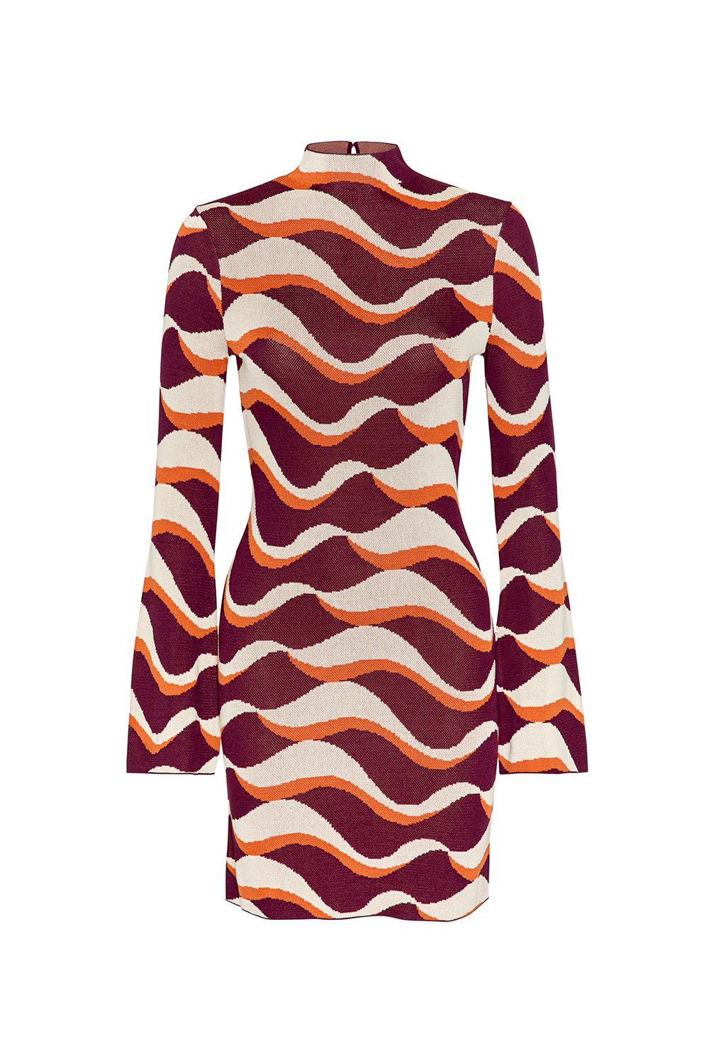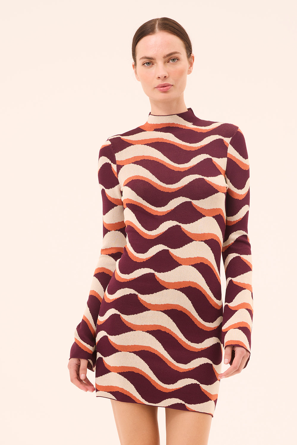 Make a statement this season with the Deliz mini dress, crafted in a striking Autumnal Wave stretch jacquard knit. This figure-hugging silhouette features a mock turtleneck with a double button closure at the back and long sleeves with a subtle flare. Effortlessly versatile—pair it with knee-high boots for cool-weather chic or dress it up with strappy heels for an elevated evening look.