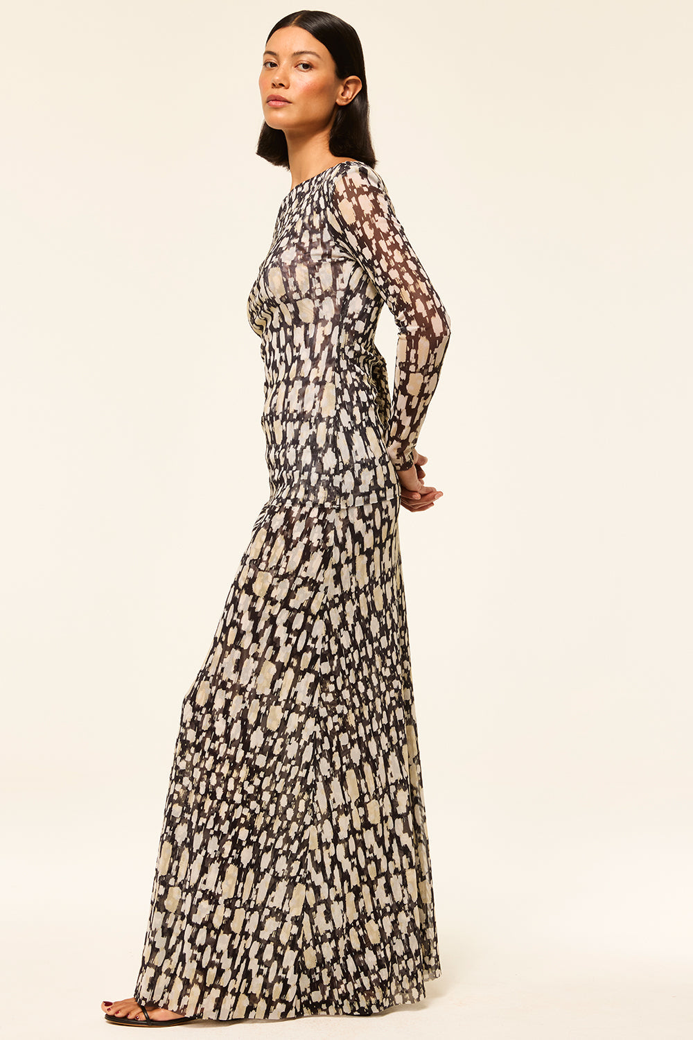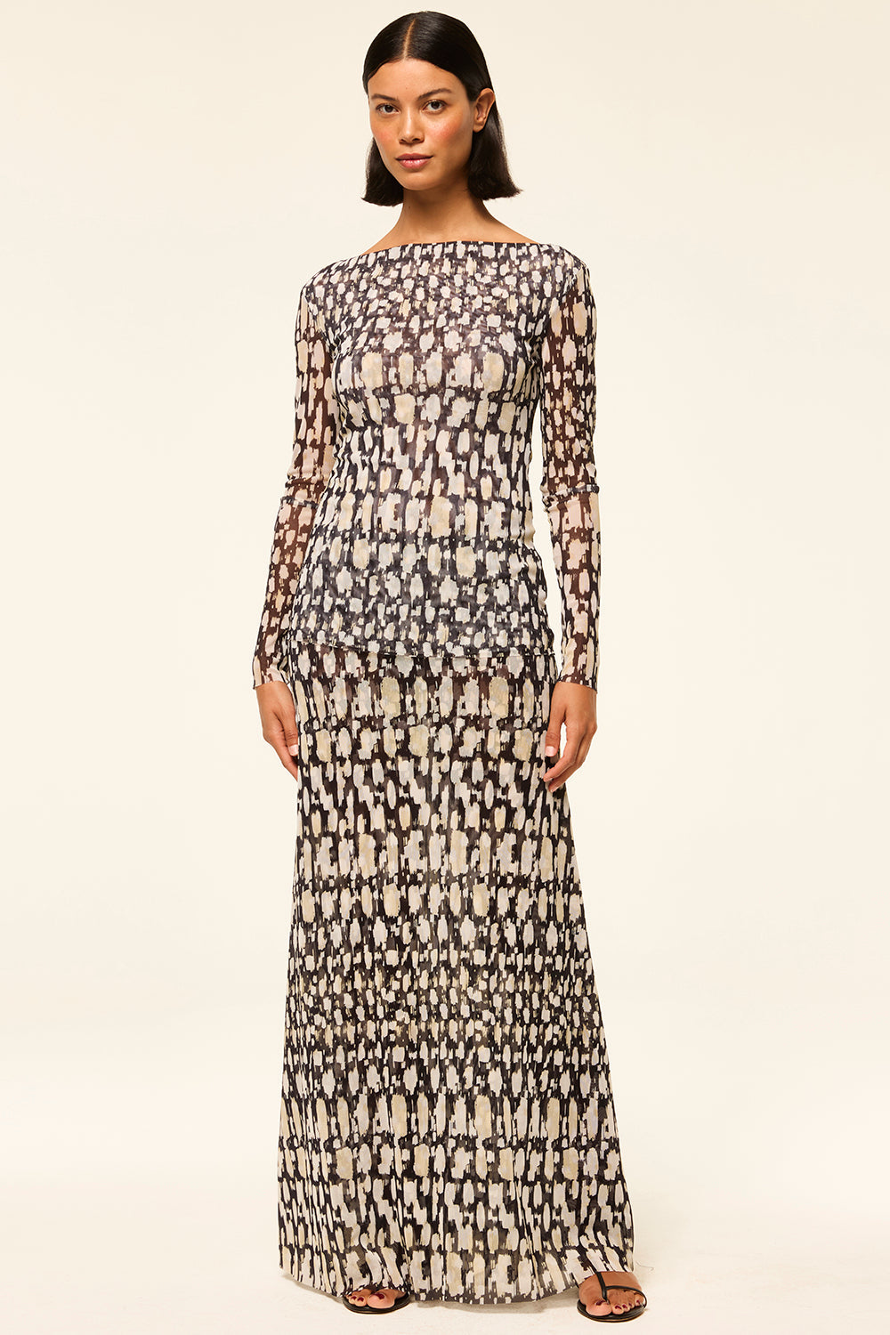 Our always effortless Ekat maxi skirt is cut from a black and white Abstract Geo mesh. A comfortable elastic waistband leads into a double lined straight skirt. Pair with the coordinating Hayworth bodysuit or Lira top for the perfect set.