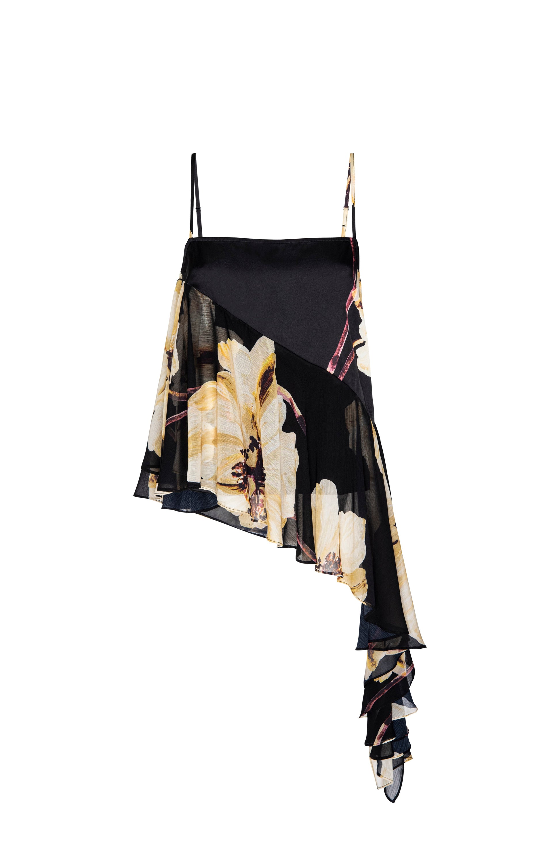 Elga is a flowing, sleeveless silhouette with a square neckline and delicate adjustable spaghetti straps. The camisole-style bodice is crafted from luxurious satin featuring a Golden Poppy print set against a black background. A bold, chiffon ruffled trim sweeps diagonally across the bodice, cascading to mid-thigh for a touch of bohemian drama.