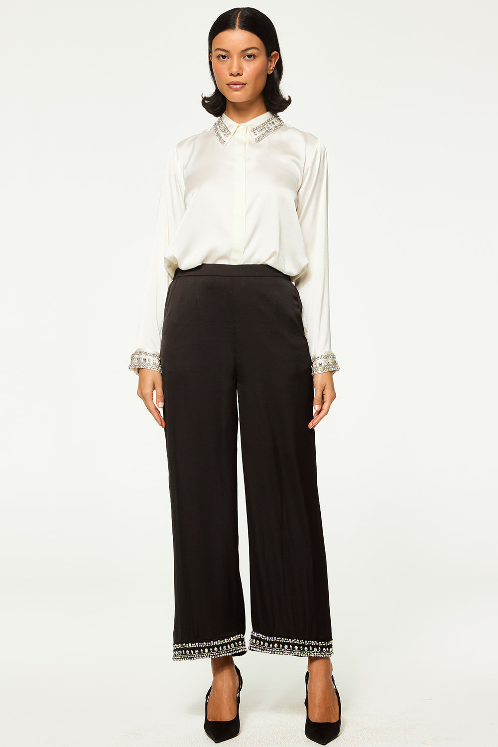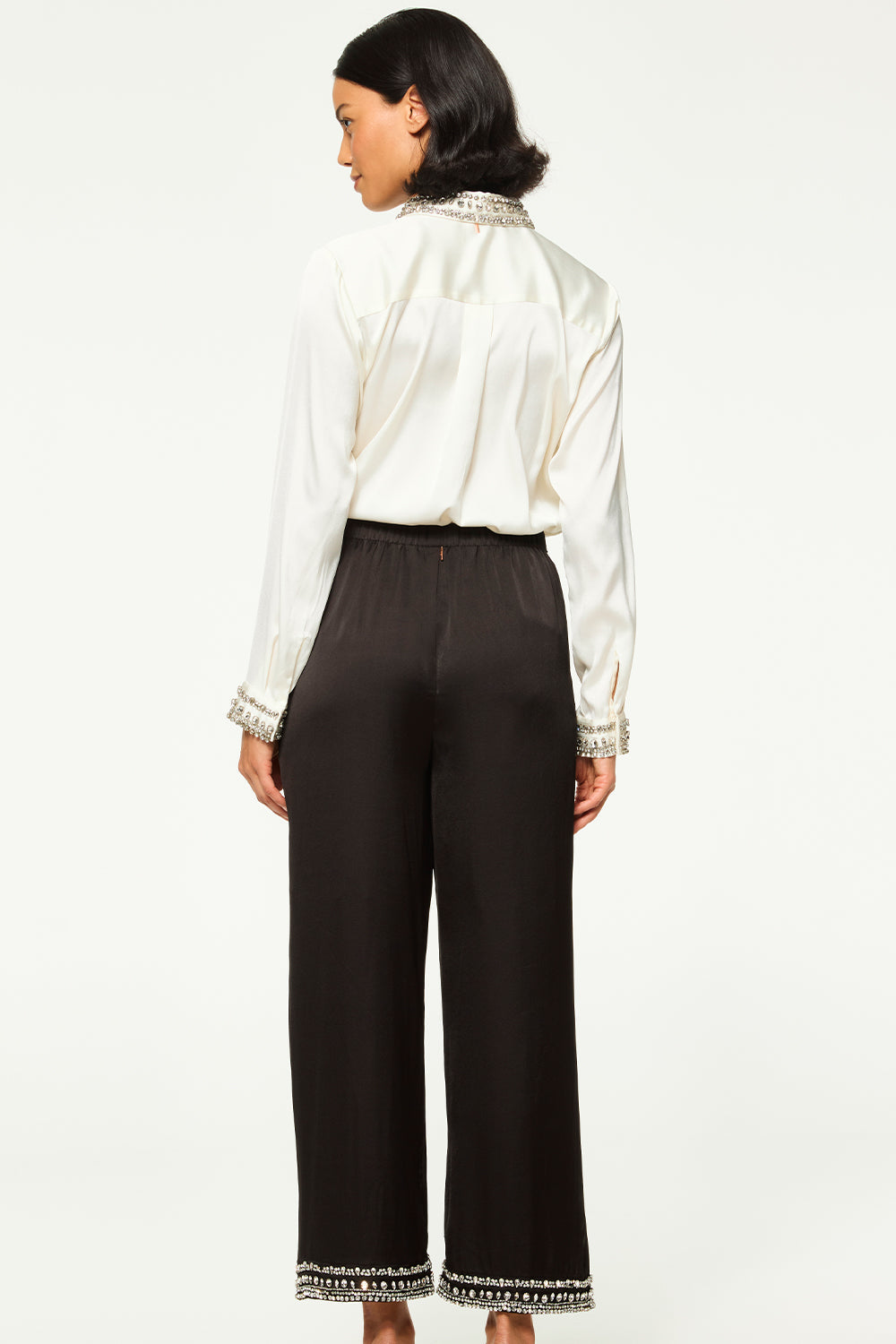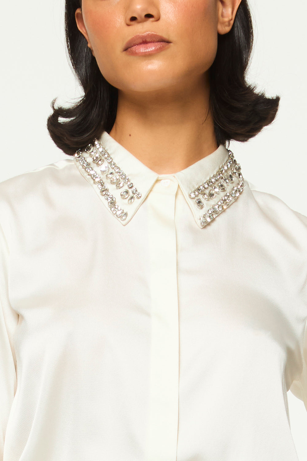 Ellie is a chic holiday update to your favorite button down shirt. Featuring a rhinestone embellished collar and cuffs. Cut from ivory satin with a full hidden button front placket. Dress up your favorite pair of jeans or wear with a satin trouser.