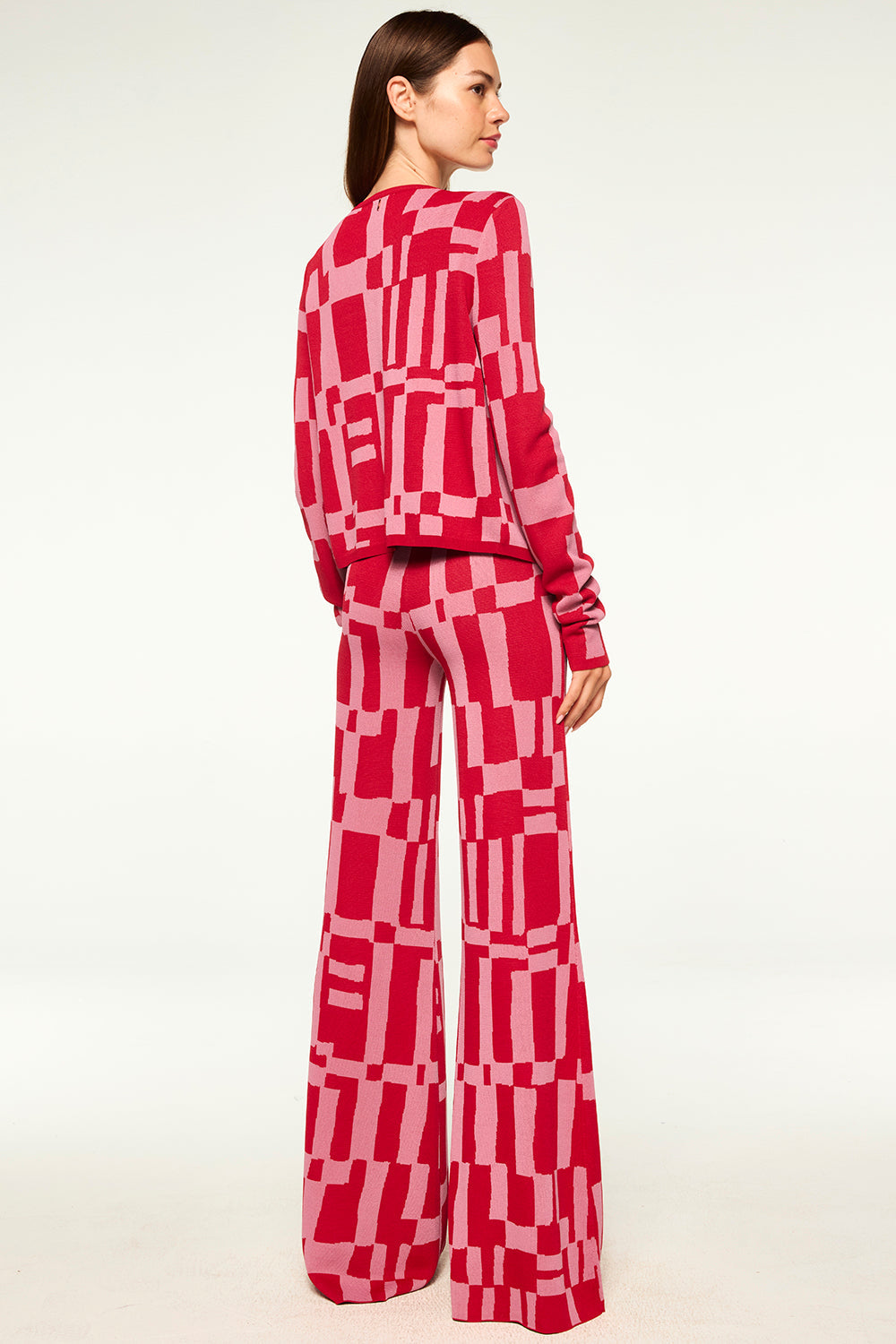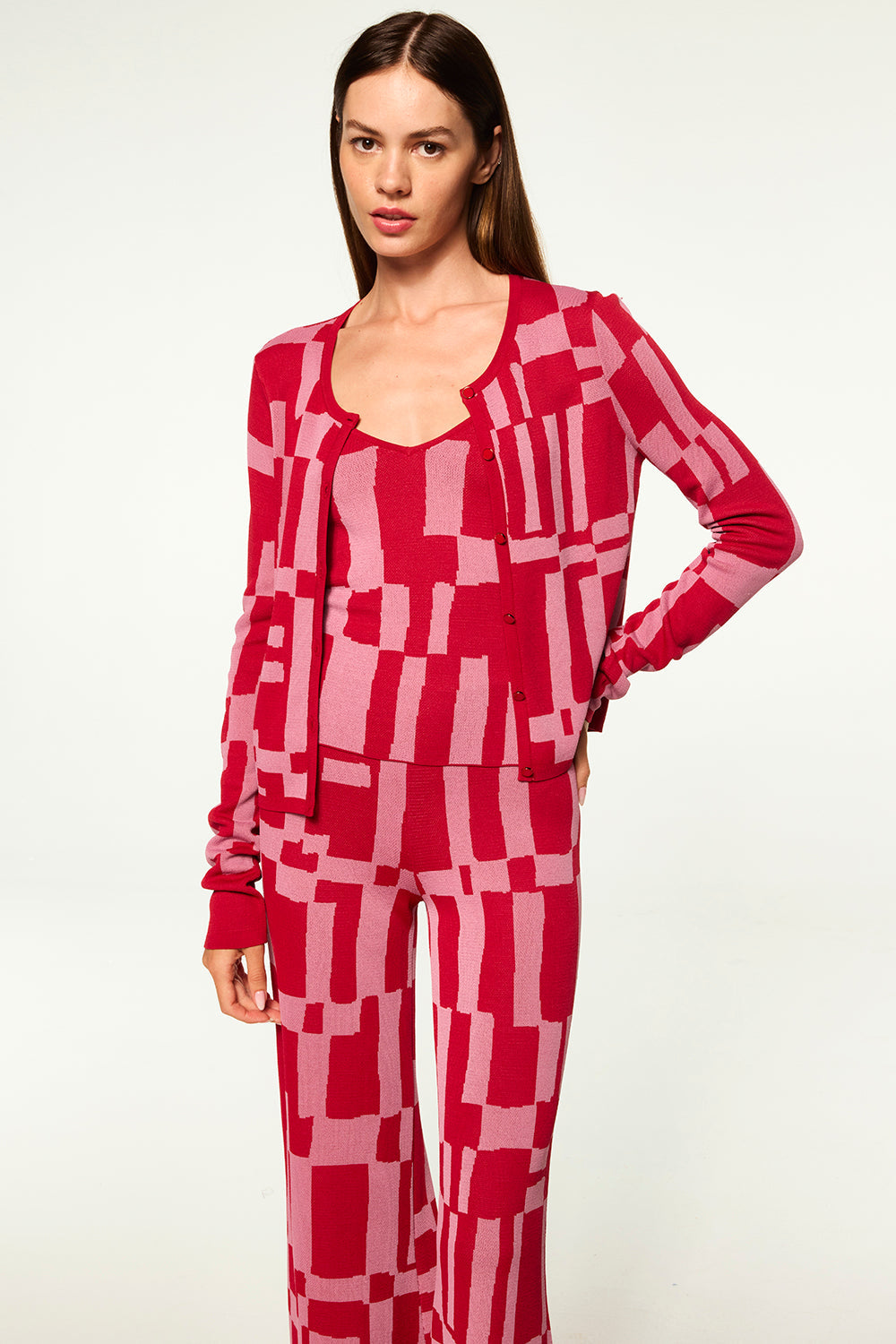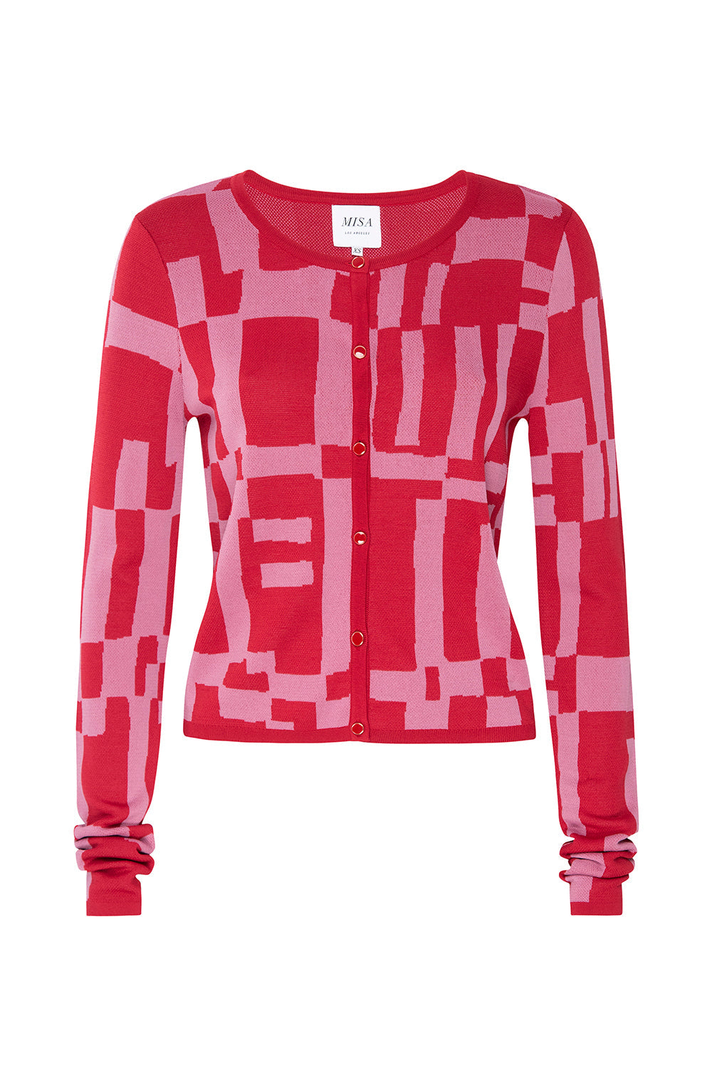Elvin is a chic stretch knit cardigan in a two-tone red and pink geometric pattern. Featuring a round neckline, long sleeves and red enamel buttons. Pair with the coordinating Koa pant for a bold set. Wear alone or on top of the coordinating Una camisole.