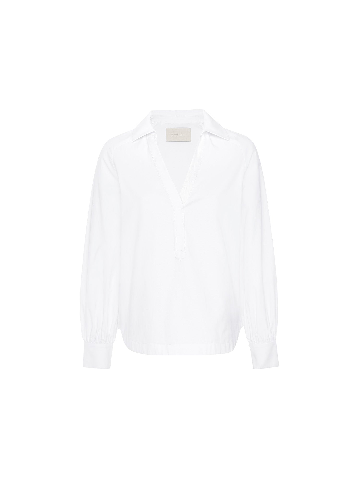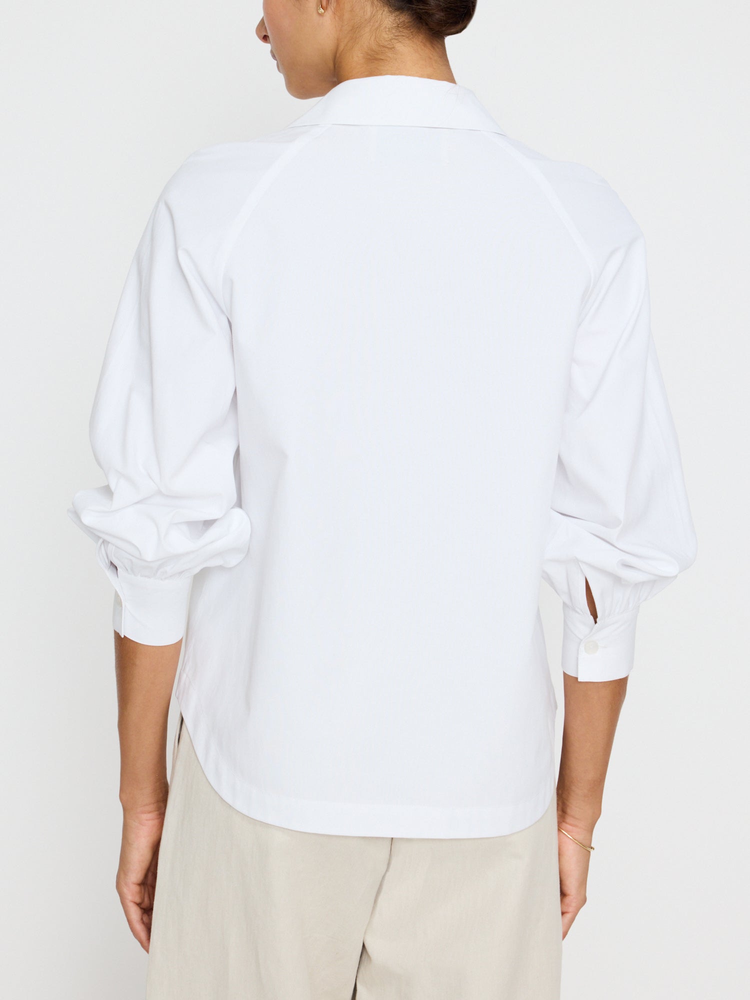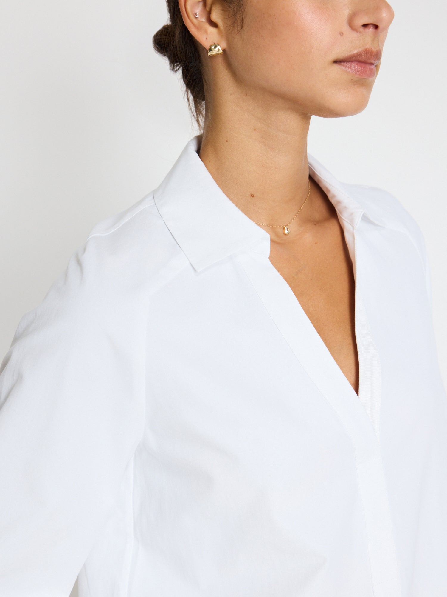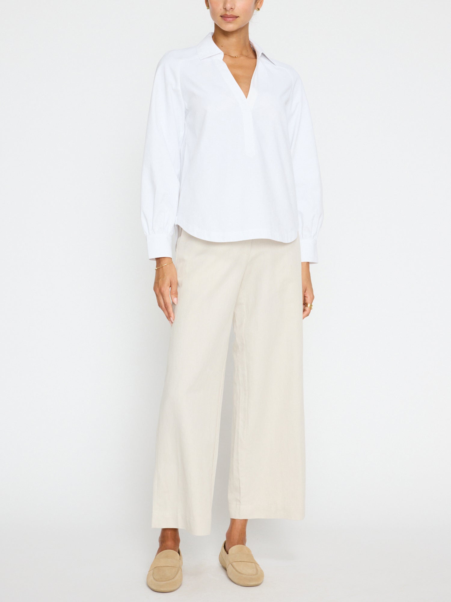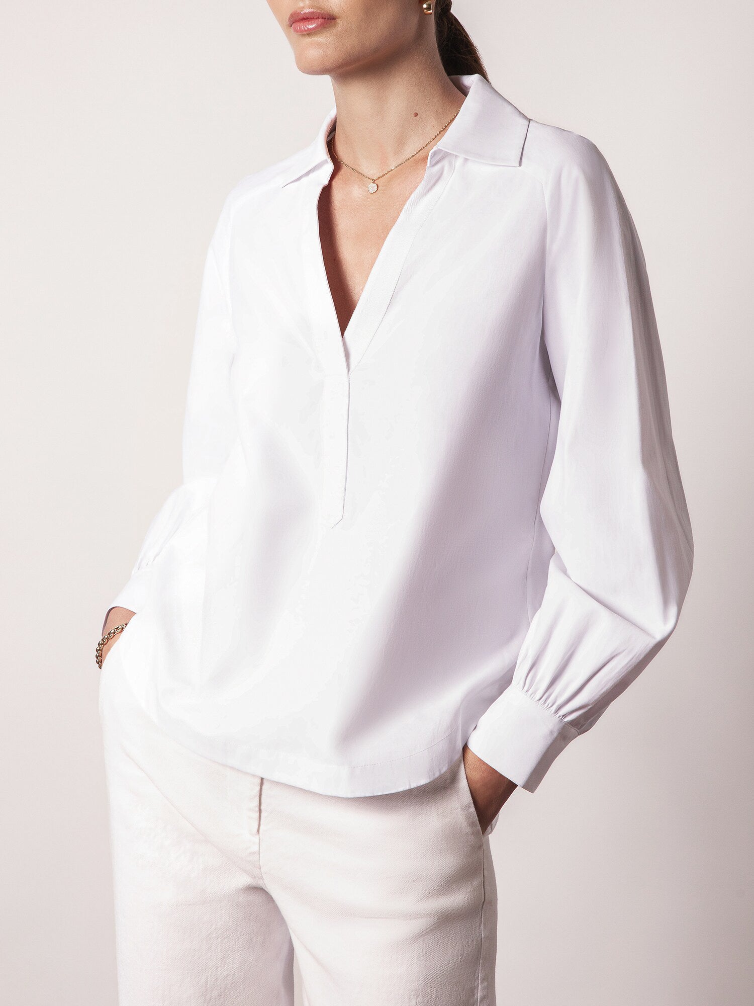 Rich with defining details our Emelia Top is the essence of sensuality. From its collared, deep V neckline with grosgrain detailing at the under placket to its dramatic shirred sleeves accented by Saddle shoulders, this popover blouse is as feminine as it is effortless.