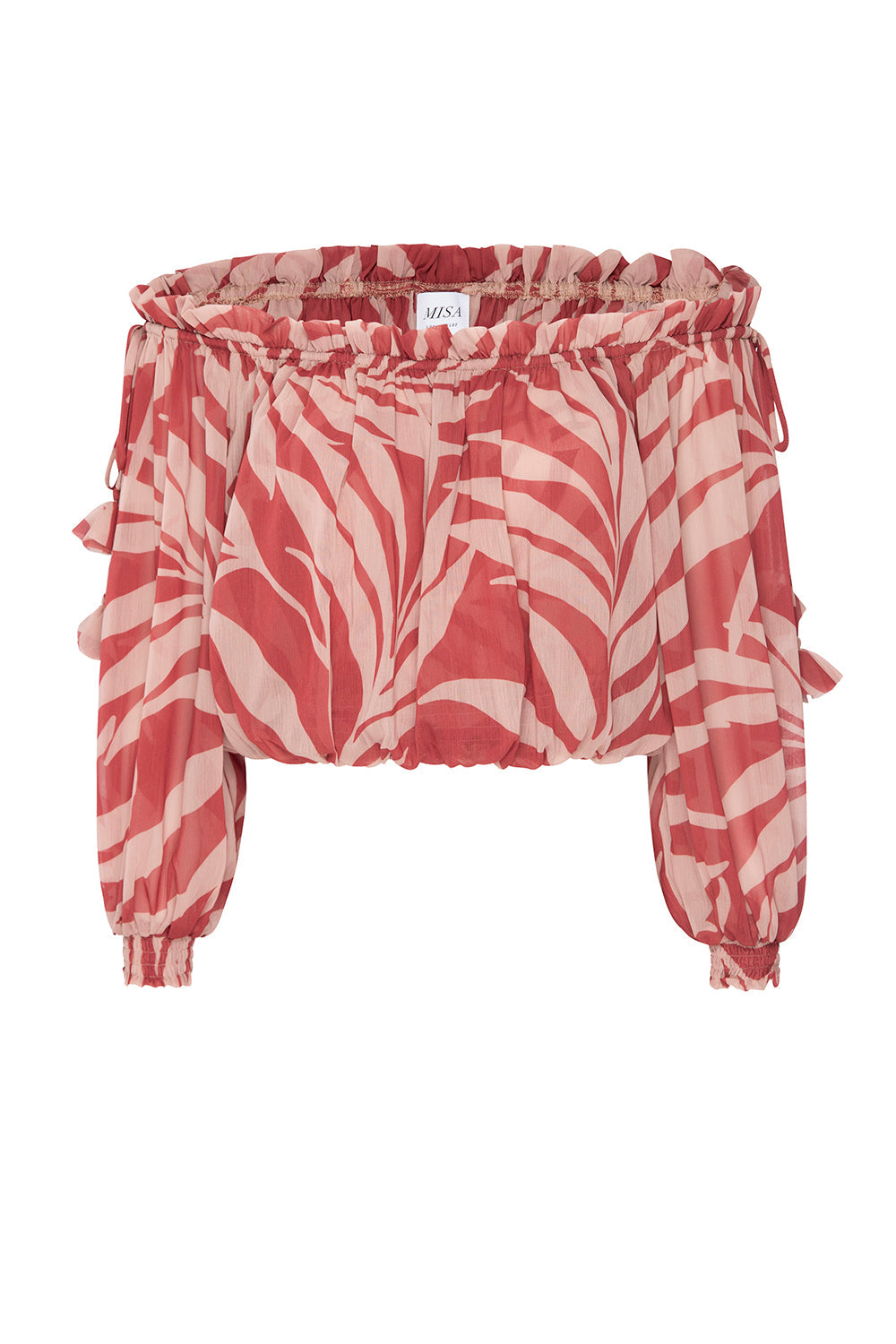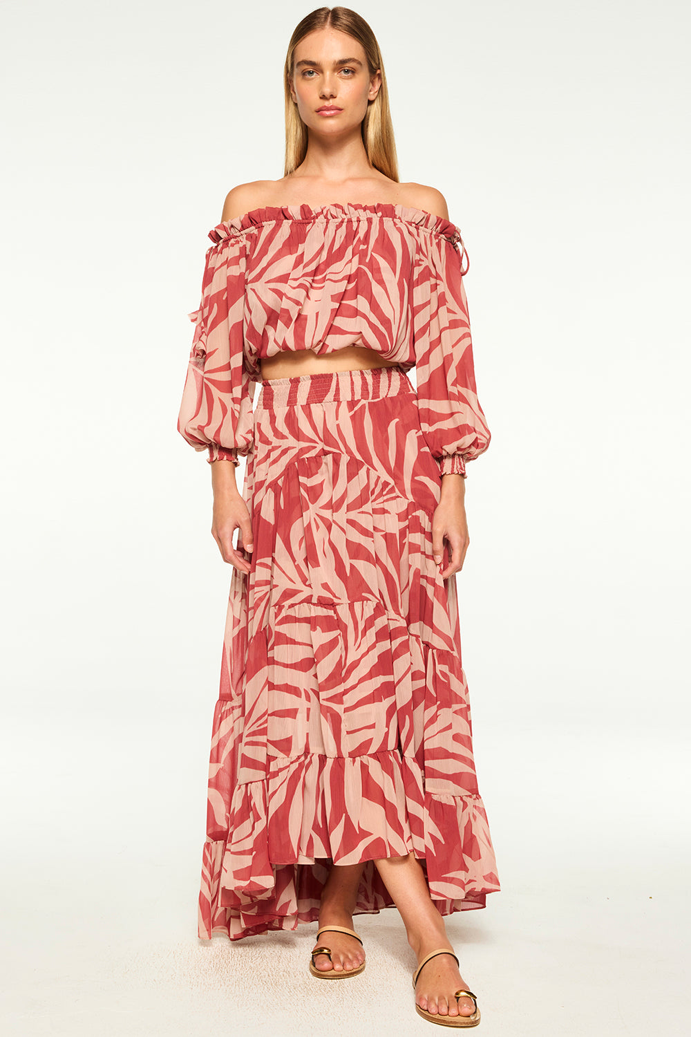 Our newest Eva top is a flirty off-the-shoulder crop top cut from a Palm Frond printed chiffon. An elastic neckline with petal tie detail allows this top to be adjusted for a comfortable fit. Pair this bohemian silhouette with your favorite jeans or complete the look with the coordinating Marie skirt.