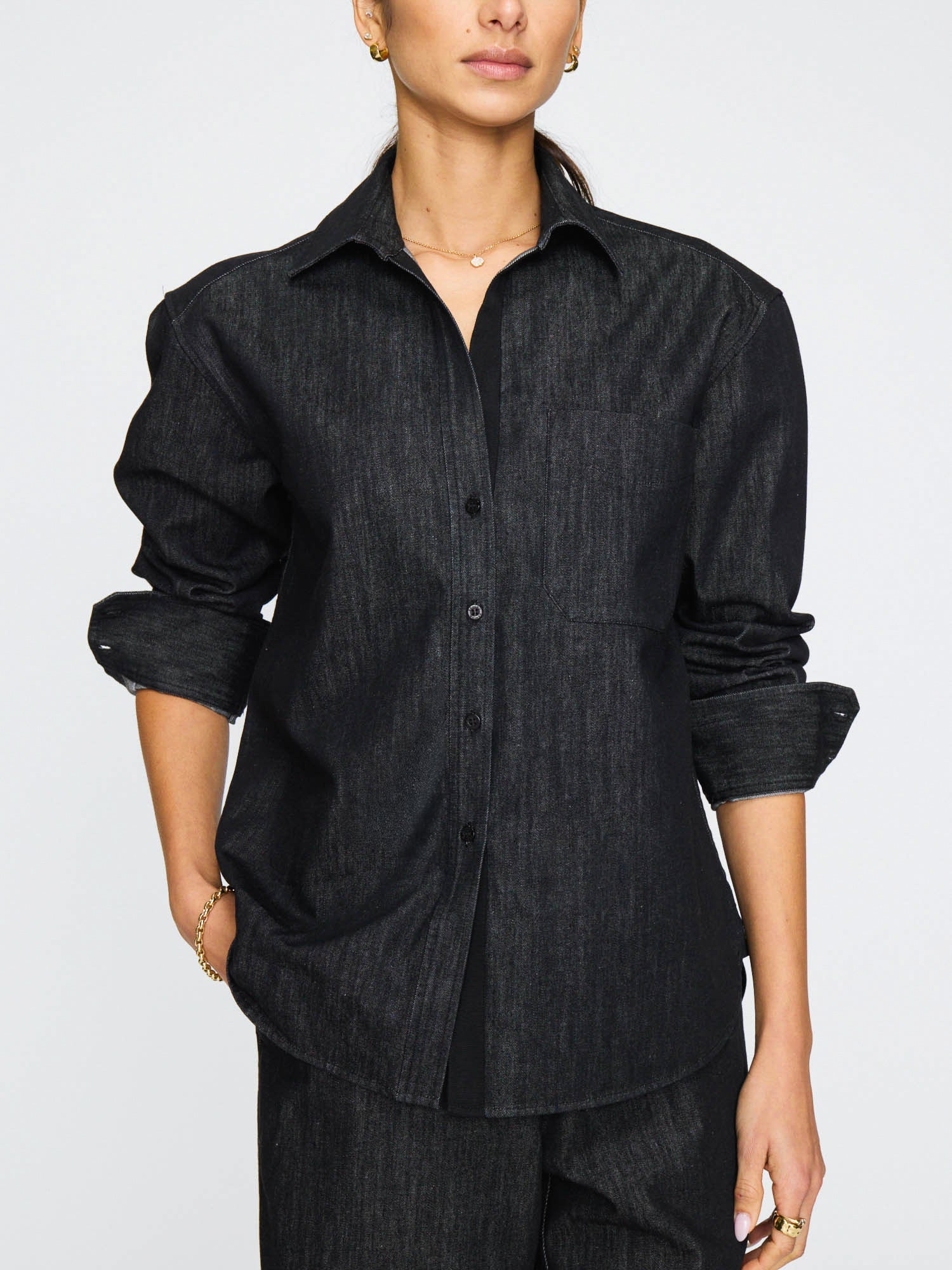 Classic and casual, the Everyday Denim Shirt in black-washed denim is a versatile wardrobe hero. Its relaxed fit and thoughtful grosgrain details make it a go-to for everyday ease.