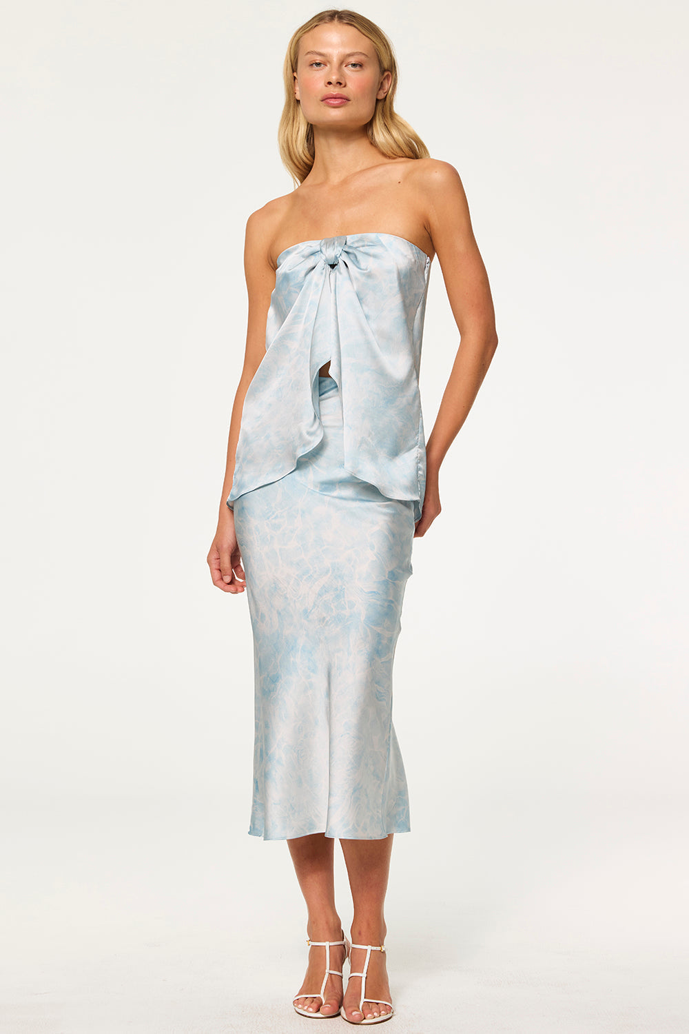 Fay is a sleek, midi-length slip skirt cut from our Acqua Blue–printed satin. Designed with a covered elastic waistband and a hidden side zip closure, it offers a smooth, flattering fit. Perfect for summer styling, it pairs effortlessly with everything from flats to heels. Complete the look with the matching Pixie Top for a chic, coordinated set.