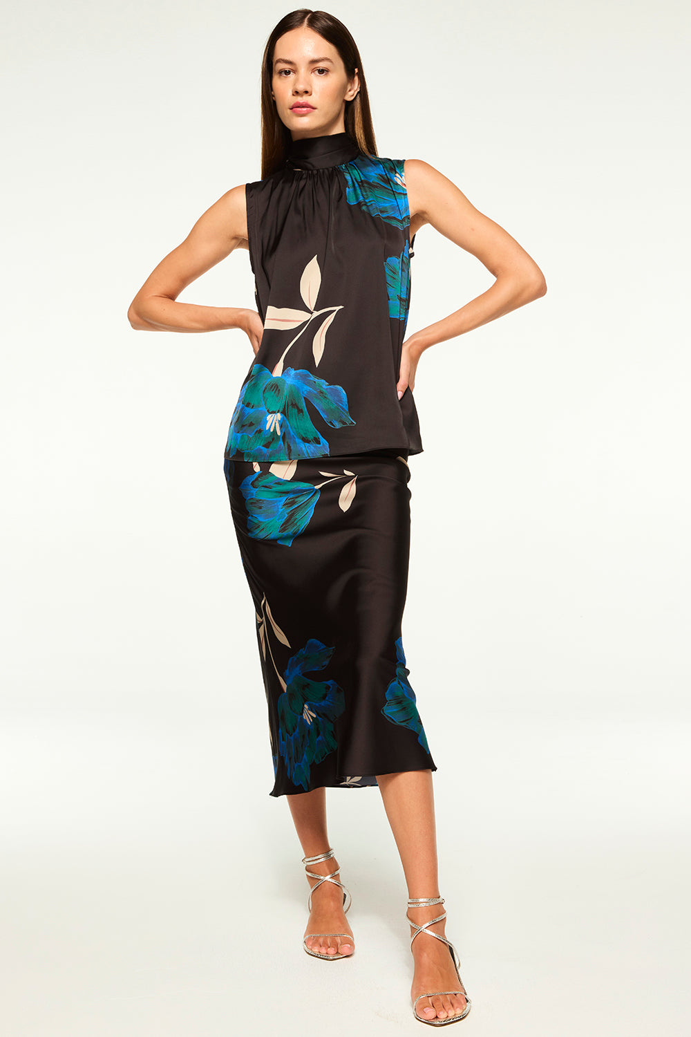 Our Fay skirt is a simple slip skirt that hits at the midi length and is cut from our Nightshade Flora printed satin. A covered elastic waist is finished with a hidden side zip closure. Pair with everything from mules to flats for the perfect transitional style. Coordinate with our matching Luka top for a chic set.