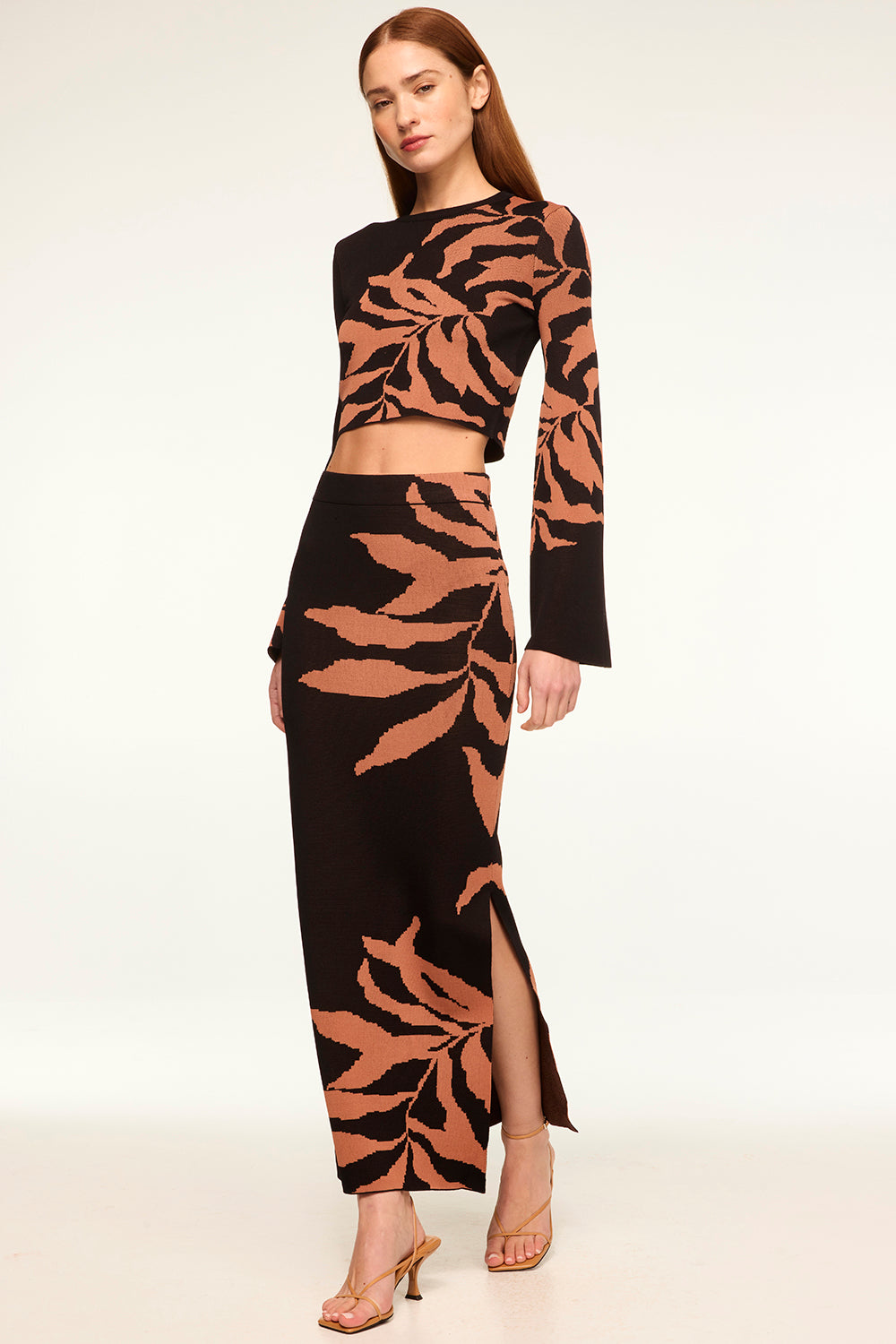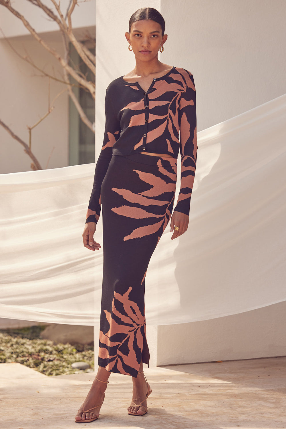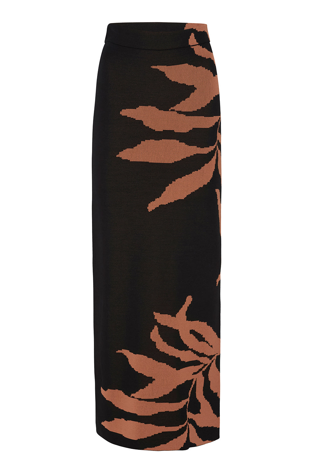 Our ankle-grazing Fira knit skirt features a botanical fern motif. This body-conscious pencil skirt has a slit in one leg and a banded elastic waist. This flattering stretch knit pairs perfectly with the matching Amila top or Joana cardigan.
