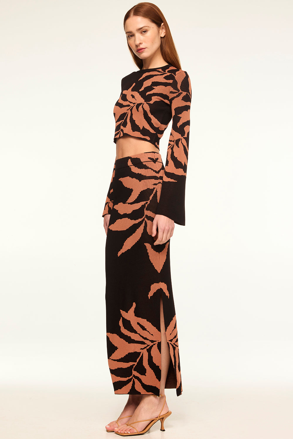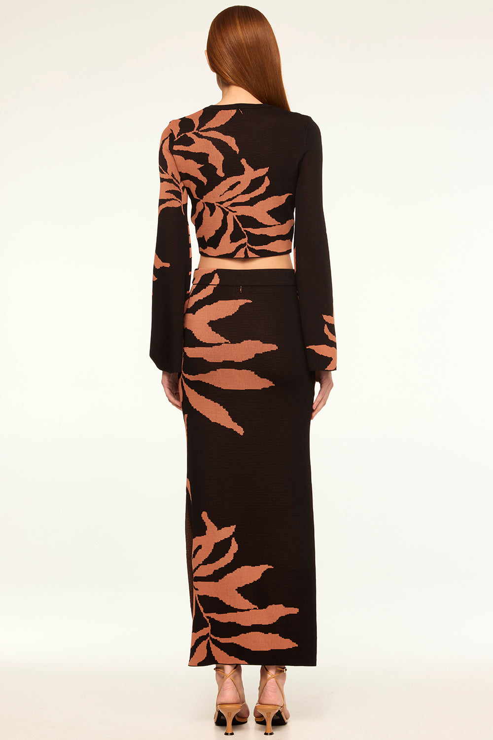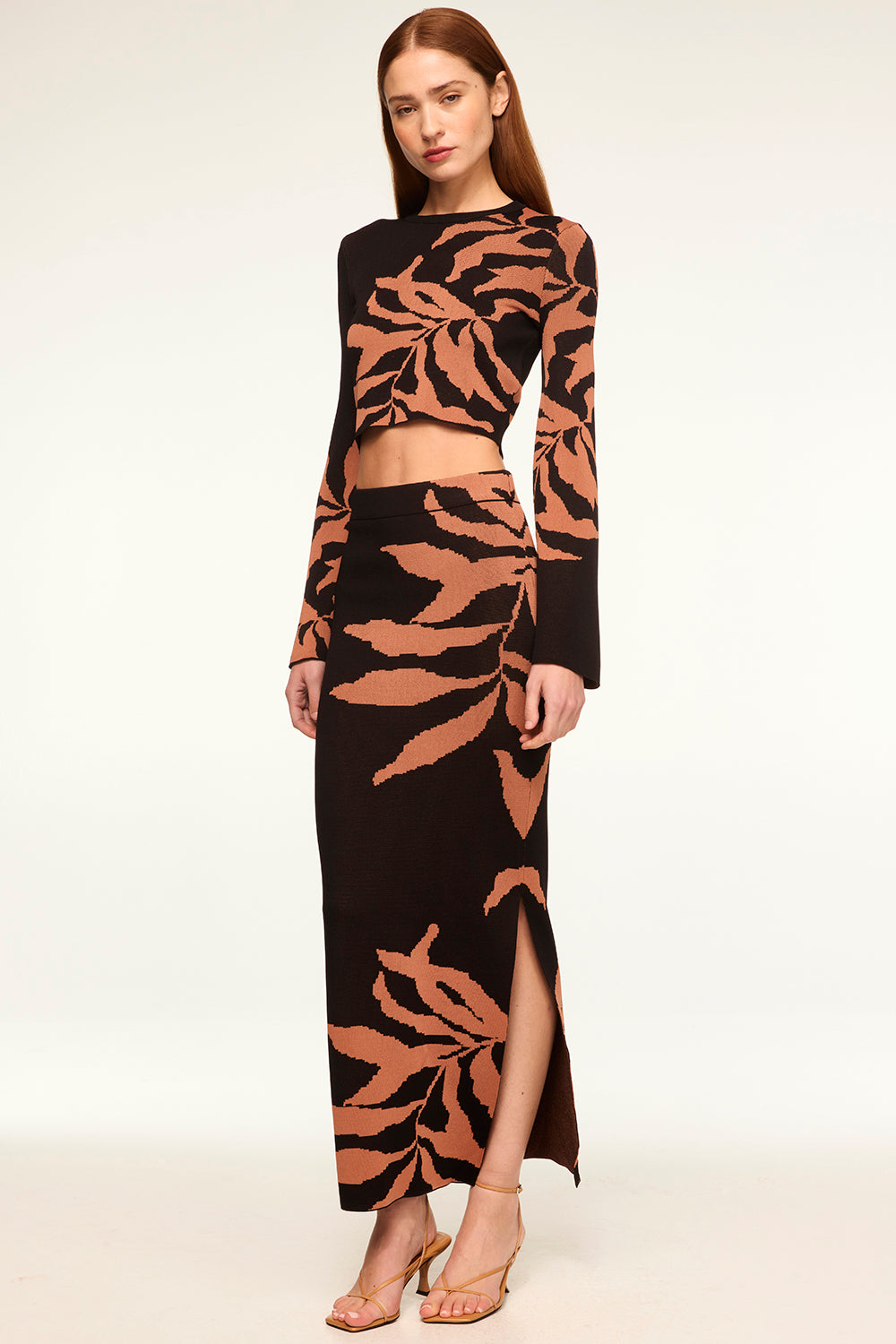 Our ankle-grazing Fira knit skirt features a botanical fern motif. This body-conscious pencil skirt has a slit in one leg and a banded elastic waist. This flattering stretch knit pairs perfectly with the matching Amila top or Joana cardigan.
