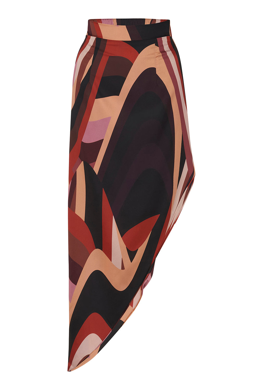 Franco is an asymmetrical skirt cut from our gorgeous Canyon Stripe satin. Featuring a flat front waistband with flattering darts and a covered back elastic waist. Pull on style. The longest point hits around the ankle and the shortest point hits at the mid thigh. Pair with the coordinating Jessie top for a chic set or throw on a cropped sweater and knee-high boots when the temperatures start to drop.