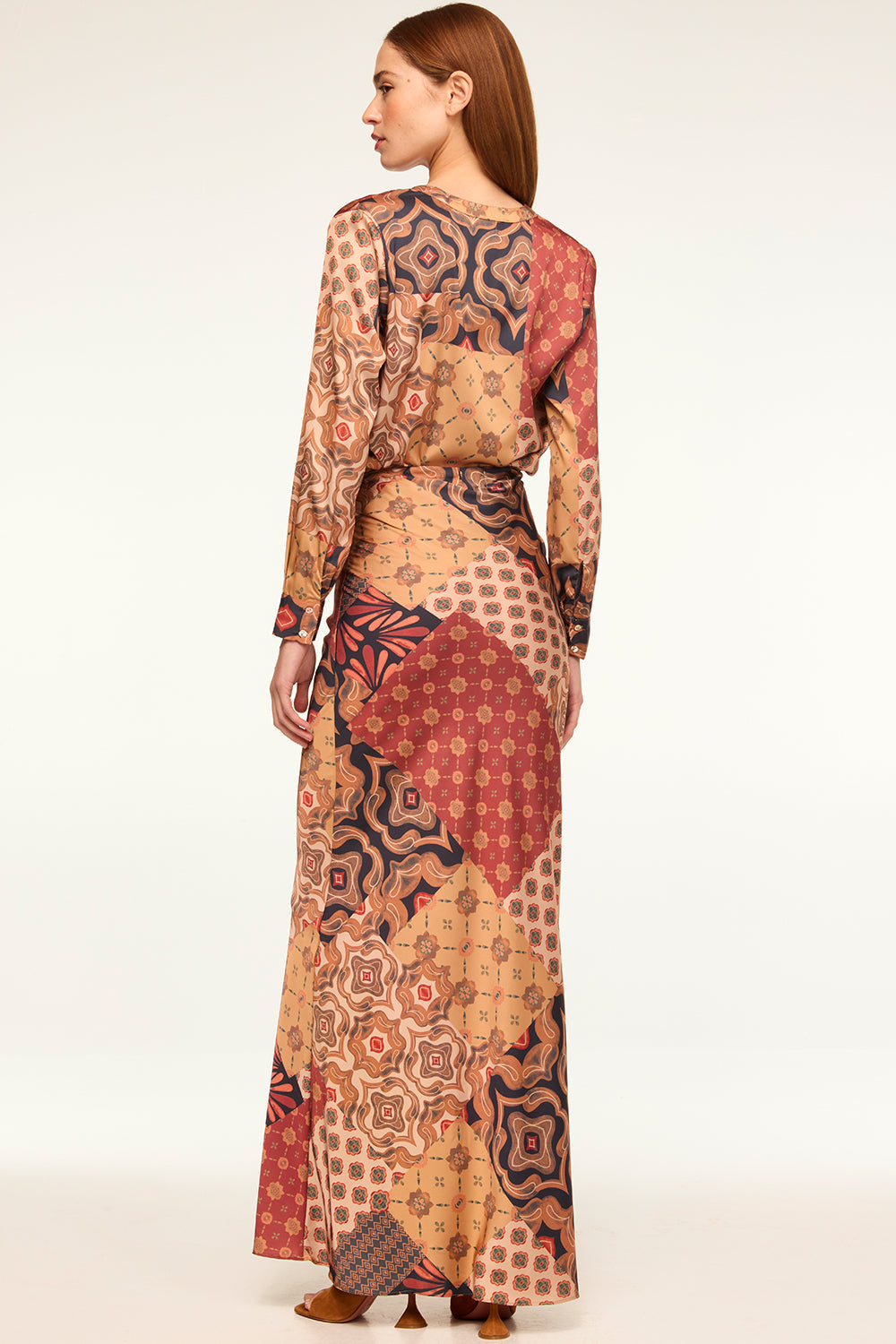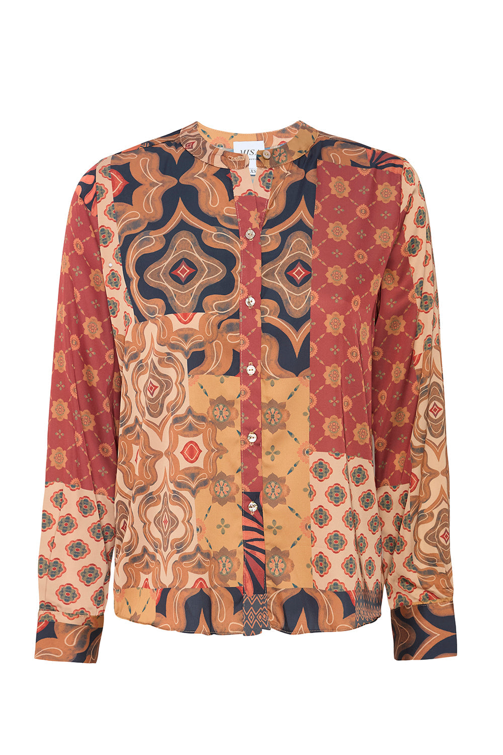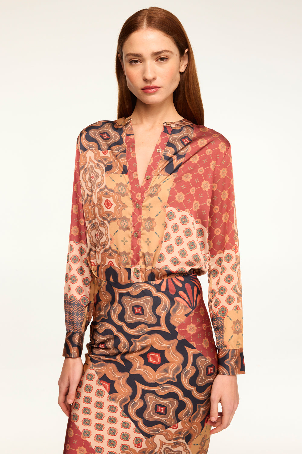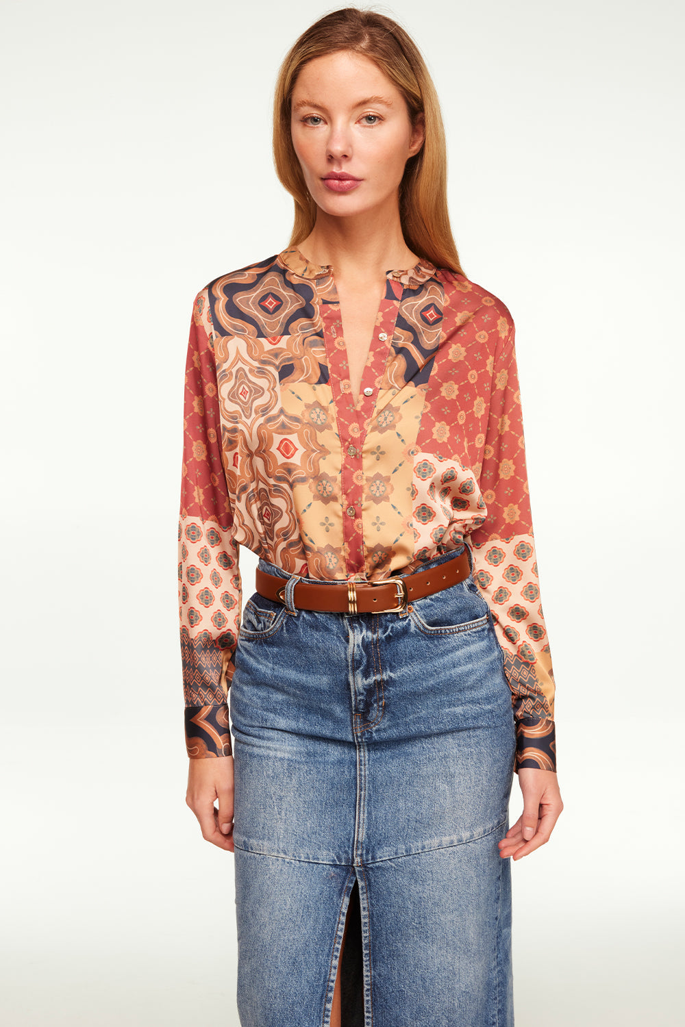 Our Frankie top is a collarless easy button-front blouse cut from our Surreal Patchwork printed satin. Long sleeves with double-button cuffs. Wear with the coordinating Sierra skirt or dress down with a pair of your favorite denim.