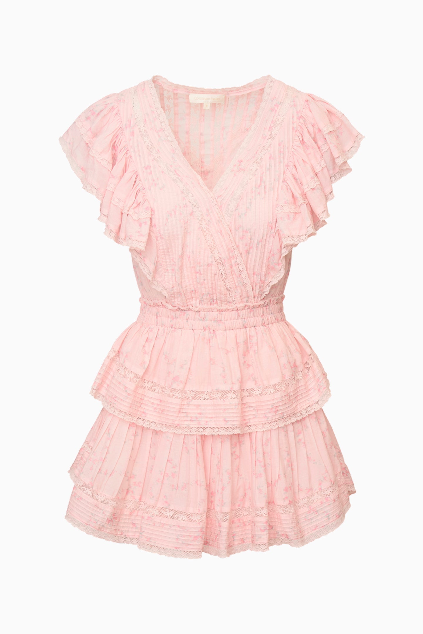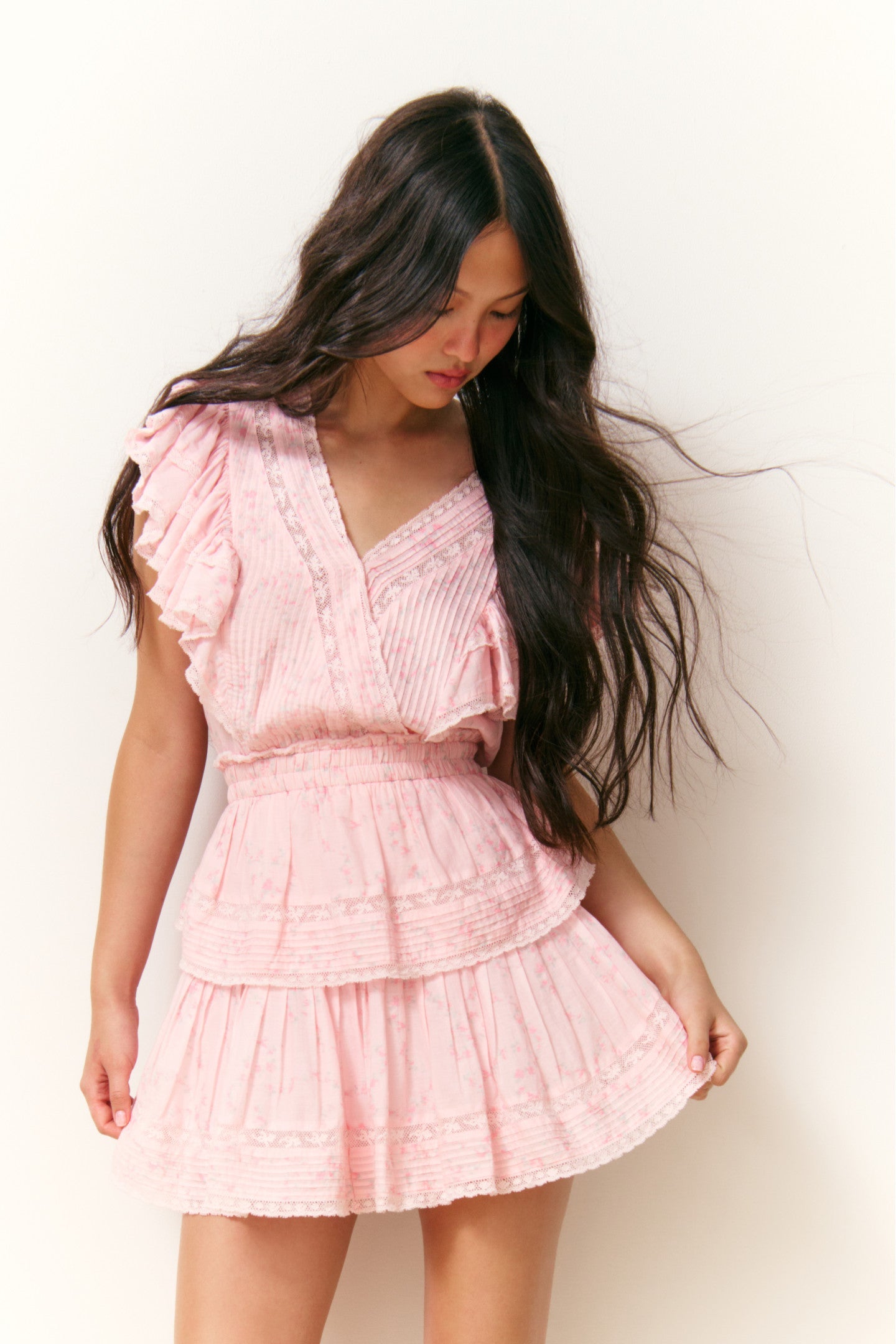 Our Gwen Dress is a sure favorite in cotton with lace embroidery details. This short frock has a faux wrap top, which forms a deep v neckline. Shirred ruffles line the outer edges of the shoulder and bodice, forming flutter sleeves. The skirt is constructed just like our signature Ruffle Mini—with an elastic waist and two flounced tiers.