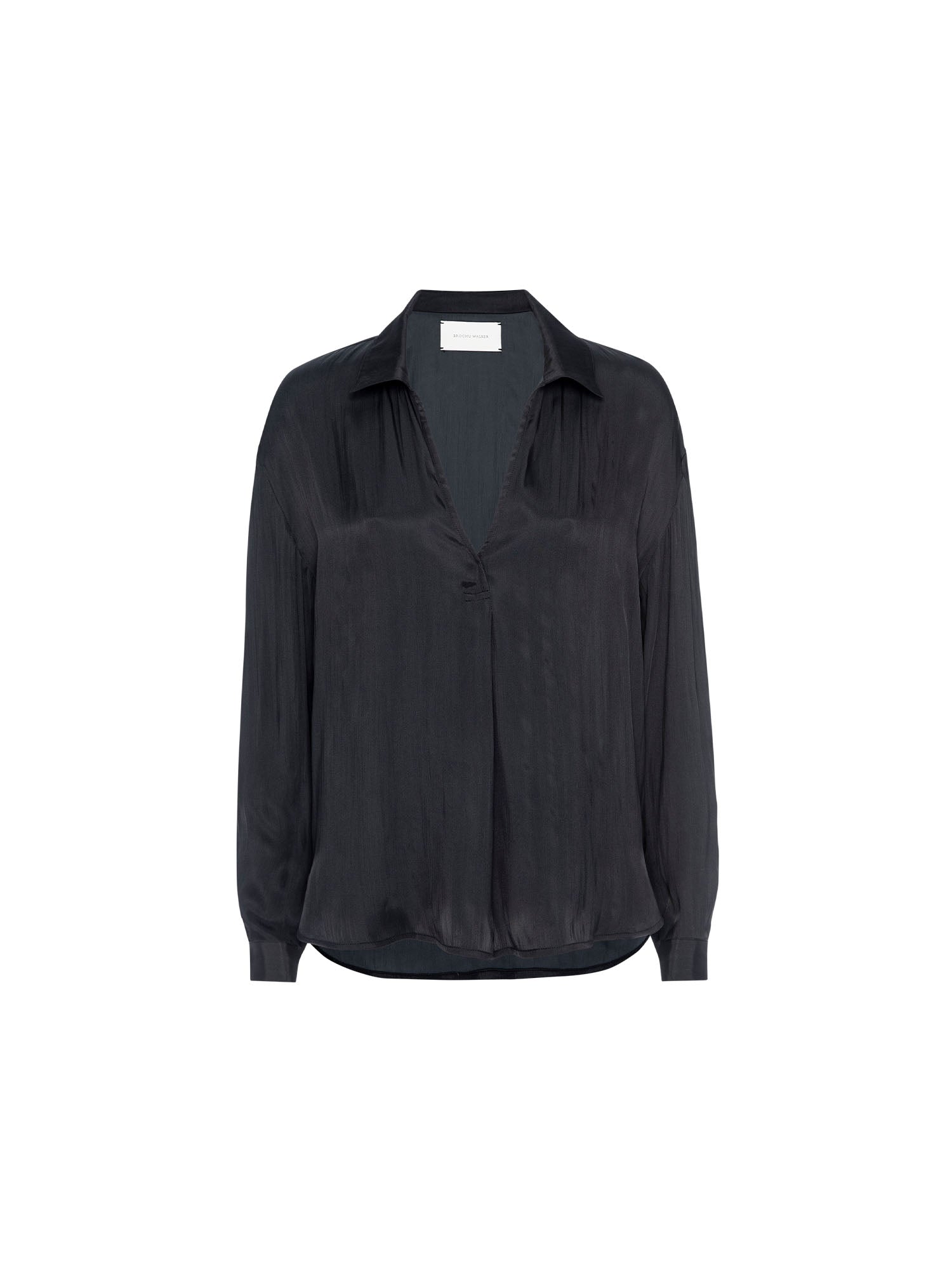 In a modernized popover silhouette, that features a collared V neckline dropped shoulders, and a slight shirttail hem accented by inset gussets at the side seams, our Hailee Blouse is everything feminine. This relaxed fit, popover crinkled satin blouse gently drapes as it grazes your body, while the deep V neckline makes it perfect for all your special occasions.