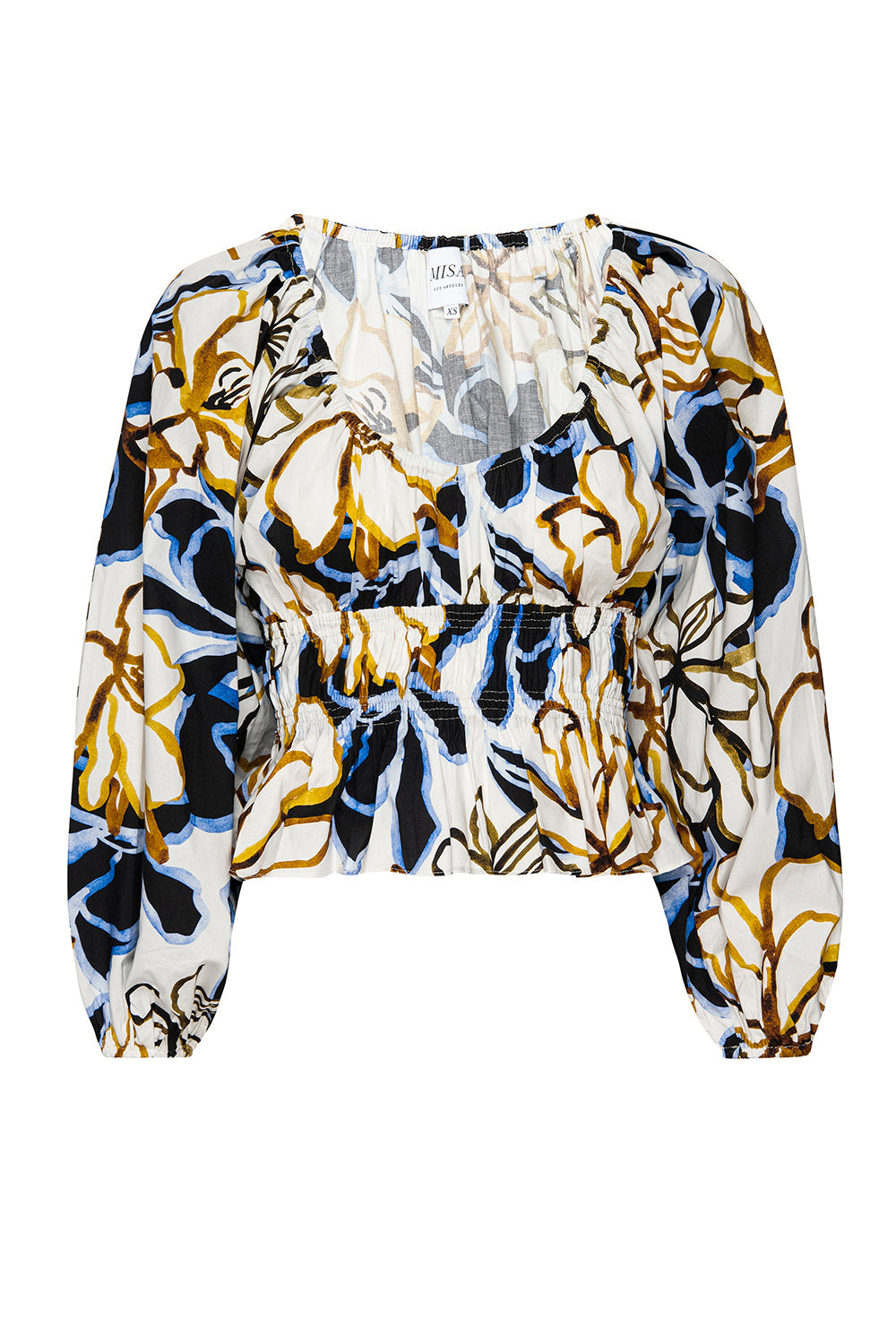 Halia is a versatile new top cut from a breezy Bold Blooms cotton poplin and featuring long blouson sleeves with elastic cuffs that can be worn on or off-the-shoulder for added versatility. A deep v neckline and elasticized ruching for a flattering waist detail. Poplin hem. Pair with jeans or the coordinating Elna skirt.