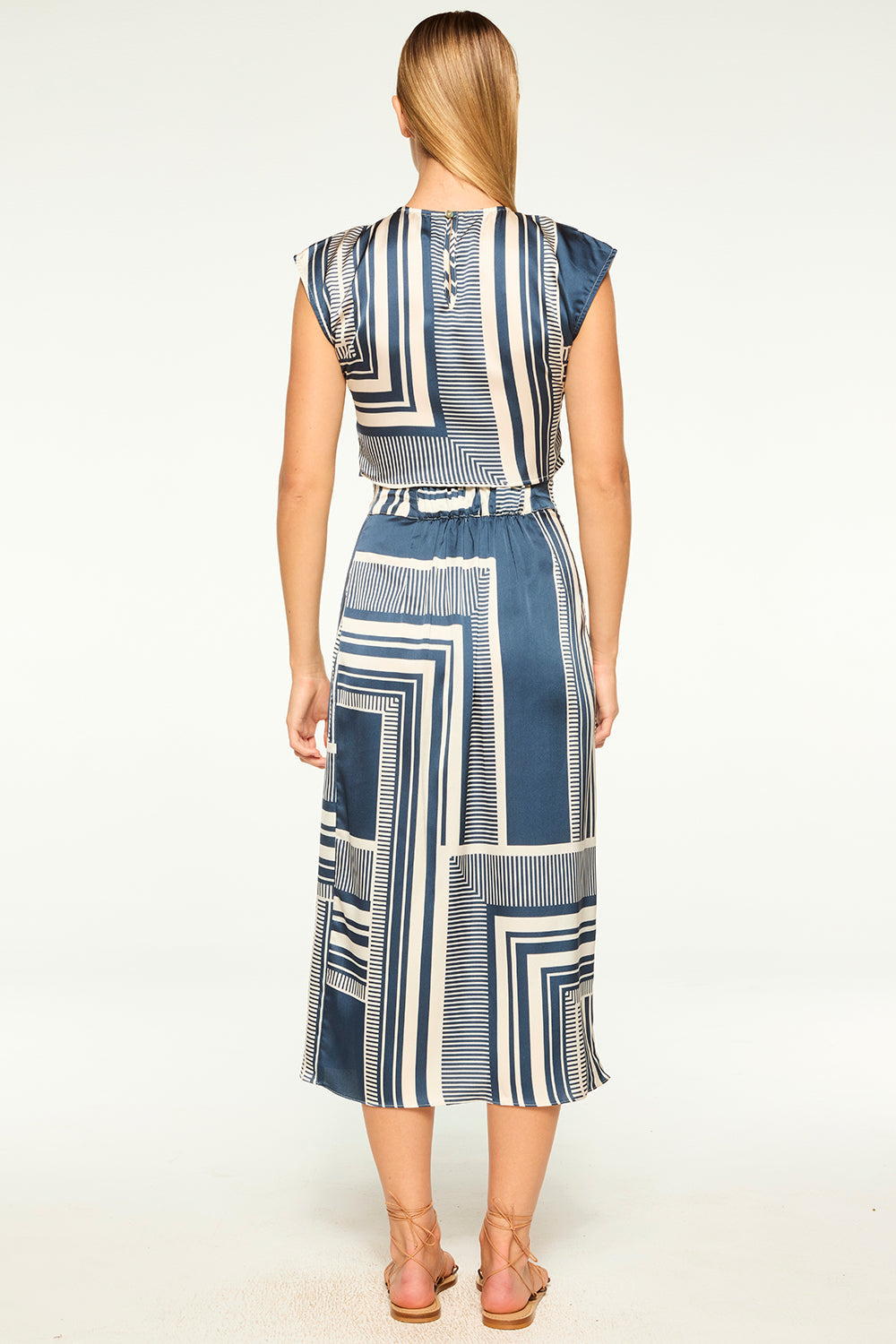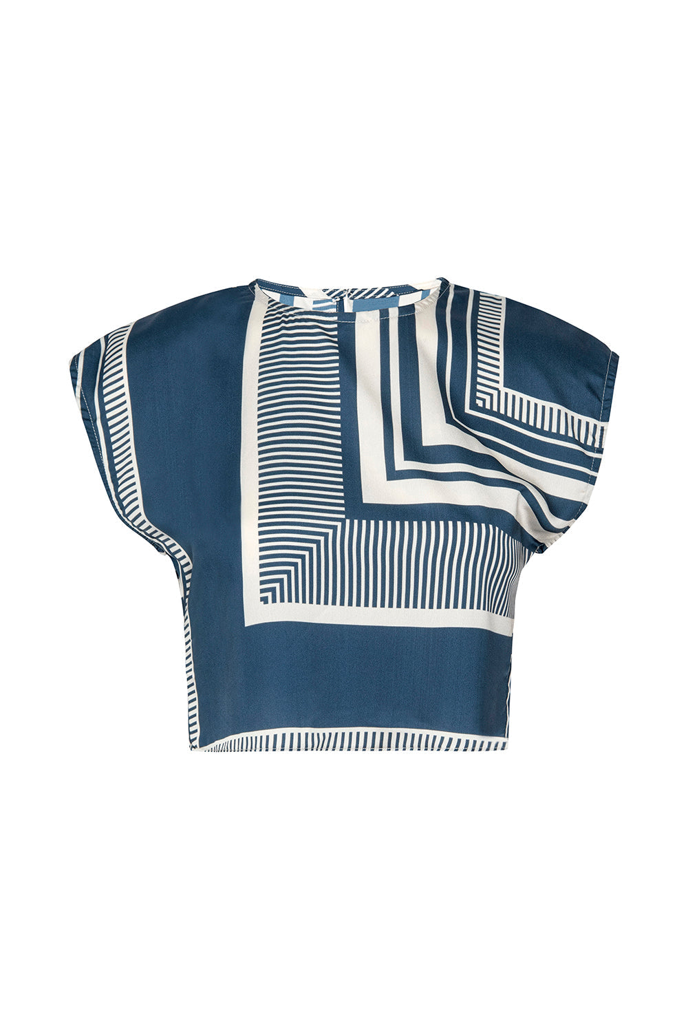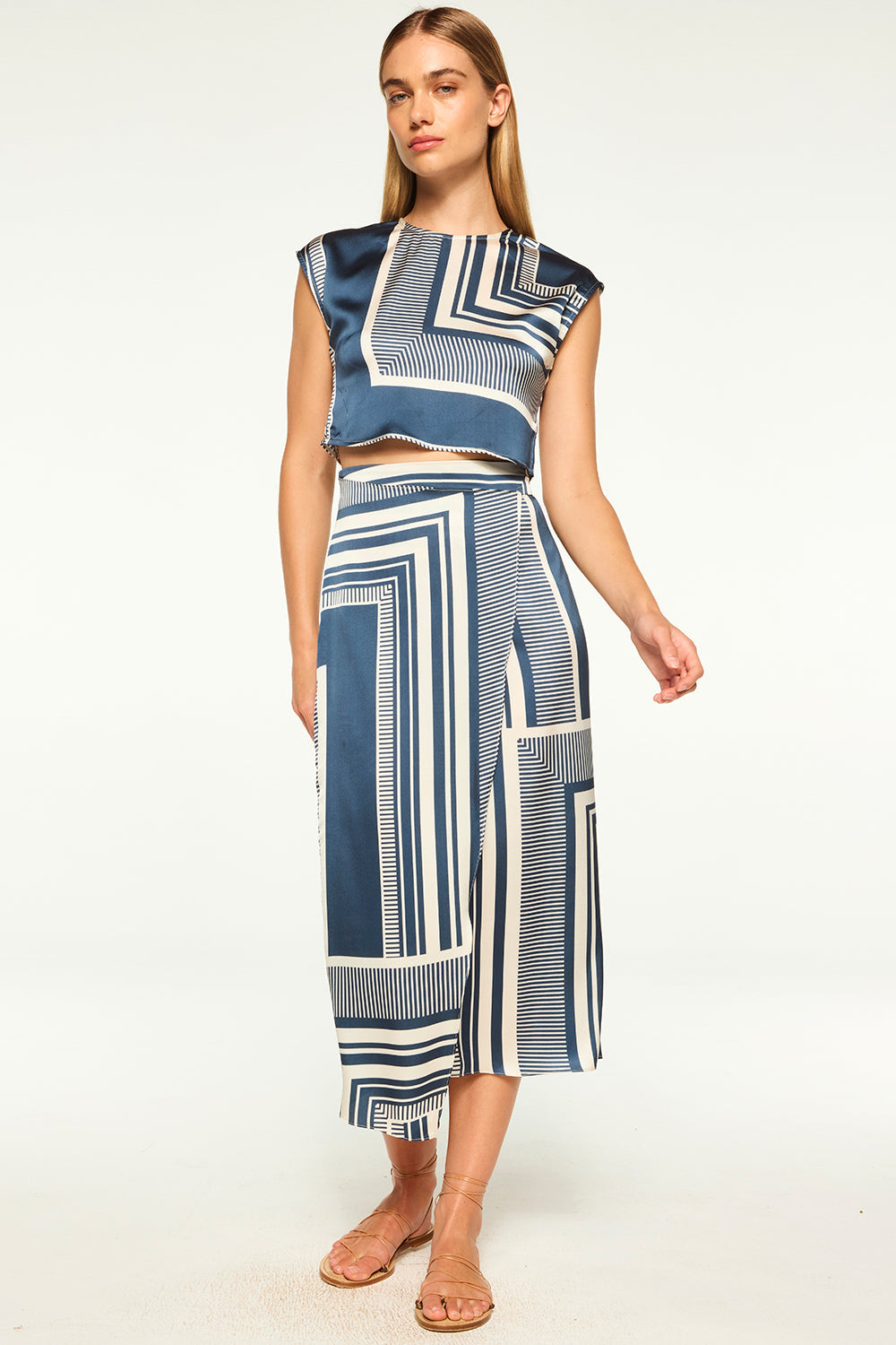 Hara is a sleeveless, cropped silhouette cut from our modern linear geo printed satin. Pullover style with a keyhole back-button closure. Dress down with jeans or pair with the coordinating Nilla skirt or Reshma pant for a head to toe look.