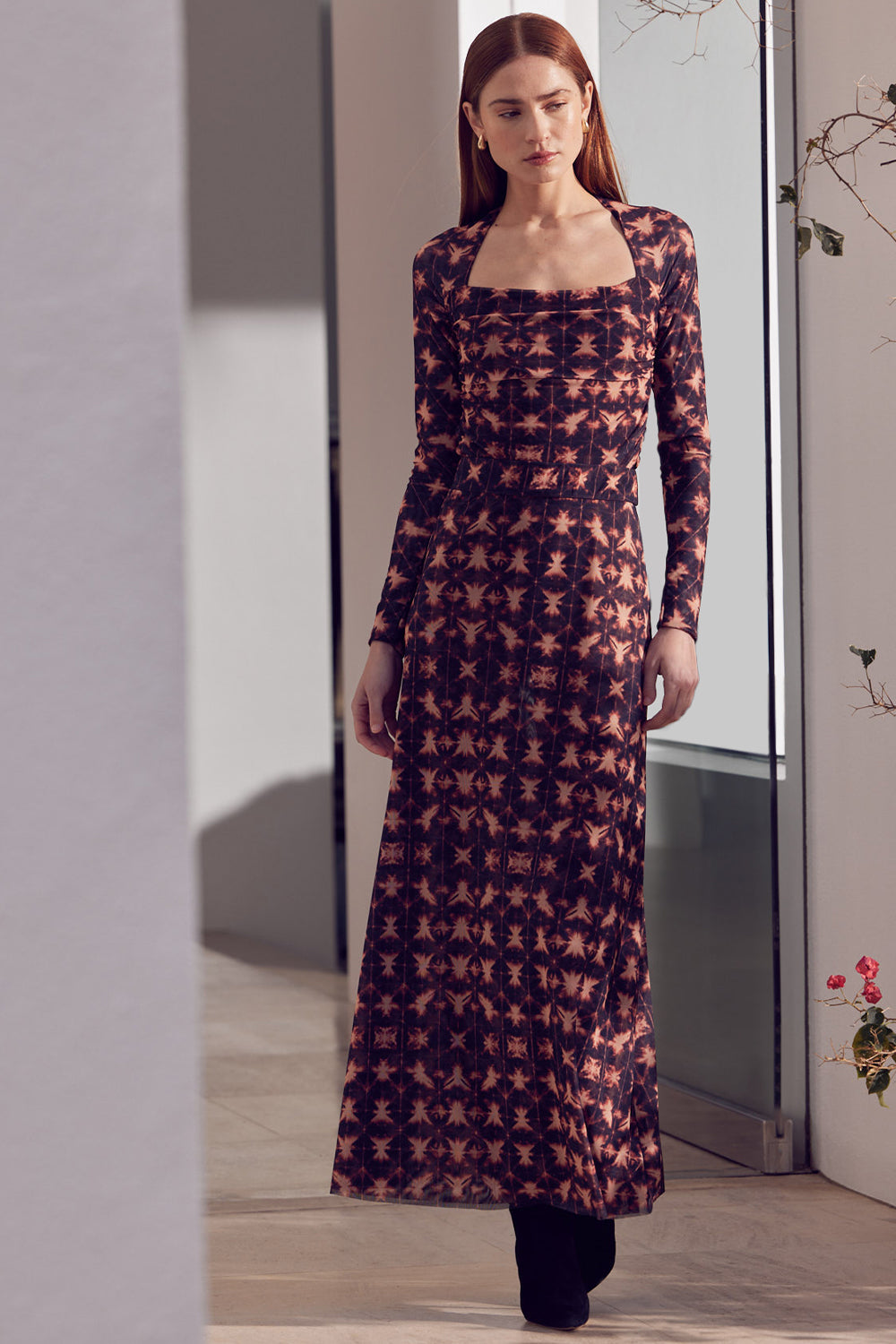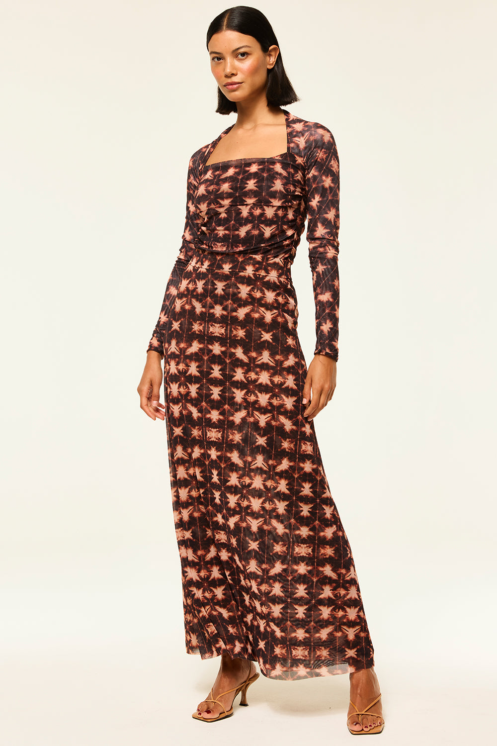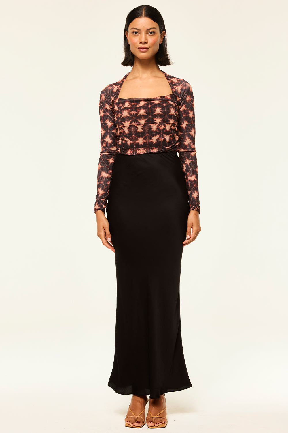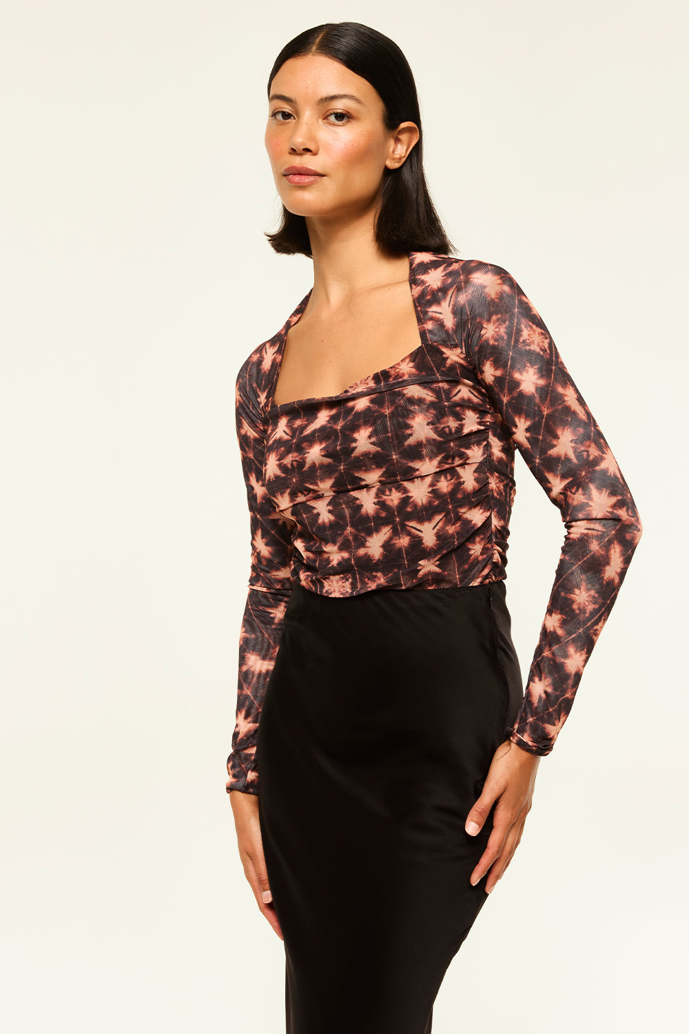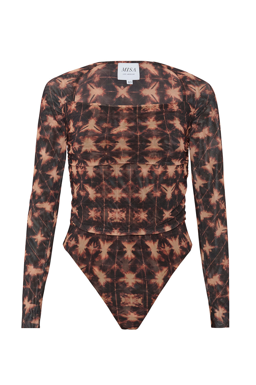 Our newest Hayworth bodysuit is back for fall in a gorgeous Angel Glow tie-dye print. Long sleeves and a flattering square neckline show off your collarbone and ruched stretch mesh hugs and flatters your curves. A snap-button bottom closure and thong back. Pair with your favorite pair of jeans or with our Sierra skirt in black. For a standout look wear with the coordinating Ekat skirt.