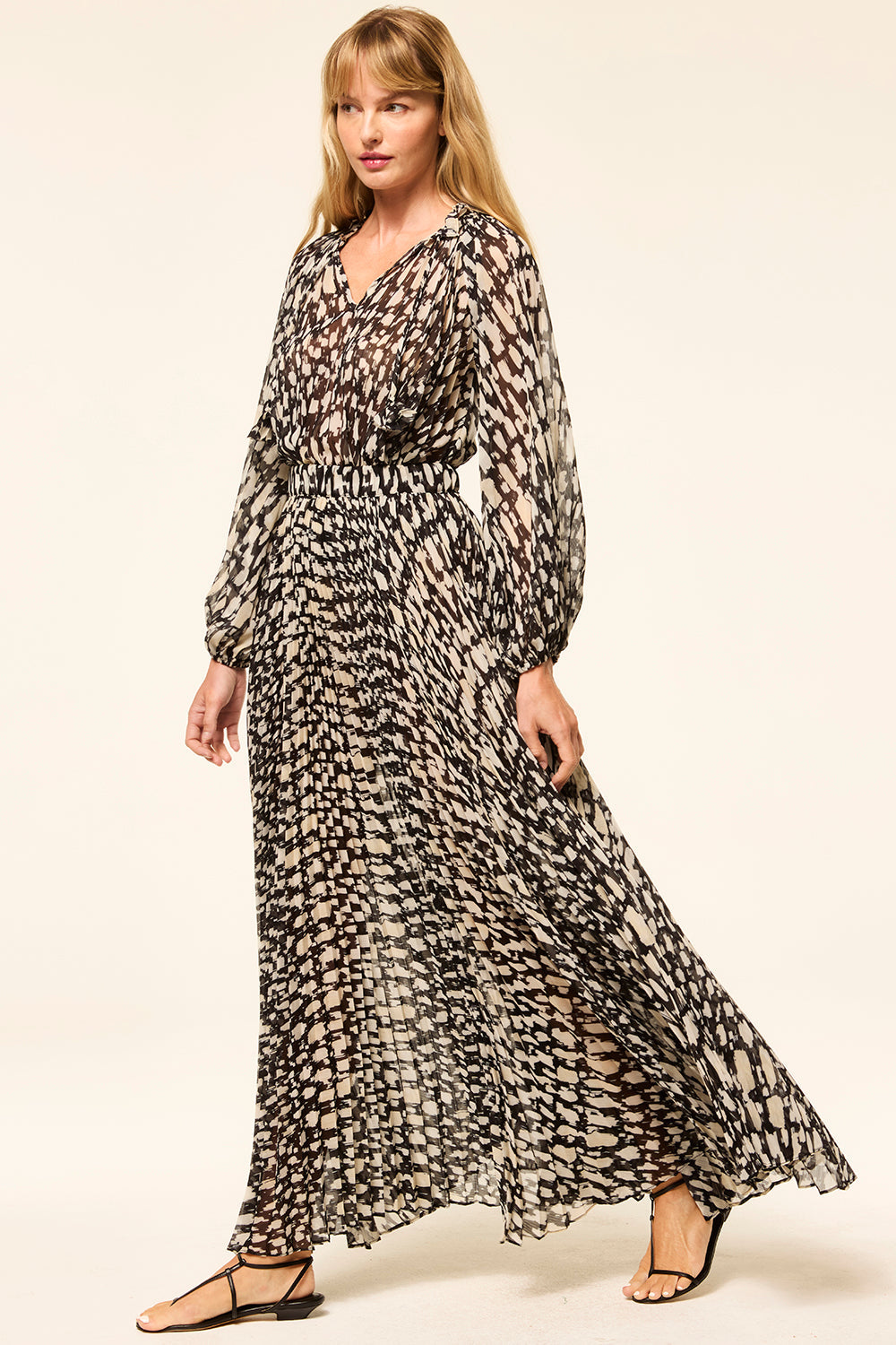 Ilona is a flowing maxi skirt cut from our pleated black and white Abstract Geo chiffon. Featuring a flat band waist with elasticated back. Double lined with a slightly staggered hem. Pair with the coordinating Rissa top for an effortless bohemian-inspired set.