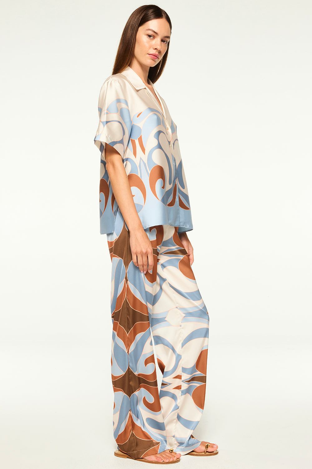 Isara is a straight leg pant cut from our graphic Swans print satin. A mid rise with flat front and elasticated back with hidden side zip. Hidden side slit pockets. Pair with the coordinating Solange top for a chic set.
