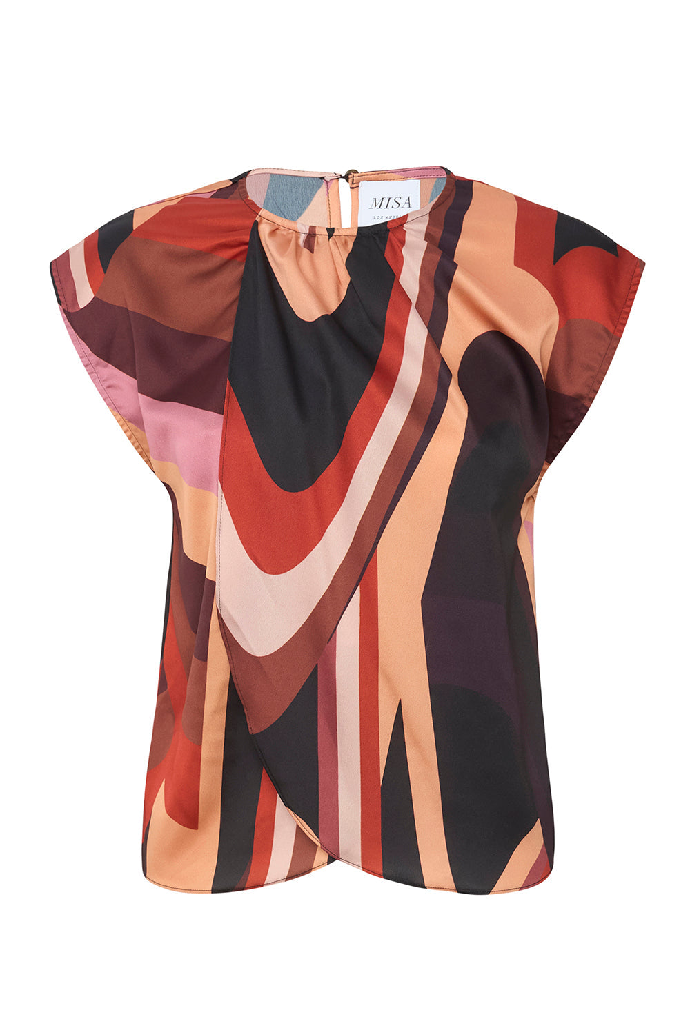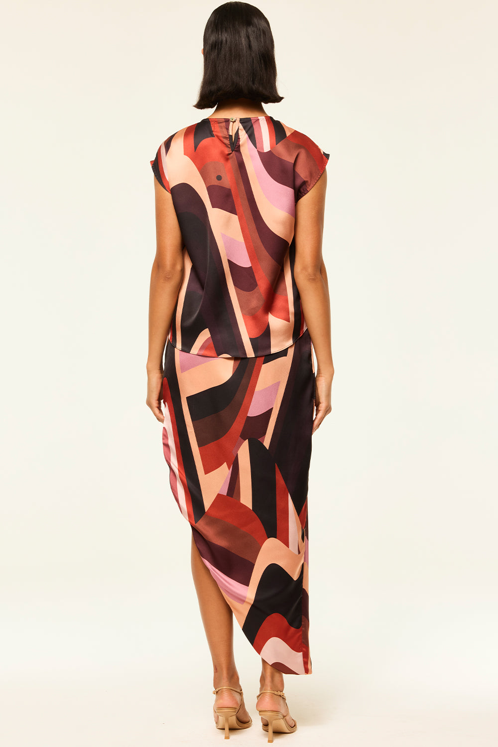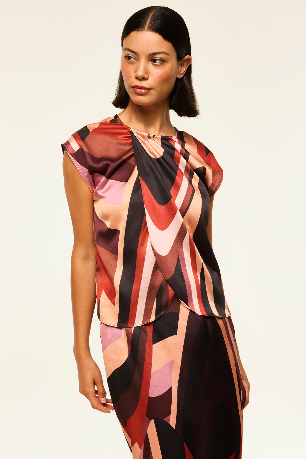 Jessie is a cap sleeve high neck top cut from our Canyon Stripe satin. Featuring a high neckline and crossover front detail. Pair this style with jeans or with the coordinating Franco skirt for a chic fall set.