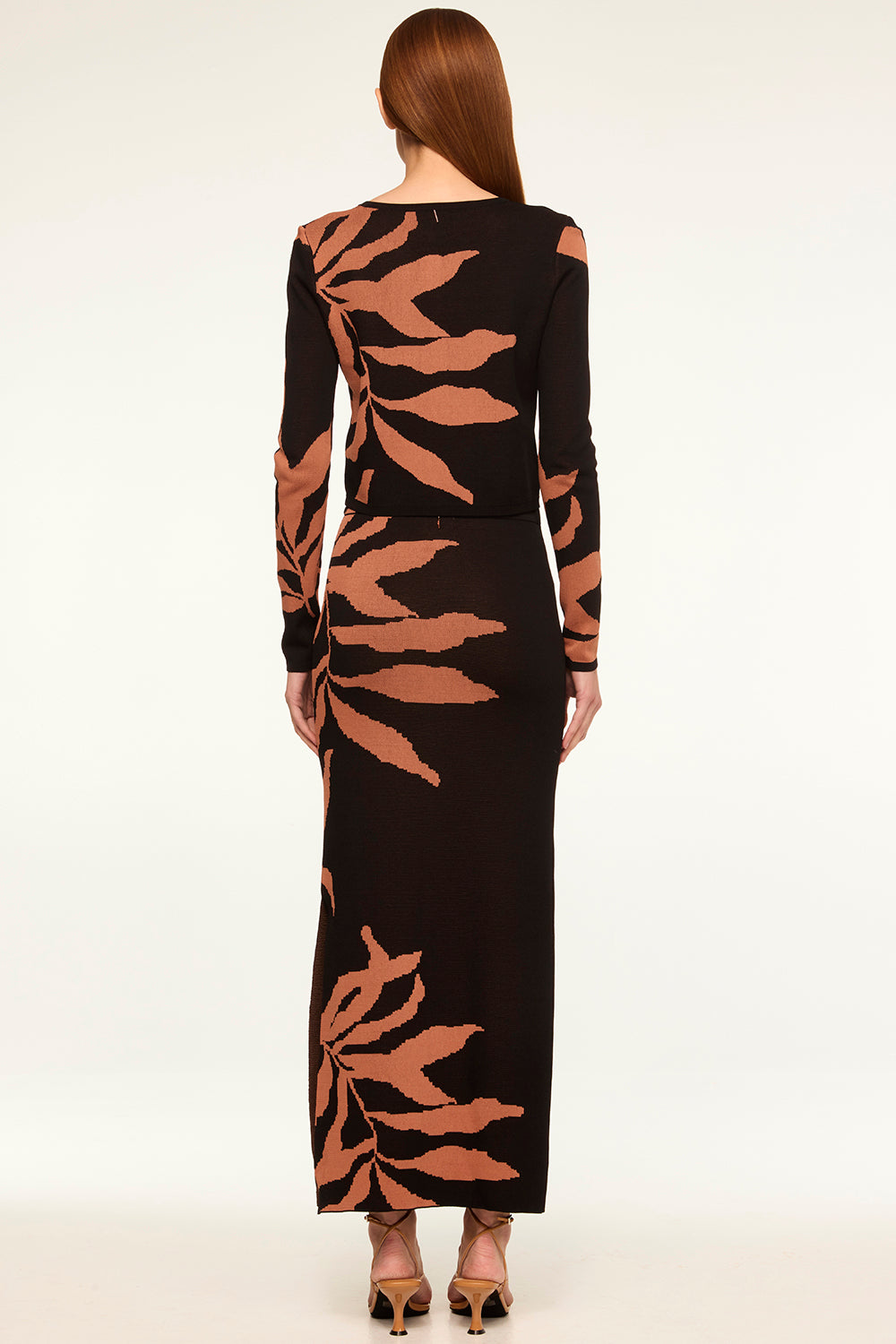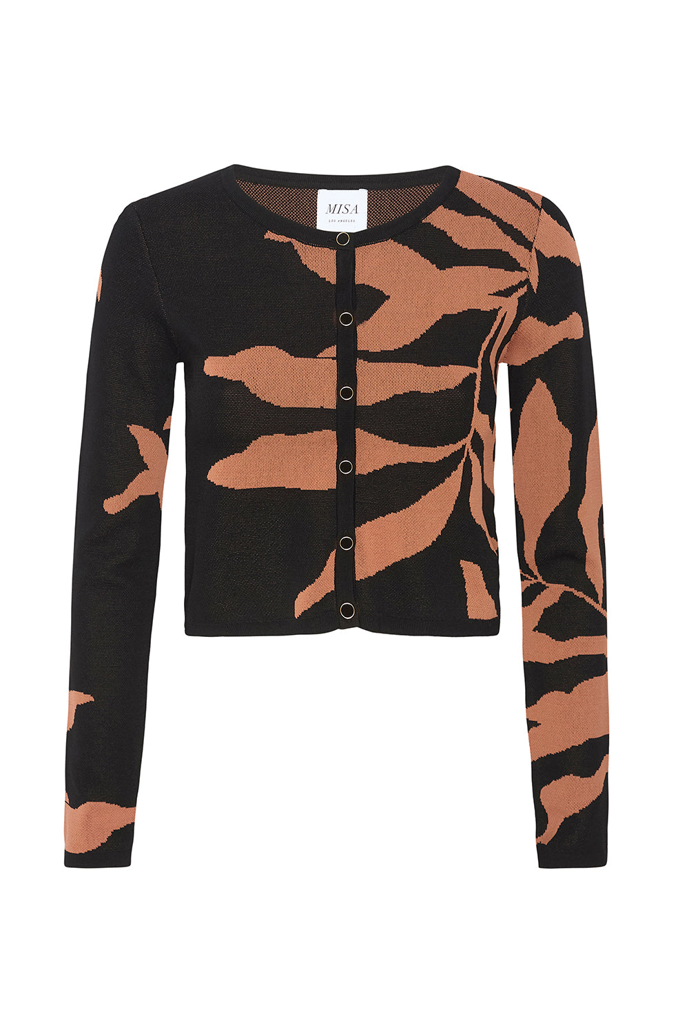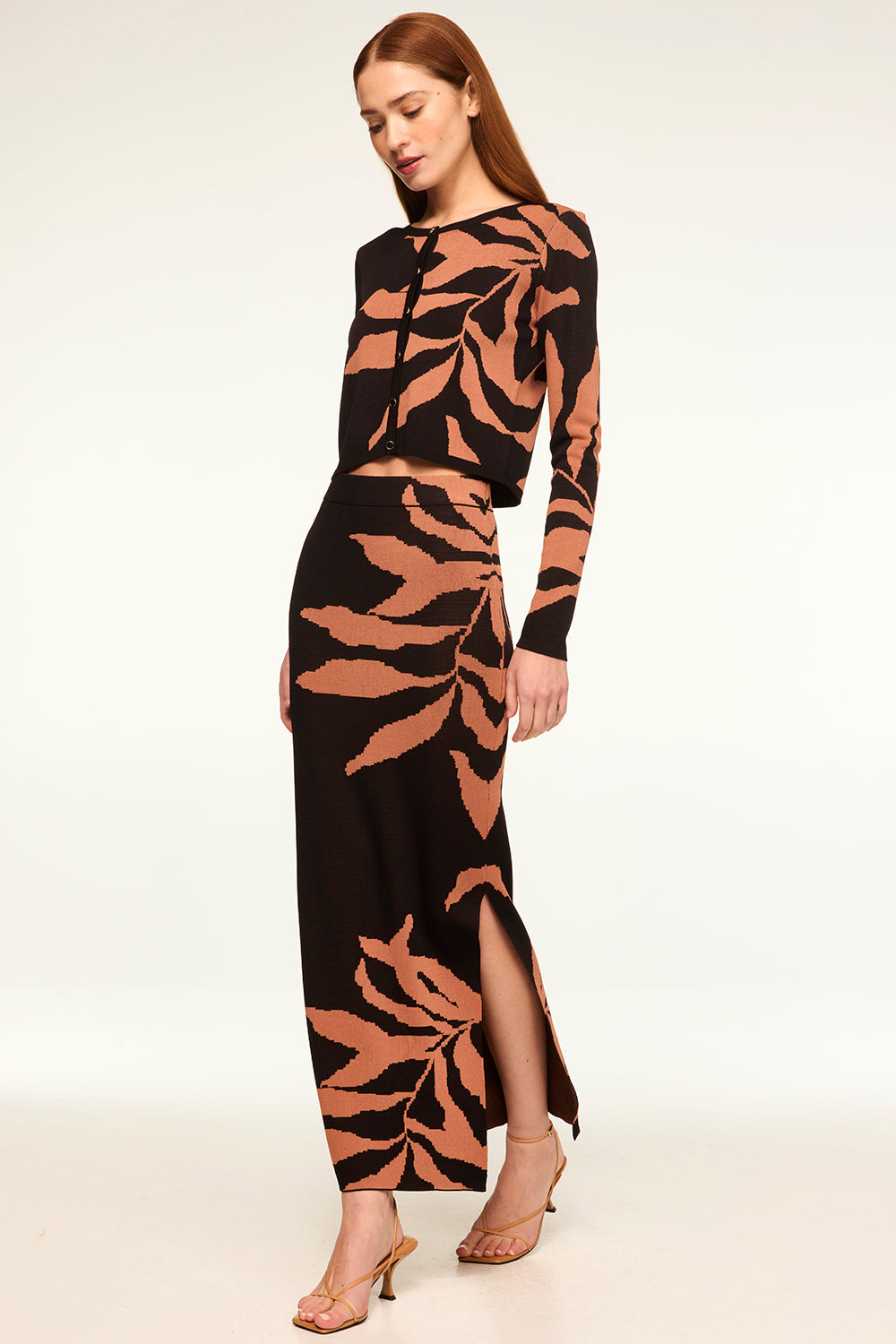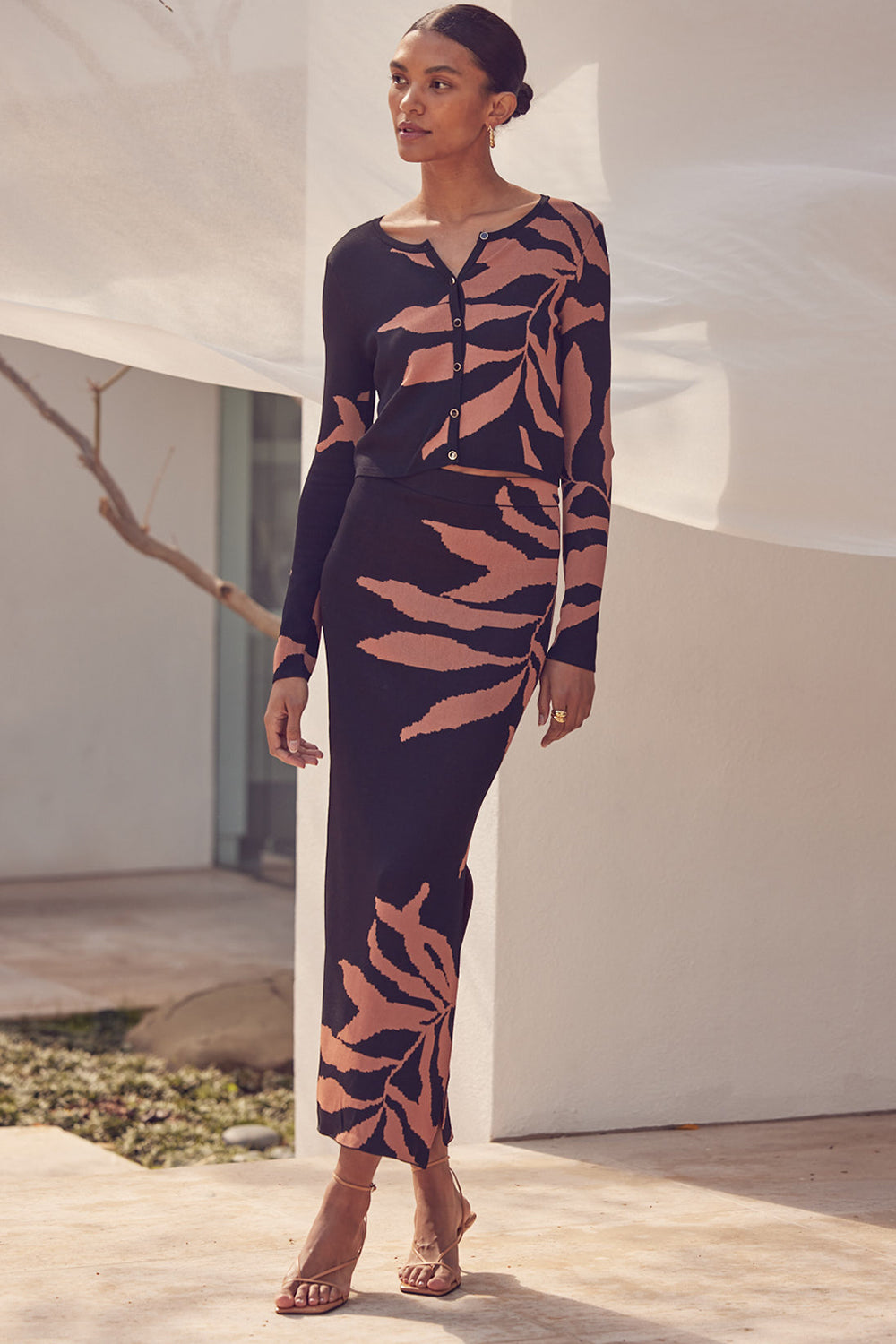Our Joana cardigan is a beautiful jacquard knit in our Fernal Glow print. A fitted, slightly cropped silhouette fully buttons at the front and is finished with tonal, black enamel buttons. Wear with jeans or pair with the matching Fira skirt.