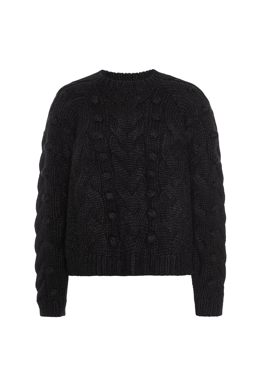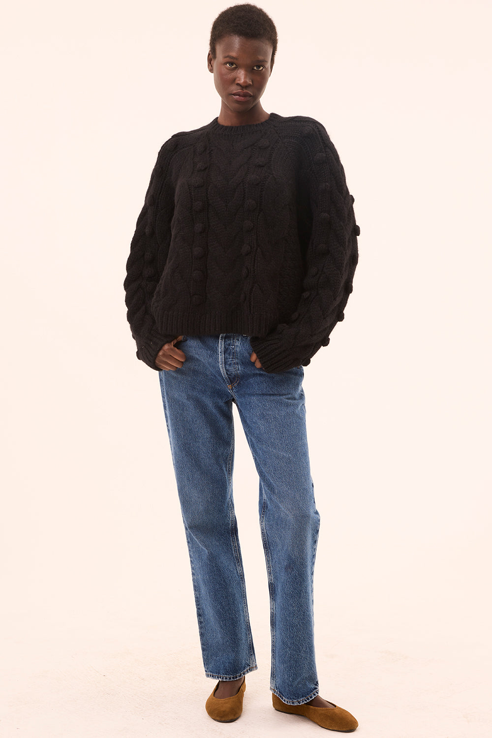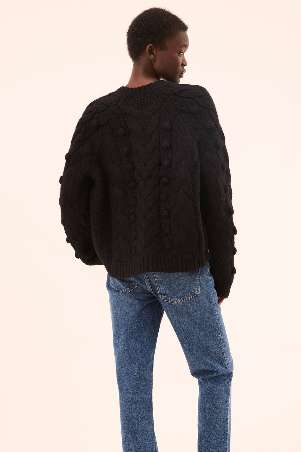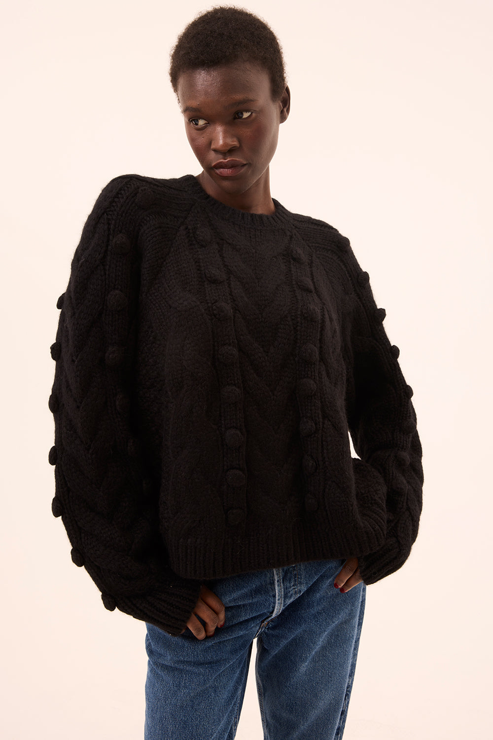 The Julissa pullover is made from soft alpaca wool with a cozy cable knit and playful pom-pom details. It features a curved hem that hits at the hip, along with ribbed cuffs, hem, and neckline. This shorter, relaxed-fit style is perfect for layering or wearing on its own.