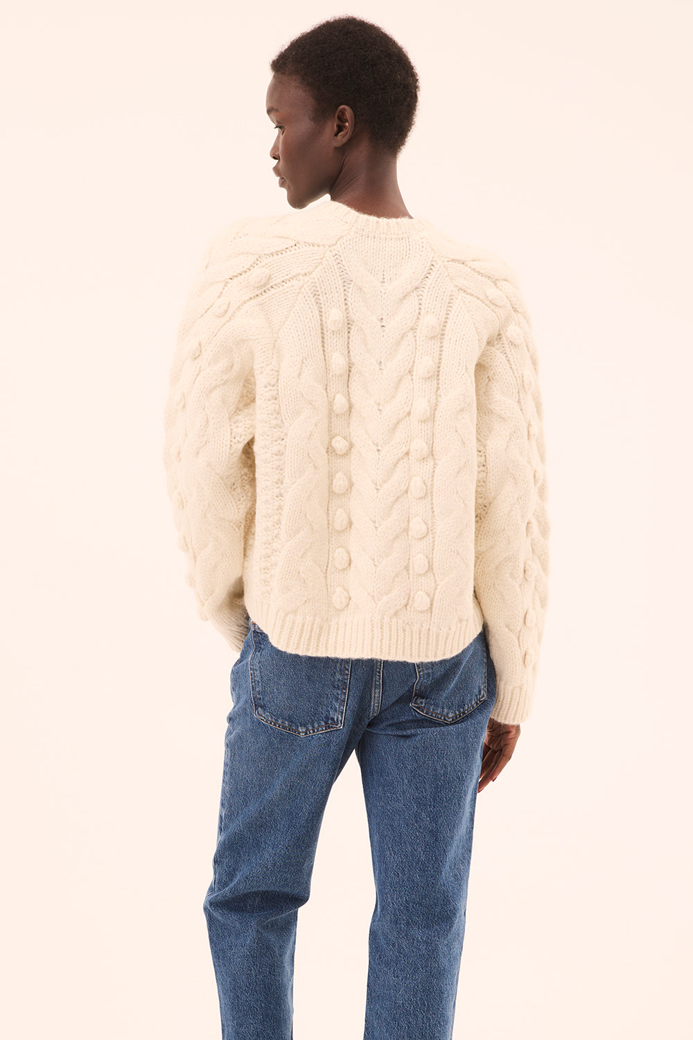 The Julissa pullover is made from soft alpaca wool with a cozy cable knit and playful pom-pom details. It features a curved hem that hits at the hip, along with ribbed cuffs, hem, and neckline. This shorter, relaxed-fit style is perfect for layering or wearing on its own.